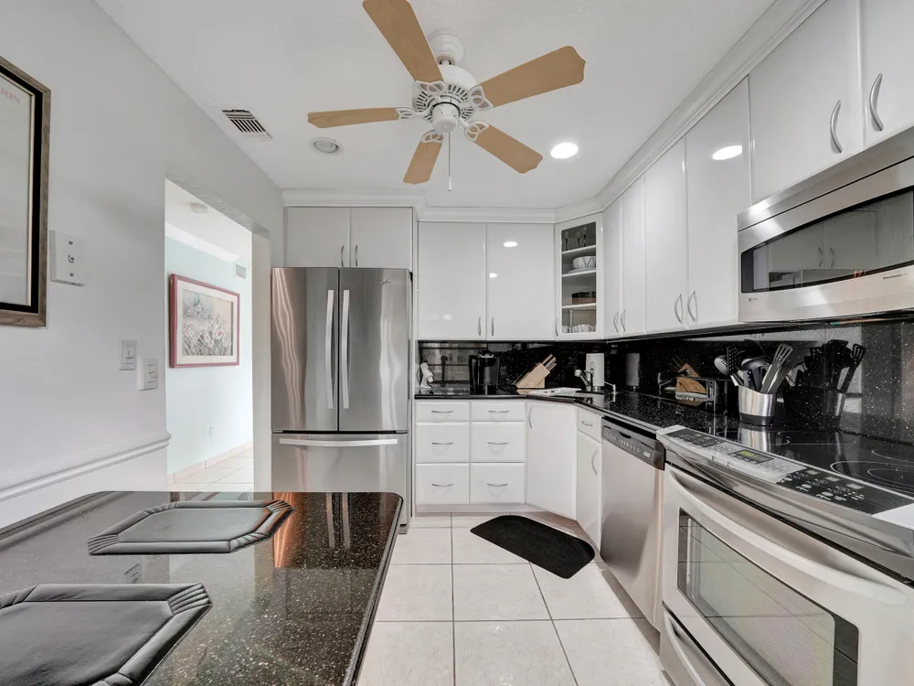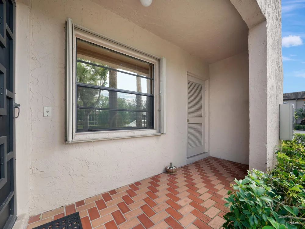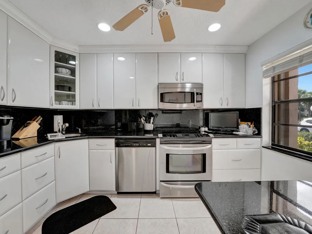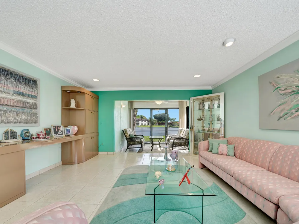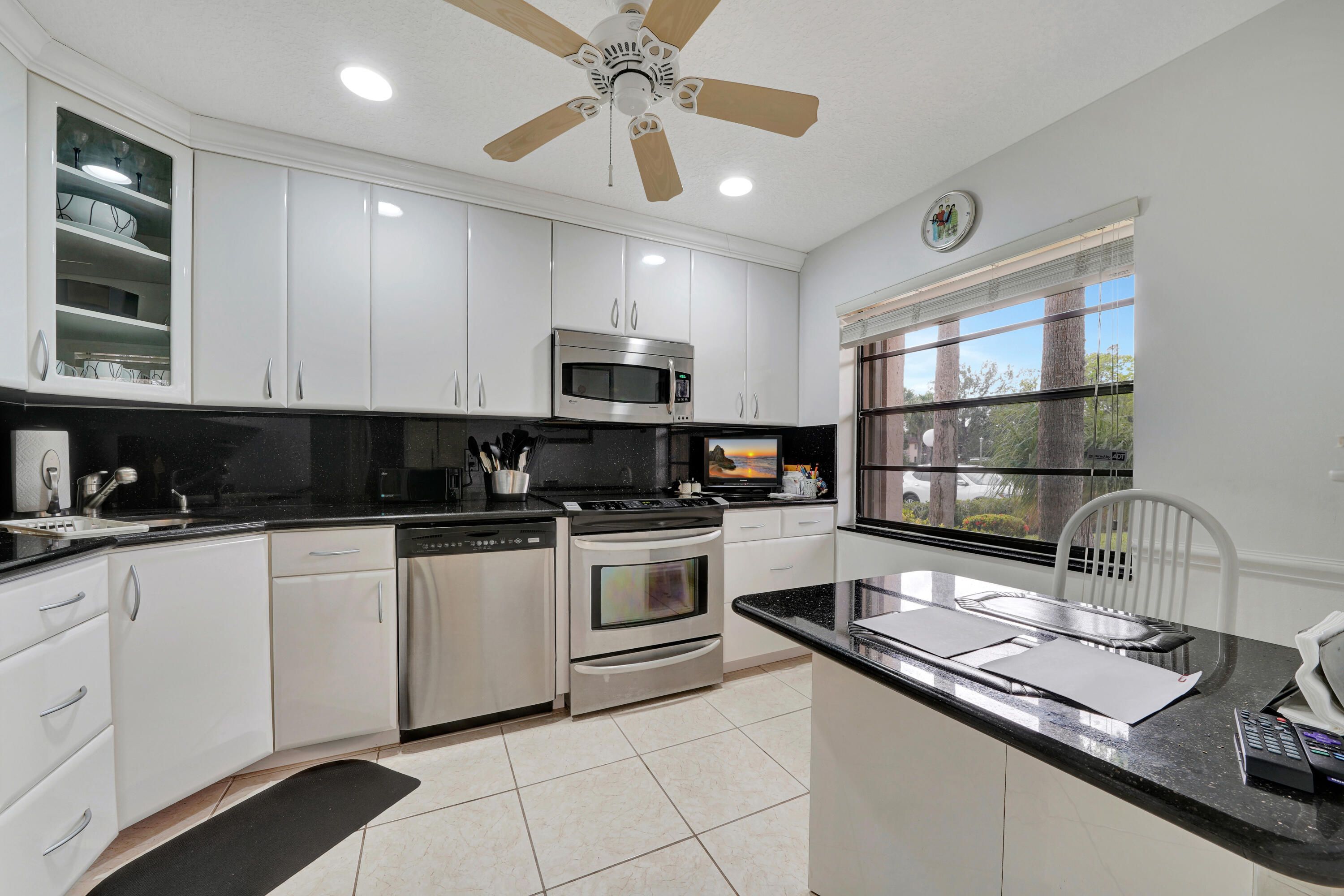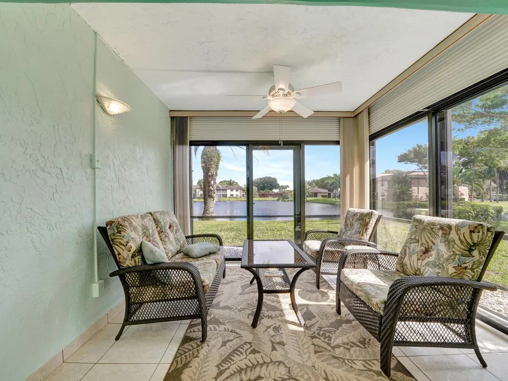 Enjoy stunning lake views from this bright first-floor corner unit with a glass-enclosed patio. Benefit from convenient assigned parking, quick pool access, accordion shutters for protection, & the ability to BBQ outdoors. Inside, find granite countertops, lightly used appliances, updated flooring, crown molding, & a stacked washer/dryer. Live securely in Boca Lago's gated, non-mandatory country club 55+ community near shopping & major roads. Plus, a brand-new air conditioner was installed in October 2025 & new roof 2025. Don't miss the chance to live in comfort and style with spectacular views!