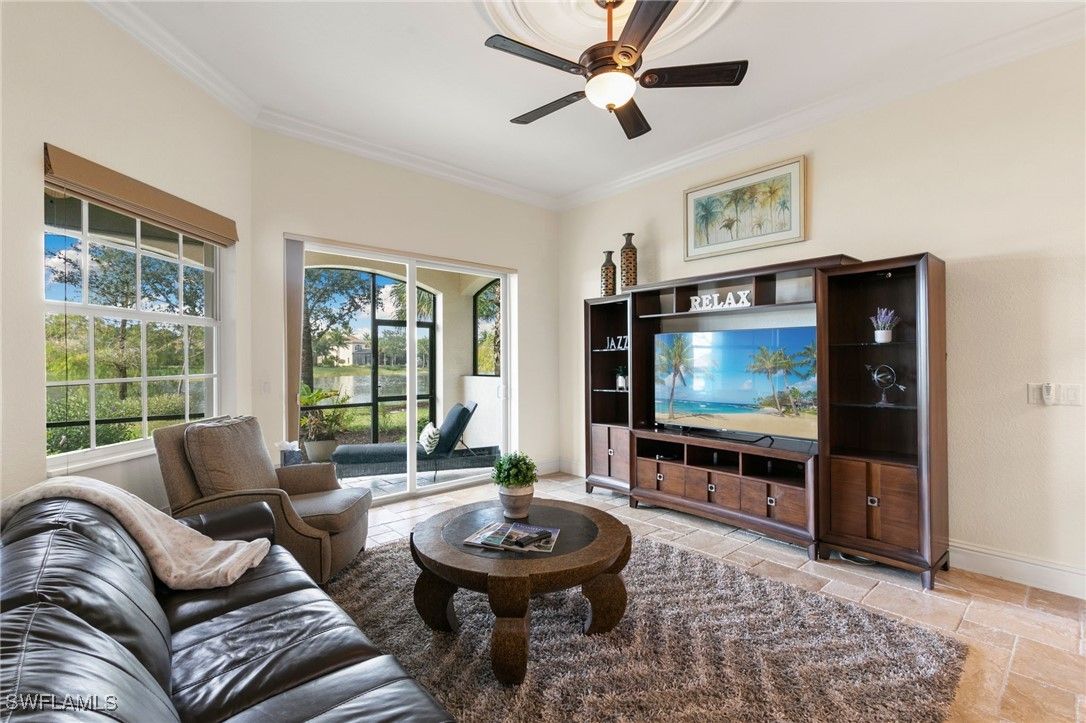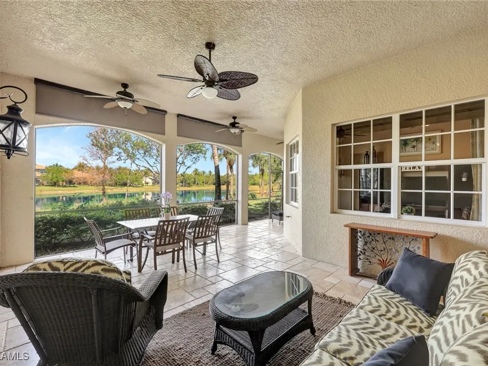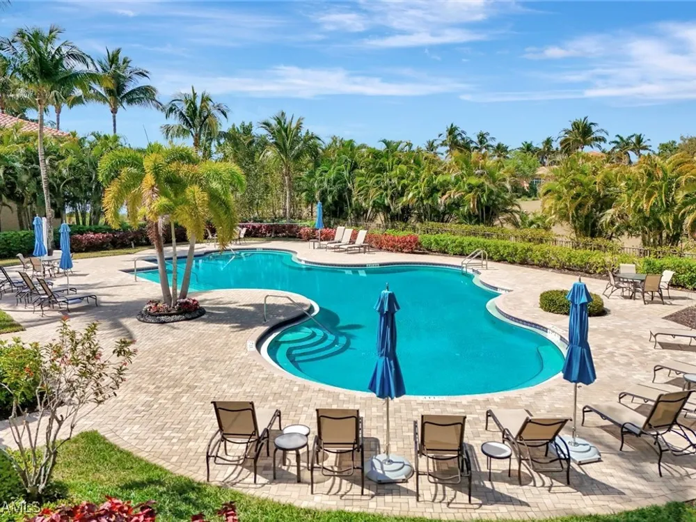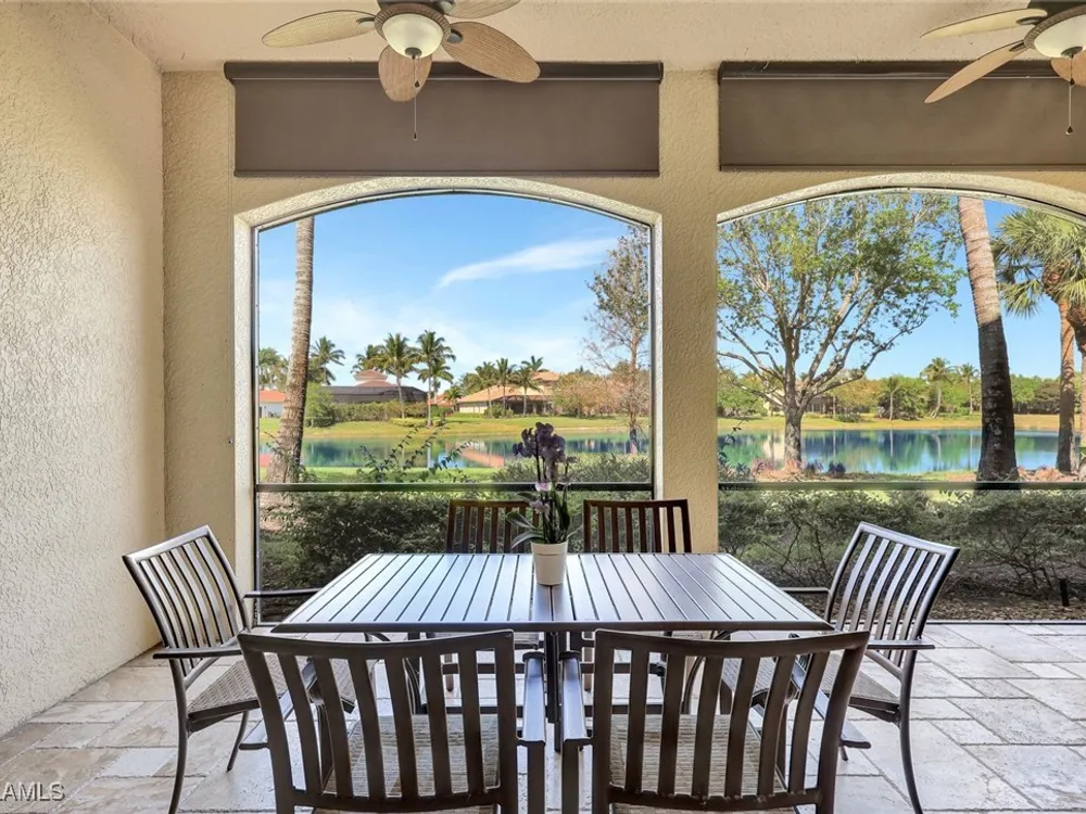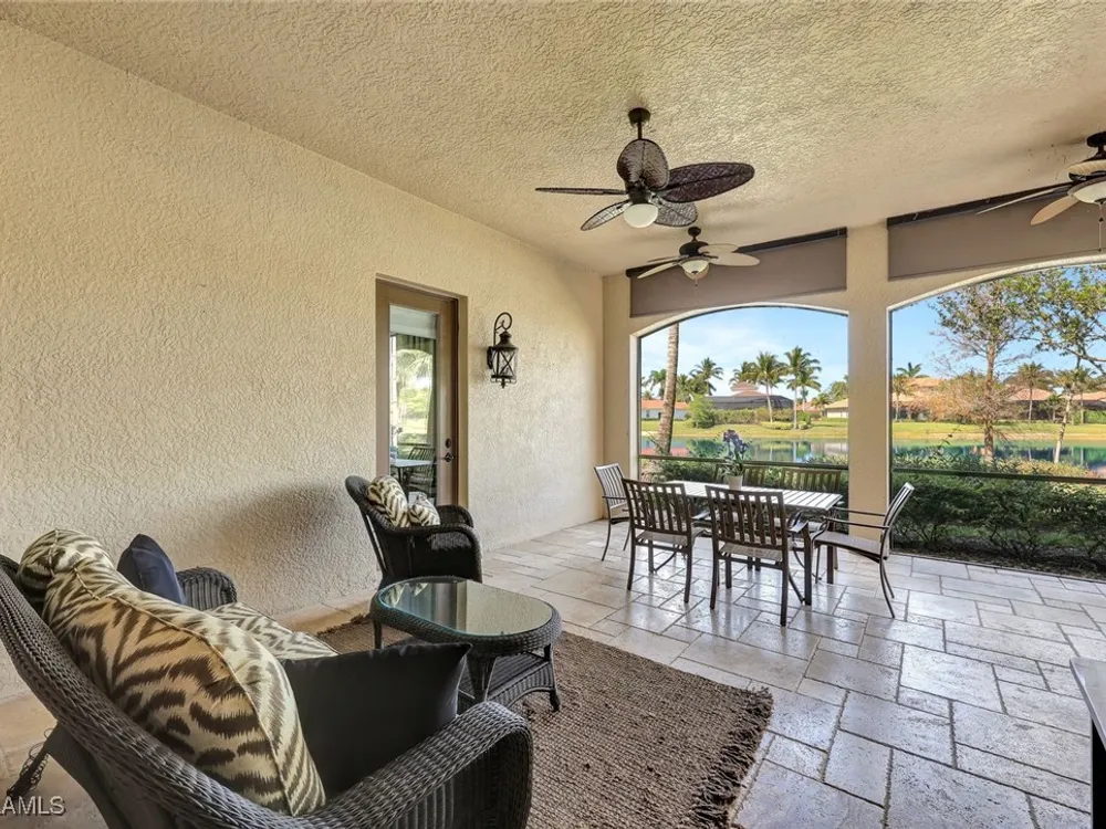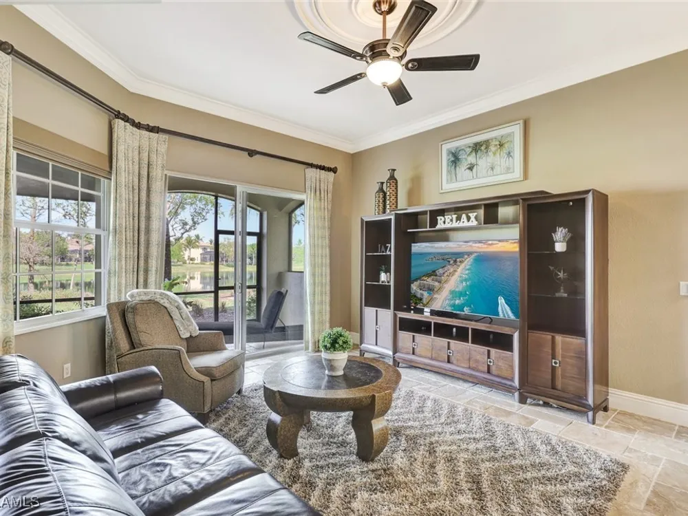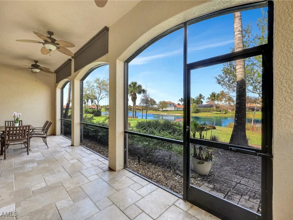 This stunning 3-bedroom plus den, 3-bathroom end-unit in Menaggio offers the epitome of luxury living with gorgeous water views. Boasting just over 2,900 square feet of elegantly furnished space and impeccably maintained, this residence is perfect for both entertaining and relaxing, featuring gorgeous travertine floors, a drop-down accent ceiling, and crown molding throughout. The oversized primary bathroom is a true retreat, complete with a large garden tub, a walk-in shower, and a bidet for added comfort. The spacious primary suite also includes expansive walk-in closets for your convenience. Two additional guest bedrooms with en suite bathrooms ensure privacy for visitors, while the generously sized den offers a versatile space for an office, lounge, or library. Step outside to the private, L-shaped lanai, where you can unwind and enjoy breathtaking water views. The home's architectural elegance is complemented by a beautifully maintained satellite pool, a private cul-de-sac road, and meticulous landscaping. Menaggio stands out as one of the most prestigious condominium communities within Fiddler’s Creek, offering more square footage than any other first floor condo in the community. The award-winning, resort style community of Fiddler's Creek is enhanced by a club and spa, fitness center, swimming pools, two golf courses, tennis courts, pickleball courts, a bocce court, fine and casual dining, social activities, and miles of biking and walking paths. Optional beach club and marina memberships are available. Experience the epitome of luxury living, where every detail is thoughtfully curated to complement your lifestyle
