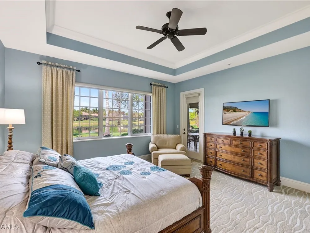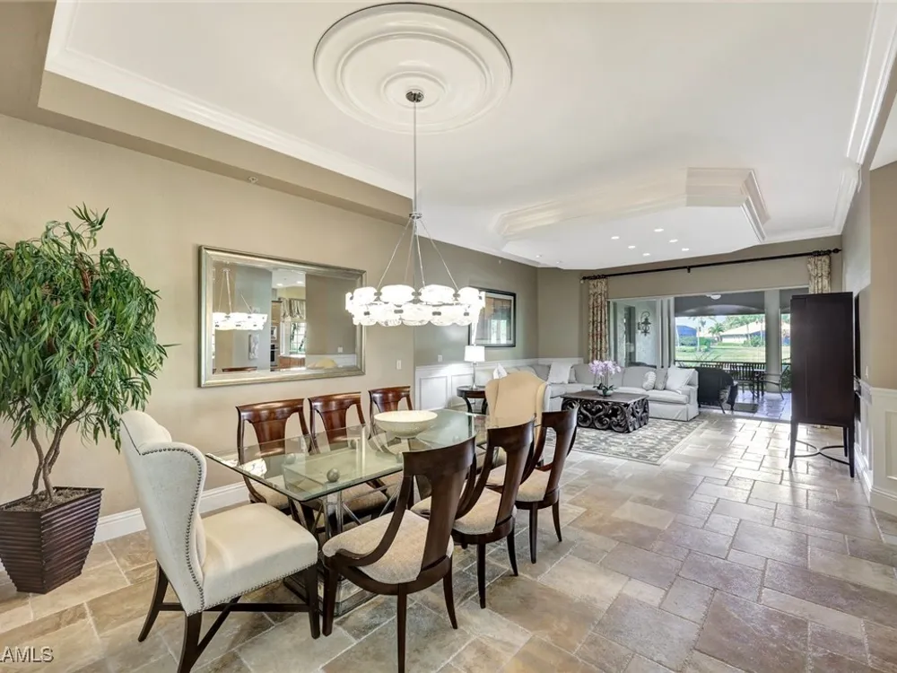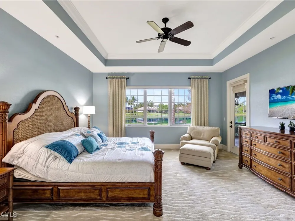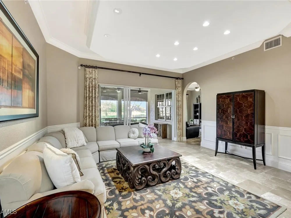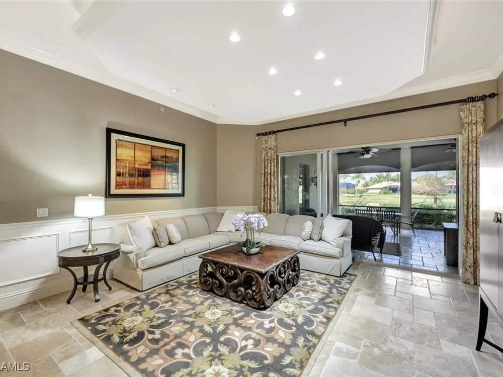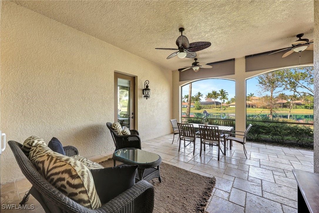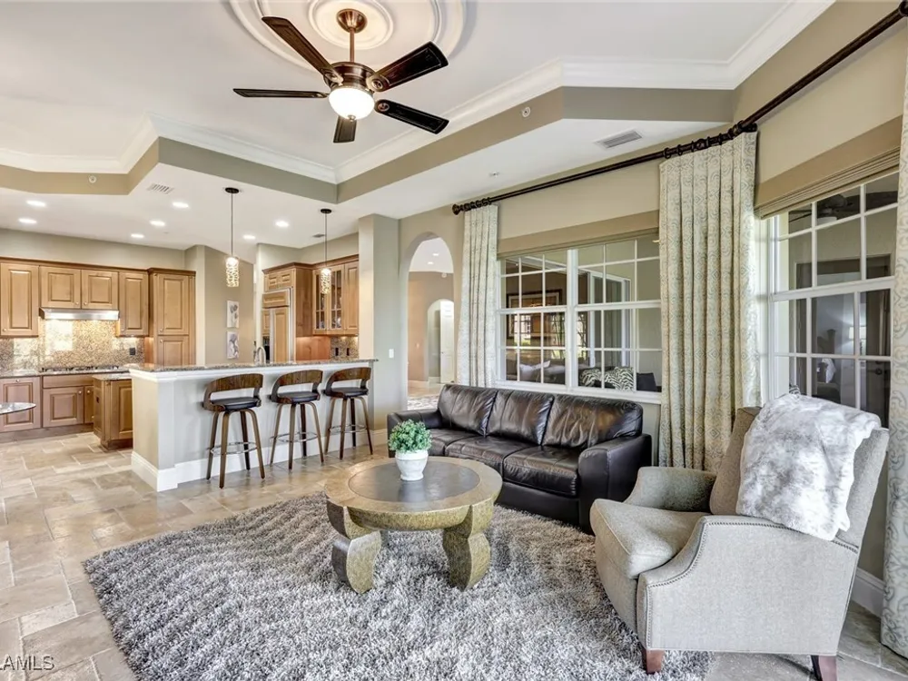 This stunning 3-bedroom plus den, 3-bathroom end-unit in Menaggio offers the epitome of luxury living with gorgeous water views. Boasting just over 2,900 square feet of elegantly furnished space and impeccably maintained, this residence is perfect for both entertaining and relaxing, featuring gorgeous travertine floors, a drop-down accent ceiling, and crown molding throughout. The oversized primary bathroom is a true retreat, complete with a large garden tub, a walk-in shower, and a bidet for added comfort. The spacious primary suite also includes expansive walk-in closets for your convenience. Two additional guest bedrooms with en suite bathrooms ensure privacy for visitors, while the generously sized den offers a versatile space for an office, lounge, or library. Step outside to the private, L-shaped lanai, where you can unwind and enjoy breathtaking water views. The home's architectural elegance is complemented by a beautifully maintained satellite pool, a private cul-de-sac road, and meticulous landscaping. Menaggio stands out as one of the most prestigious condominium communities within Fiddler’s Creek, offering more square footage than any other first floor condo in the community. The award-winning, resort style community of Fiddler's Creek is enhanced by a club and spa, fitness center, swimming pools, two golf courses, tennis courts, pickleball courts, a bocce court, fine and casual dining, social activities, and miles of biking and walking paths. Optional beach club and marina memberships are available. Experience the epitome of luxury living, where every detail is thoughtfully curated to complement your lifestyle