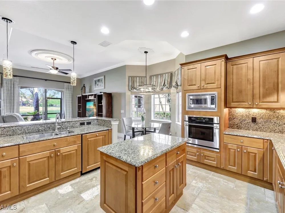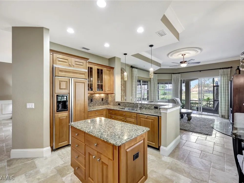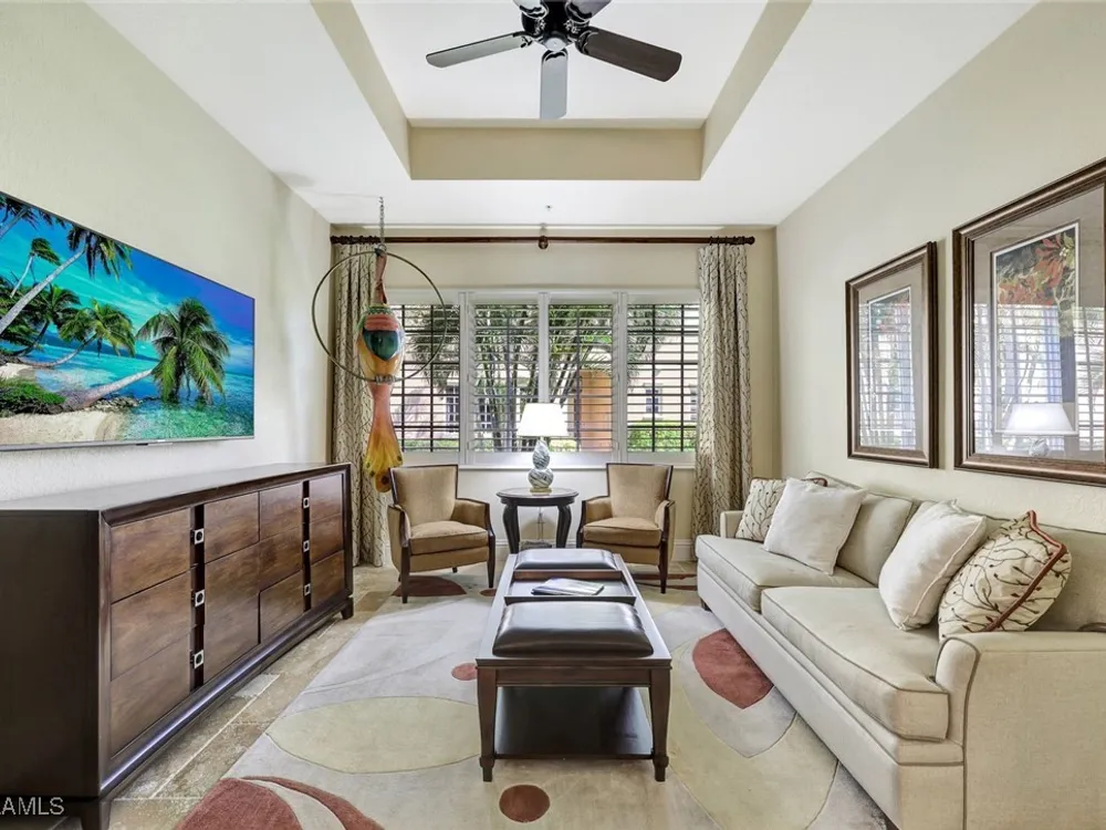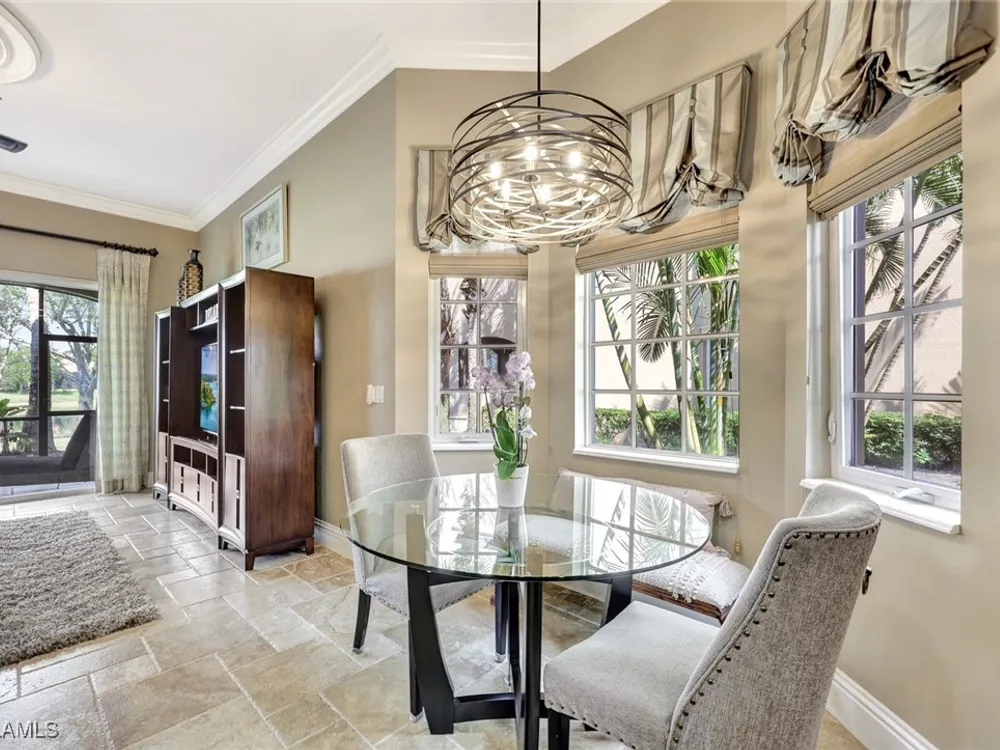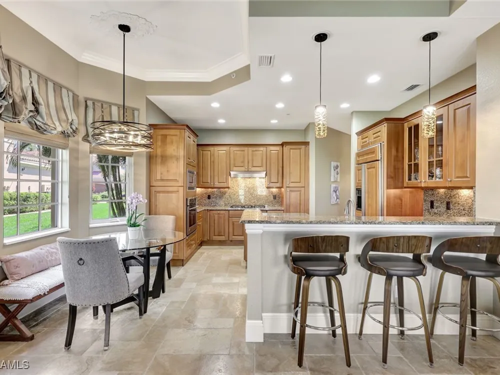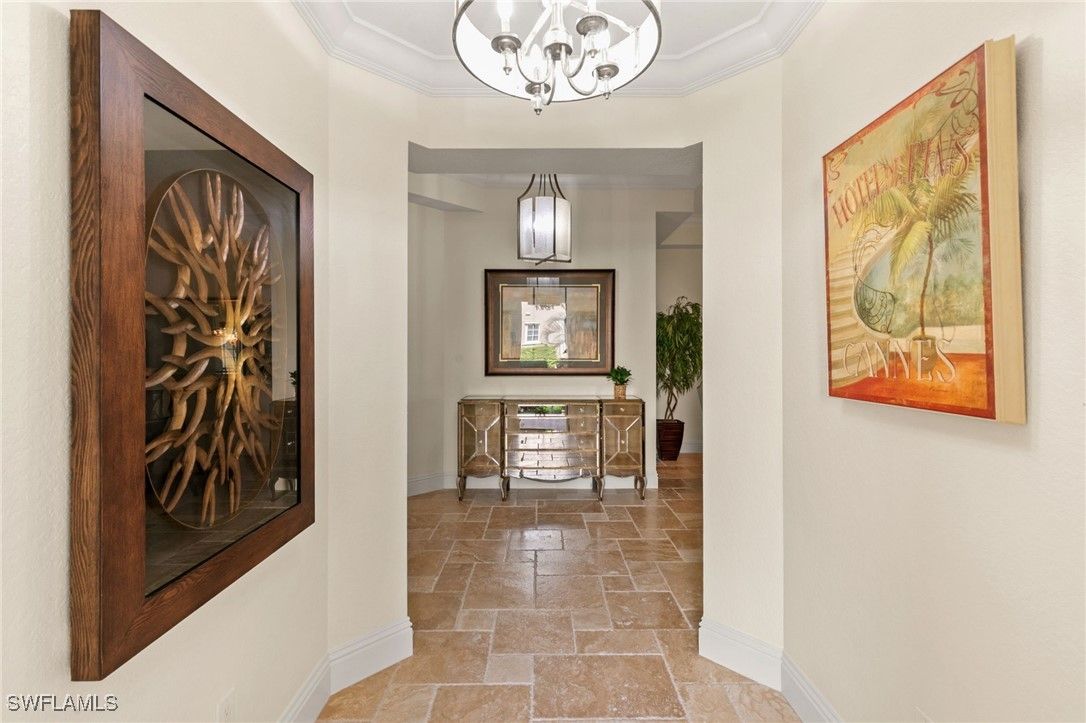 This stunning 3-bedroom plus den, 3-bathroom end-unit in Menaggio offers the epitome of luxury living with gorgeous water views. Boasting just over 2,900 square feet of elegantly furnished space and impeccably maintained, this residence is perfect for both entertaining and relaxing, featuring gorgeous travertine floors, a drop-down accent ceiling, and crown molding throughout. The oversized primary bathroom is a true retreat, complete with a large garden tub, a walk-in shower, and a bidet for added comfort. The spacious primary suite also includes expansive walk-in closets for your convenience. Two additional guest bedrooms with en suite bathrooms ensure privacy for visitors, while the generously sized den offers a versatile space for an office, lounge, or library. Step outside to the private, L-shaped lanai, where you can unwind and enjoy breathtaking water views. The home's architectural elegance is complemented by a beautifully maintained satellite pool, a private cul-de-sac road, and meticulous landscaping. Menaggio stands out as one of the most prestigious condominium communities within Fiddler’s Creek, offering more square footage than any other first floor condo in the community. The award-winning, resort style community of Fiddler's Creek is enhanced by a club and spa, fitness center, swimming pools, two golf courses, tennis courts, pickleball courts, a bocce court, fine and casual dining, social activities, and miles of biking and walking paths. Optional beach club and marina memberships are available. Experience the epitome of luxury living, where every detail is thoughtfully curated to complement your lifestyle