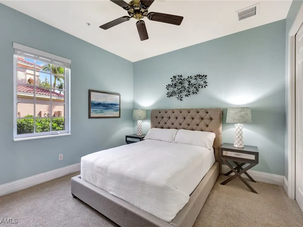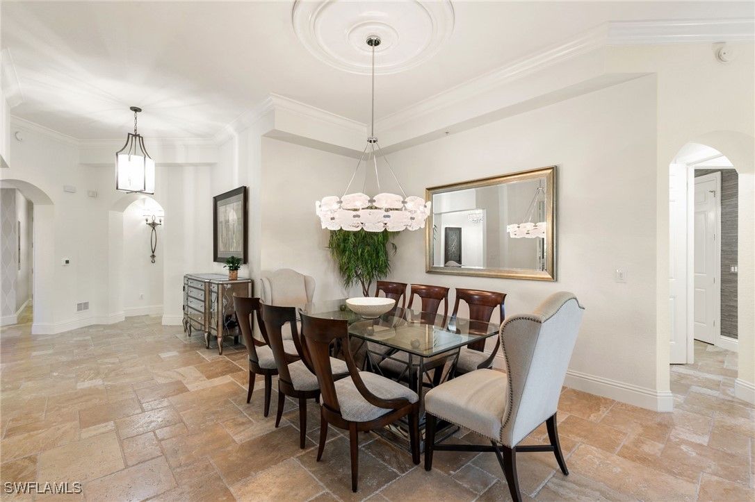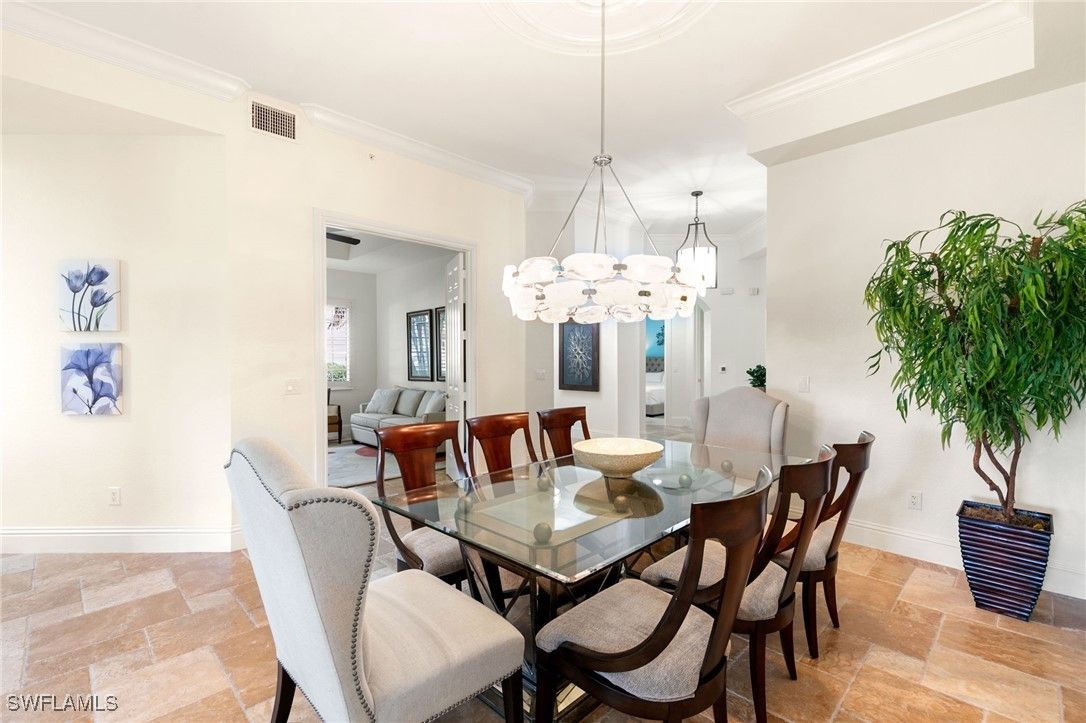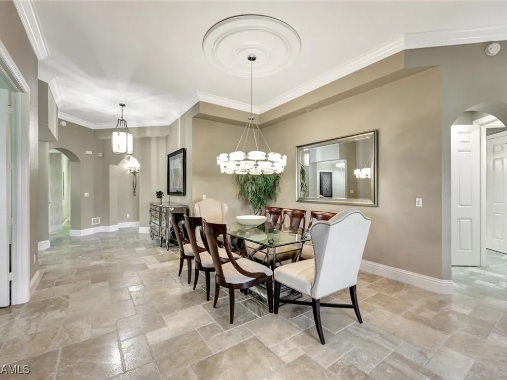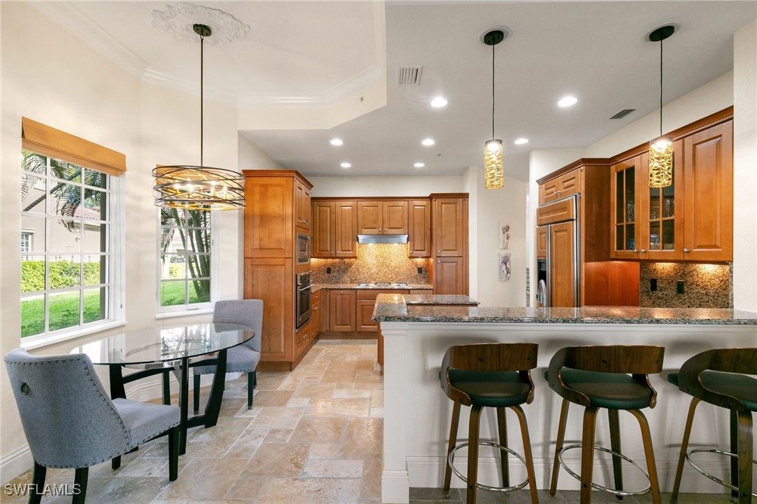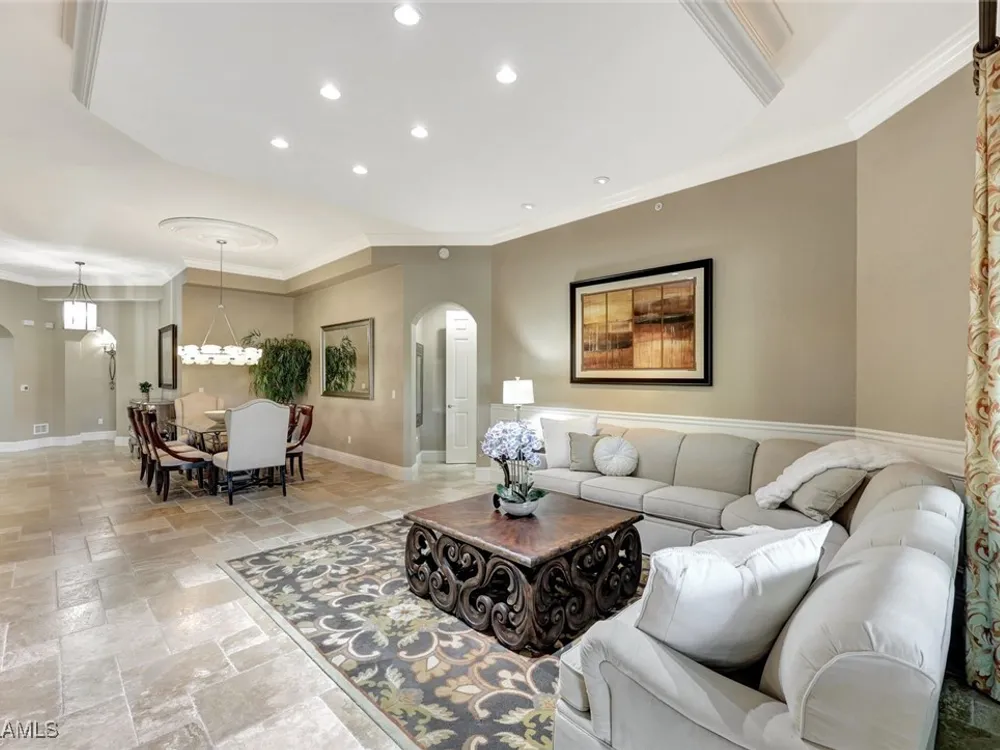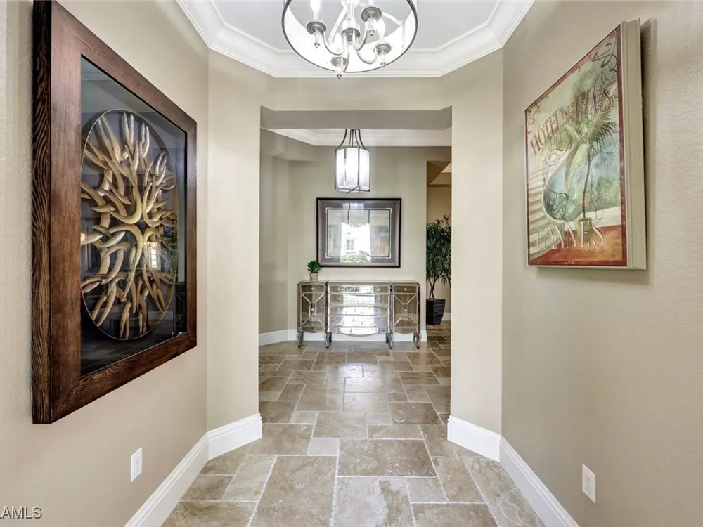 This stunning 3-bedroom plus den, 3-bathroom end-unit in Menaggio offers the epitome of luxury living with gorgeous water views. Boasting just over 2,900 square feet of elegantly furnished space and impeccably maintained, this residence is perfect for both entertaining and relaxing, featuring gorgeous travertine floors, a drop-down accent ceiling, and crown molding throughout. The oversized primary bathroom is a true retreat, complete with a large garden tub, a walk-in shower, and a bidet for added comfort. The spacious primary suite also includes expansive walk-in closets for your convenience. Two additional guest bedrooms with en suite bathrooms ensure privacy for visitors, while the generously sized den offers a versatile space for an office, lounge, or library. Step outside to the private, L-shaped lanai, where you can unwind and enjoy breathtaking water views. The home's architectural elegance is complemented by a beautifully maintained satellite pool, a private cul-de-sac road, and meticulous landscaping. Menaggio stands out as one of the most prestigious condominium communities within Fiddler’s Creek, offering more square footage than any other first floor condo in the community. The award-winning, resort style community of Fiddler's Creek is enhanced by a club and spa, fitness center, swimming pools, two golf courses, tennis courts, pickleball courts, a bocce court, fine and casual dining, social activities, and miles of biking and walking paths. Optional beach club and marina memberships are available. Experience the epitome of luxury living, where every detail is thoughtfully curated to complement your lifestyle