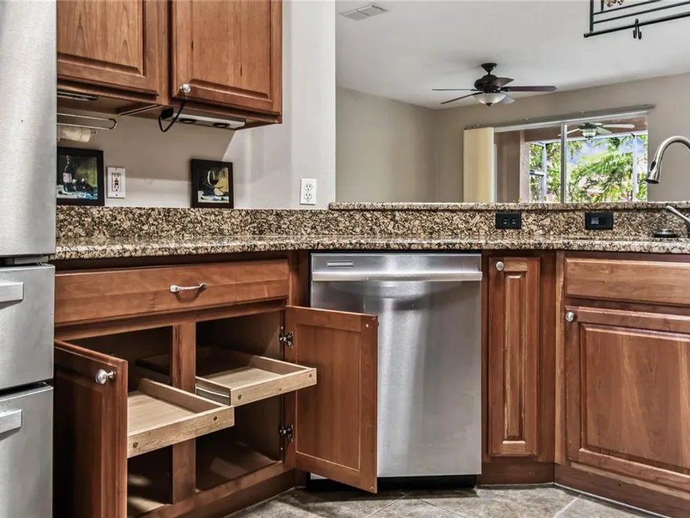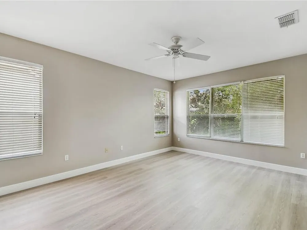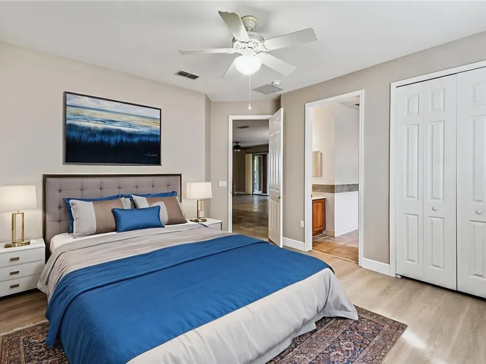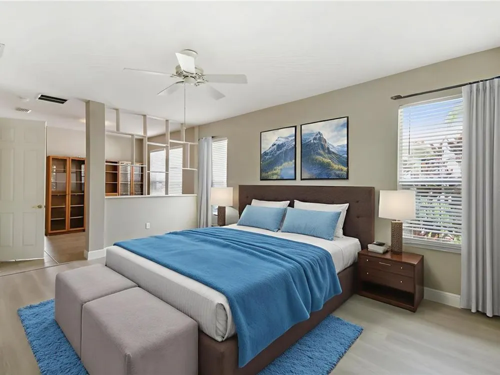 - Ceiling Fan(s), Crown Molding, Eat-in Kitchen, High Ceilings, Living/Dining Room, Open Floorplan, Main Level Primary, Solid Surface Counters, Split Bedrooms, Stone Counters, Walk-In Closet(s)