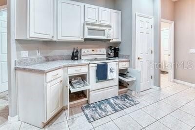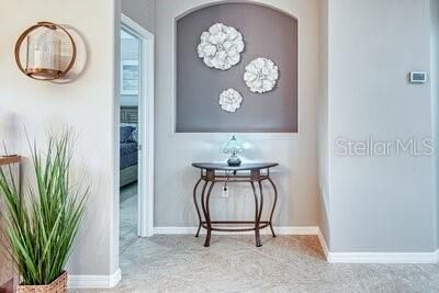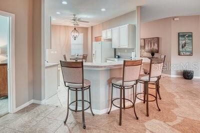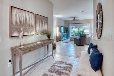 Beautiful SAVOY model, enter this home through a large FOYER with CERAMIC TILE throughout the main living areas & in to the OPEN FLOOR PLAN. The Eat-in kitchen affords WOOD cabinets with lower pull out drawers, CAST IRON double sink, closet pantry, BREAKFAST BAR which easily seats four & is great for entertaining. There's a full LAUNDRY RM with Washer/Dryer, Utility sink & large storage/2nd Pantry closet. The home has improvements such as a Neutral Paint color throughout the interior, Custom window treatments, Ceiling Fans, Blink security camera system with 3 outside cameras & 1 inside camera, New DOUBLE PANE energy efficient low-e glass windows installed in 2022, NEW TRANE AC installed in 2024 with new thermostat which has WIFI capability & newer WATER HEATER. The home has a transferrable Massey Pest Control home warranty thru June 2026. Rear screened LANAI great for relaxing with your morning coffee or afternoon tea. The PRIMARY SUITE affords plush carpeting, a Study/Sitting area creates privacy from the bedroom to the ENSUITE BATHROOM which has DUAL Sinks, Raised Solid surface countertops with Make-Up vanity, Walk-in Shower & Jetted Tub. The SPLIT Floor Plan provides ample privacy with the other 2 BEDROOMS, connected by a Jack-and-Jill Bathroom, which is ideal for guests. Located off the Laundry room is access to the Side Entry Two Car Garage with electric garage door opener, attic scuttle & ample brick paved driveway. This home is in move-in condition. Enjoy morning & afternoon walks around the Shorehaven Lake. Experience the 55+ Lifestyle SOLIVITA has to offer with countless Amenities, Clubs & Social activities. Call to see this home today. INCLUDED in the maintenance fee is the Landscaping, Irrigation system, Roaming security & Guard gate. Homeowners have access to the AUTOMATED gate entry via its license tag readers. Located across from the main entrance is a NEW Shopping facility complete with a Grocery store, Bank, multiple Restaurants, Walgreens Pharmacy, Hospital & more to businesses to come.