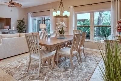 - Ceiling Fan(s), Living/Dining Room, Open Floorplan, In-Wall Pest Control, Main Level Primary, Solid Surface Counters, Solid-Wood Cabinets, Split Bedrooms, Walk-In Closet(s), Window Treatments