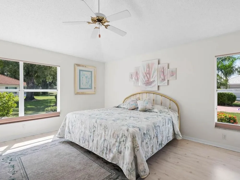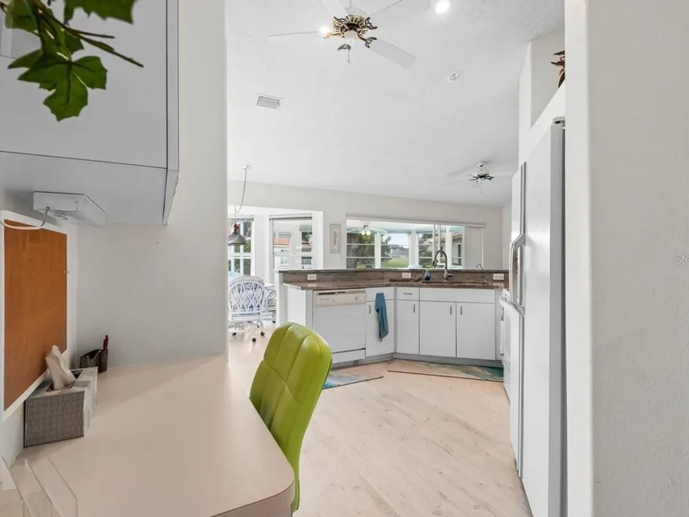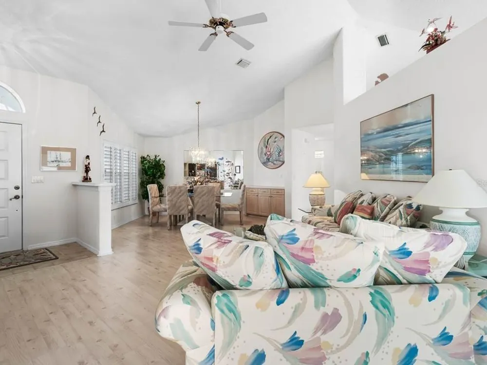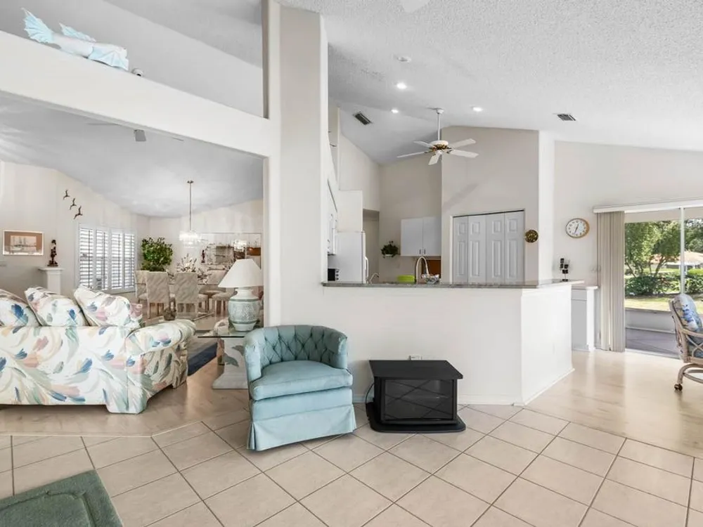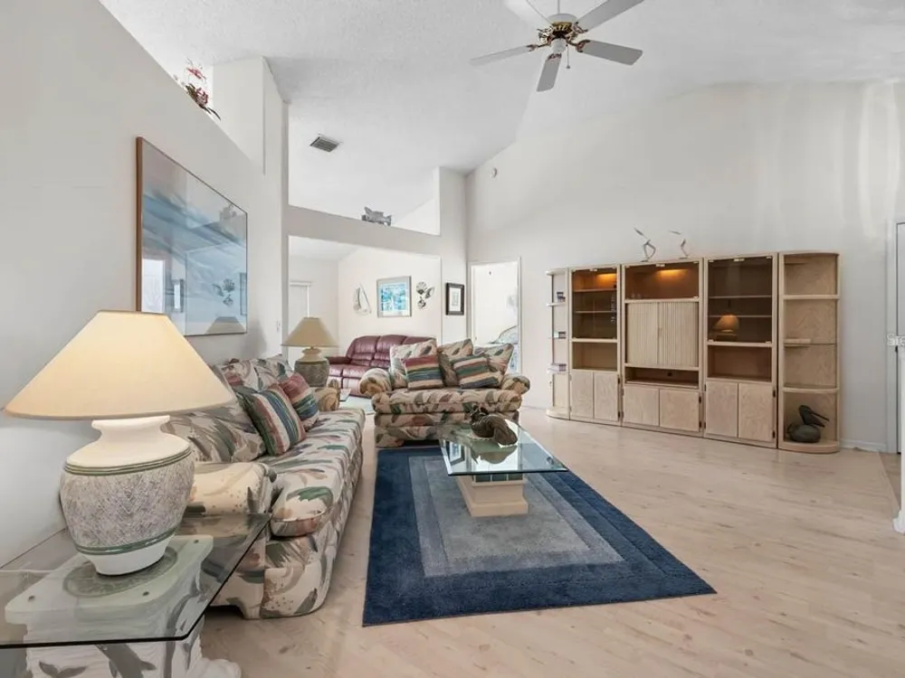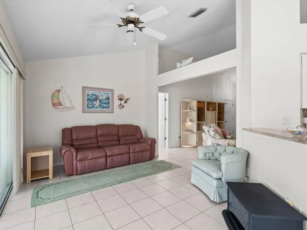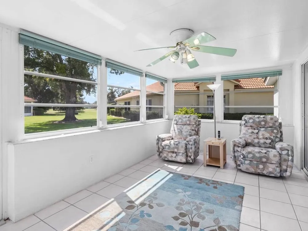 This rare UNATTACHED single-family-home-style condo is a FURNISHED, MOVE-IN READY dream presenting a SCREENED FRONT PORCH, 2-bedrooms, 2-bathrooms, a 2-car attached garage with driveway, GOLF CART, SCREENED LANAI, and an enclosed FLORIDA ROOM! Located on a CUL-DE-SAC in the active and engaging 55+ community of Kings Point, this beautiful property would make a low maintenance home away from home, or the perfect full-time residence. NO CARPET to contend with - tile and luxury vinyl plank flooring throughout! The foyer has a convenient coat closet and ushers you into the Great Room splitting the spacious living and dining areas with their HIGH CEILINGS and PLANTATION SHUTTERS. The kitchen is equipped with a closet pantry, BREAKFAST BAR, desk build-in, and a dinette for informal meals. There's a sitting room area that accesses the large Florida Room through sliders. The Primary Suite features DUAL WALK-IN CLOSETS and an EN-SUITE BATHROOM complete with a DUAL-SINK VANITY, SHOWER with SEPARATE SOAKING TUB, water closet, and linen closet! The secondary bedroom is a comfortable size, and the secondary bathroom is outfitted with a single-sink vanity and tub/shower combination. There's an interior laundry room with its own cabinetry, and the screened lanai is the perfect spot for grilling! Kings Point is a bustling gated and golf cart friendly community known for a myriad of recreation facilities, indoor/outdoor heated pools, a state-of-the art fitness center, arts, crafts, tennis, pickle-ball, lawn bowling, auditorium with 800+ seating and over 200 clubs & activities. Begin the process of making this home your personal paradise by scheduling your showing today!