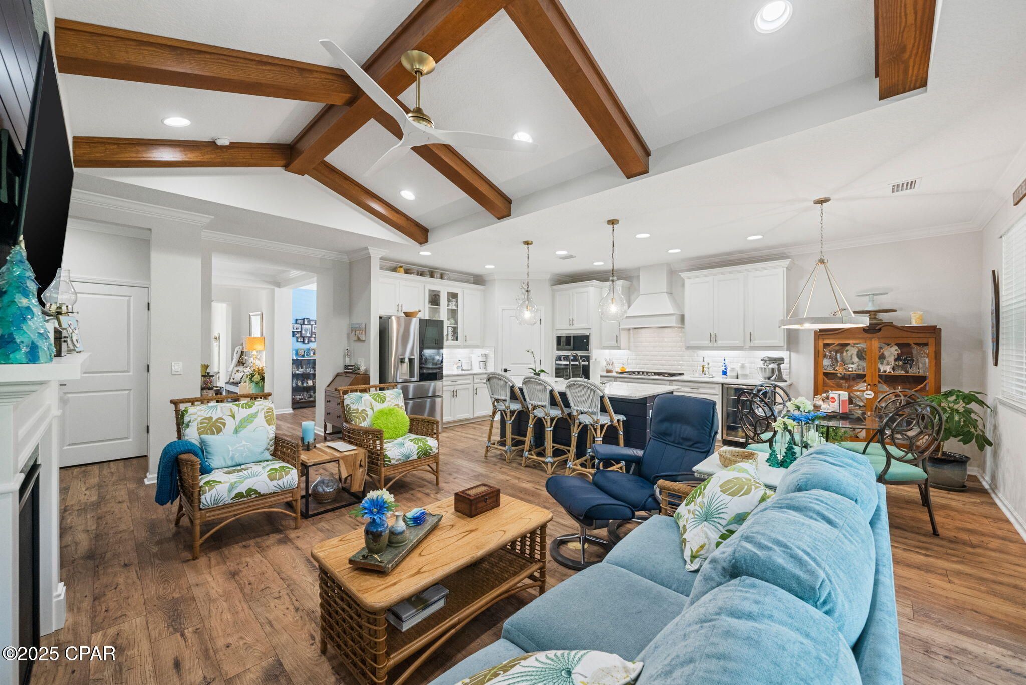 Discover Elevated Coastal Living in Latitude Margaritaville Watersound! Elevate your vision of paradise in this stunning Cabana, Beach Collection, single-family floorplan, a 2,394-square-foot retreat that's been thoughtfully transformed with premium builder upgrades and exclusive post-closing luxury enhancements. These custom touches create a one-of-a-kind sanctuary that stands out among its neighbors, blending timeless Margaritaville charm with sophisticated, personalized flair. Nestled on a coveted premium preserve lot in Fabulous Phase Five, this home invites you into a world of natural serenity and modern convenience. A sleek paver-stone driveway guides you to the 2-car garage (408 square feet), outfitted with a whole-house water filtration system, built-in storage shelving, durable polyurea flooring, and convenient pull-down attic stairs for effortless organization. Step inside to the heart of the home: a breathtaking Great Room where vaulted ceiling beams and a striking tongue-and-groove accent wall draw the eye upward, complemented by bespoke wall colors and a cozy gas fireplace. It's the perfect gathering space for sunset toasts and lively conversations, all under a canopy of coastal elegance. The gourmet kitchen is a chef's dream, featuring lustrous quartz countertops, a designer tile backsplash, 42-inch cabinetry with elegant crown molding, and soft-glow under-cabinet lighting framed by a valence. At its center, a spacious island shines with a custom tongue-and-groove kick wall that echoes the Great Room's accents, turning meal prep into a seamless, stylish affair. Retreat to the lavish master bedroom suite, where a trimmed tray ceiling and bay-windowed sitting area flood the space with light and tranquility. Custom wall colors and an exquisite wainscoting accent wall add layers of warmth and sophistication, making it your private oasis. The adjoining master bathroom exudes spa-like serenity with its tongue-and-groove accent wall, designer light fixtures, and bespoke vanity mirrors—every detail crafted for effortless indulgence. Storage is elevated throughout, with custom organizational systems in the closets, pantry, garage, and laundry room, maximizing every inch for clutter-free living. And that's just the beginning—countless additional interior upgrades await discovery, best experienced in person to truly appreciate their artistry and impact. Unwind outdoors on the extended, screened lanai (complete with bird-caging for pest-free bliss), paved in elegant stones and framed by the lush, wildlife-rich preserve. It's your front-row seat to nature's symphony, ideal for morning coffee or evening stargazing. Prime Location, Endless Adventures: Glide just 5 minutes by golf cart to the exciting new Watersound West Bay shopping center. Embrace the Gulf's powdery white sands in under 10 miles—via car or the community's shuttle service. Touch down at Northwest Florida Beaches International Airport in less than 15 minutes, and access Tallahassee Memorial Healthcare's state-of-the-art Primary Care campus with ease. Seize Your Slice of Margaritaville Magic: Why wait for new construction delays and inferior lots when this turnkey gem lets you dive into the laid-back lifestyle right now? Revel in the community's world-class amenities—from pools and fitness centers to live music and beach vibes—while basking in Florida's golden sunshine and peaceful preserve views. With its unparalleled upgrades, this home isn't just a property; it's your personalized portal to joy. Schedule your private tour today and make the dream yours—before it's gone!
