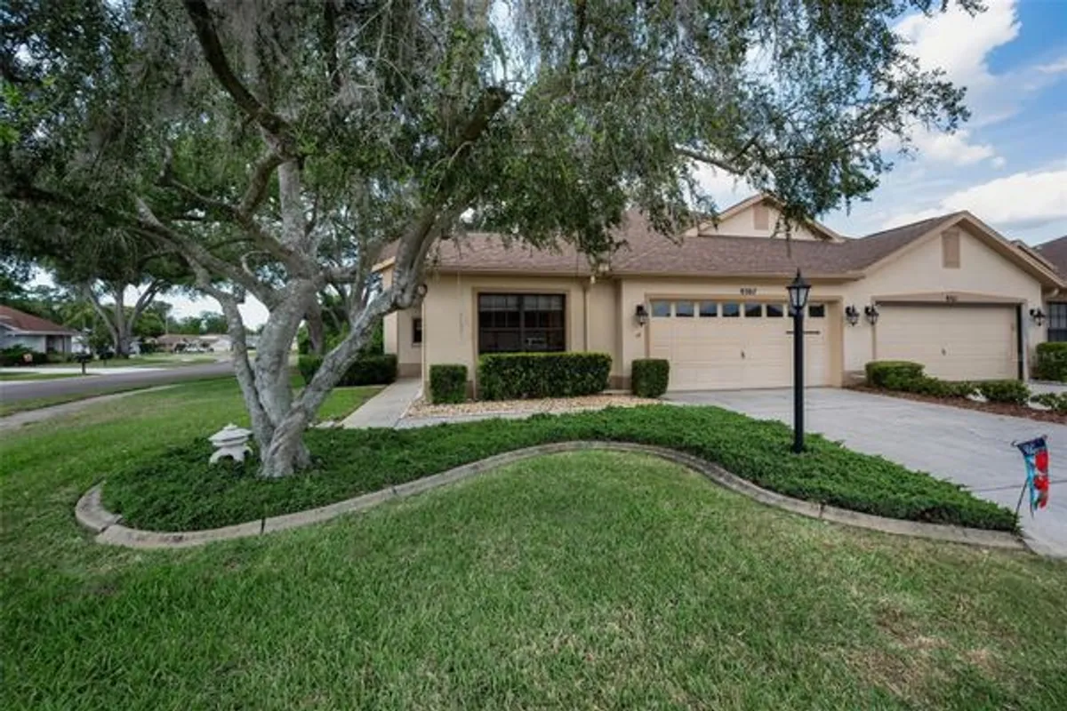 This charming 2-bedroom, 2-bath villa on a desirable corner lot in Timber Greens offers the perfect blend of low-maintenance living and resort-style amenities in a welcoming 55+ gated community. Designed with your comfort and leisure in mind, this home delivers everyday convenience alongside an active, social lifestyle. Inside, you'll find a thoughtful layout that includes a combined living and dining area for easy entertaining, a large eat-in kitchen outfitted with stainless steel appliances, modern resin countertops, and a functional island for meal prep and casual gatherings. The primary bedroom features generous walk-in closets and an updated bathroom with a walk-in shower, while the spacious second bedroom provides flexibility for guests, hobbies, or a home office. A dedicated laundry room with washer and dryer adds convenience to your daily routine, and the two-car garage offers secure parking and extra storage .Step into the spacious enclosed lanai and take in peaceful pond views, a serene backdrop for morning coffee or evening relaxation. This private outdoor retreat extends your living space and invites you to enjoy Florida's beautiful weather year-round. Timber Greens brings you a full lineup of community amenities, including an 18-hole par 71 golf course, clubhouse with pro shop, pool, spa, tennis and pickleball courts, bocce, shuffleboard, arts and crafts programs, a lively 19th Hole Bar and Grill, and a card room for socializing with neighbors. Whether you're pursuing an active hobby or simply enjoying the company of friends, this community delivers the lifestyle you've been looking forward to. Schedule your private showing today!