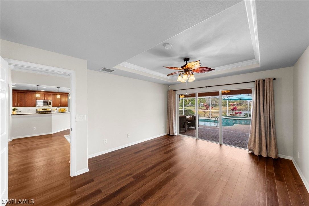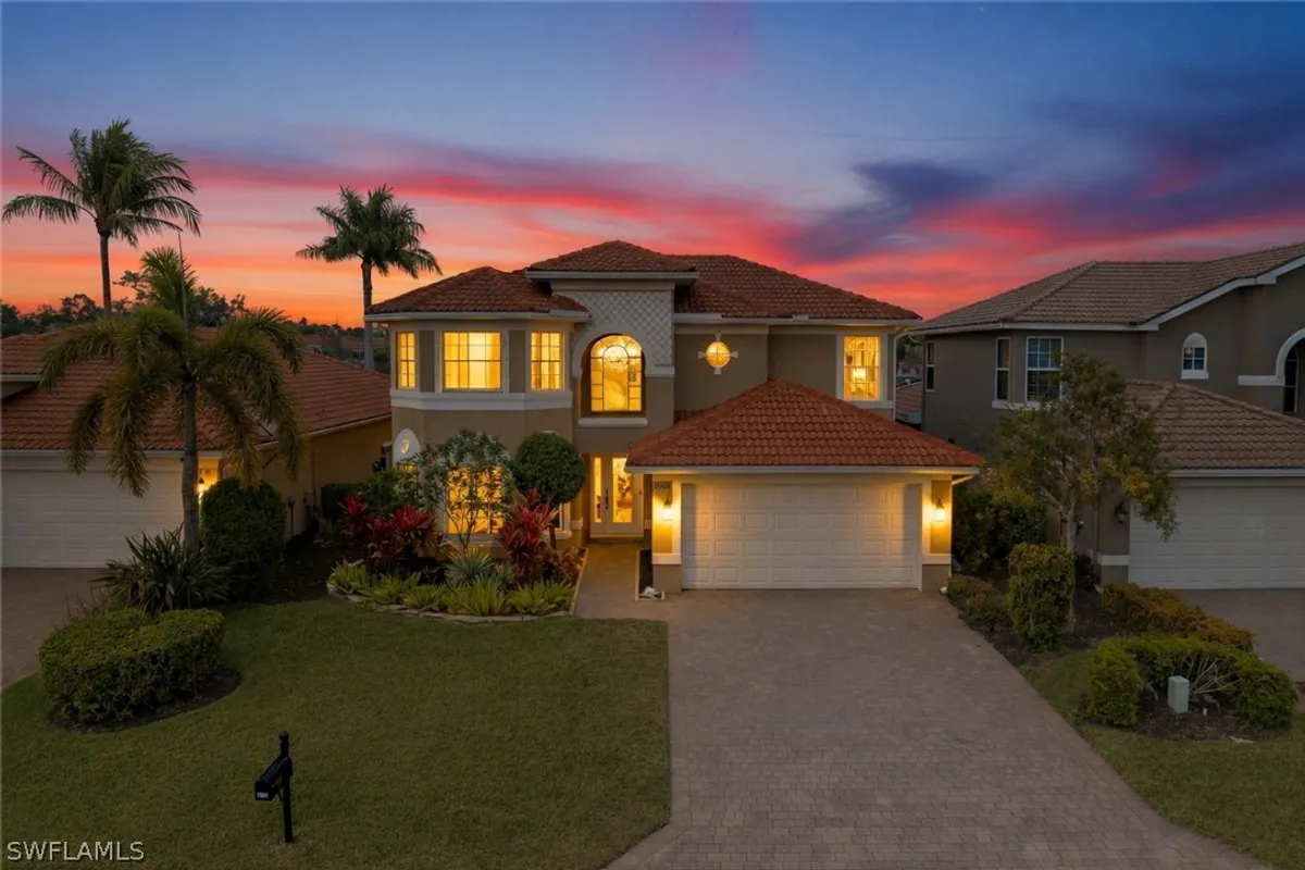 Positioned along an expansive long lake view in The Reserve at Estero, this spacious two-story home offers over 2,500 square feet of thoughtfully designed living space, featuring a first-floor primary suite, tall volume ceilings, and abundant natural light throughout. With northern rear exposure, the heated saltwater pool and spa enjoy sun throughout the day while maintaining comfortable outdoor living and tranquil water views. Designed with a functional, open layout, the main living areas feel bright and inviting from the moment you enter. New luxury vinyl plank flooring throughout the main level and upstairs in the bedrooms, complemented by tile in select areas, adds warmth, durability, and a fresh, updated feel, along with new ceiling fans throughout. The kitchen offers ample cabinetry, stainless steel appliances, and a natural gas range, and connects seamlessly to the main living and outdoor areas for easy everyday living and entertaining. The first-floor primary suite provides a private retreat with direct lanai access, dual walk-in closets, and an ensuite bath featuring dual sinks and a large walk-in shower. Upstairs, three guest bedrooms are complemented by an open loft/flex space, ideal for a media area, playroom, or home office. The screened lanai is designed for both relaxation and entertaining, complete with a heated saltwater pool and spa, built-in outdoor grill, and lush tropical landscaping that enhances privacy without compromising the long lake view. Recent mechanical updates provide added peace of mind, including A/C systems from 2023 and 2017, a pool pump and heater replaced in 2021, and a tankless on-demand water heater installed in 2024. Ideally located west of I-75 in Flood Zone X, The Reserve at Estero offers guard-gated security and resort-style amenities including a clubhouse, fitness center, pool and spa, tennis, pickleball, basketball, and an active social calendar — all just minutes from Coconut Point, RSW International Airport, and Southwest Florida’s white-sand beaches.