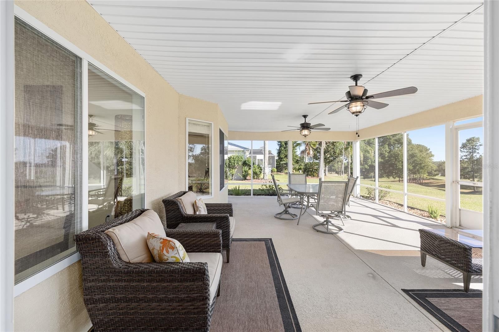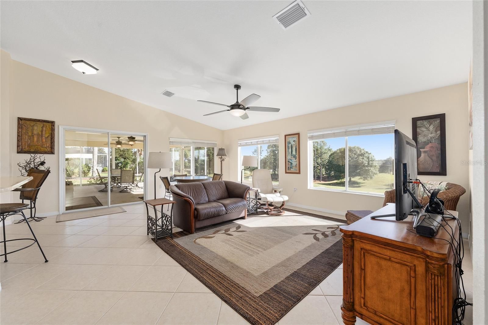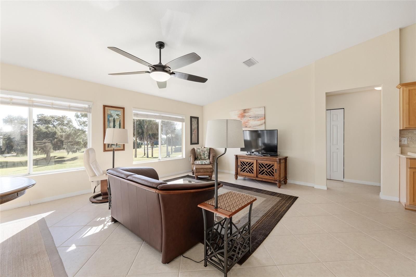 Once you step through the front door of this Providence 3-bedroom, 2-bath model, you’ll be instantly captivated by the spectacular view of the Masters Golf Course. This home enjoys one of the best locations in the community — directly across from the Horizon Pool and Horizon Center, with Bocce and Shuffleboard courts just steps away, and only a short 3–5 minute walk to the Liberty Grille Restaurant and Golf Course. The inviting floor plan includes a living room, dining room, and family room, with a split bedroom design for added privacy. Ceramic tile flooring runs throughout the main living areas, while the bedrooms are comfortably carpeted. The kitchen features abundant maple cabinetry, a tiled backsplash, vaulted ceiling, and plenty of workspace for the home chef.The family room and large screened lanai both take full advantage of the sweeping golf course views — the perfect spot to relax or entertain. The primary suite features bay windows, twin closets, and an ensuite bath with dual vanities, separate shower, and soaking tub. For golf enthusiasts, a practice green and chipping area with bunkers is just 100 yards away. The extended 24-foot garage includes a privacy screen and extra space for storage or a work area. With its superb location, outstanding golf views, and well-designed floor plan, this Providence model is the one you’ve been waiting for. Make plans to see it today!