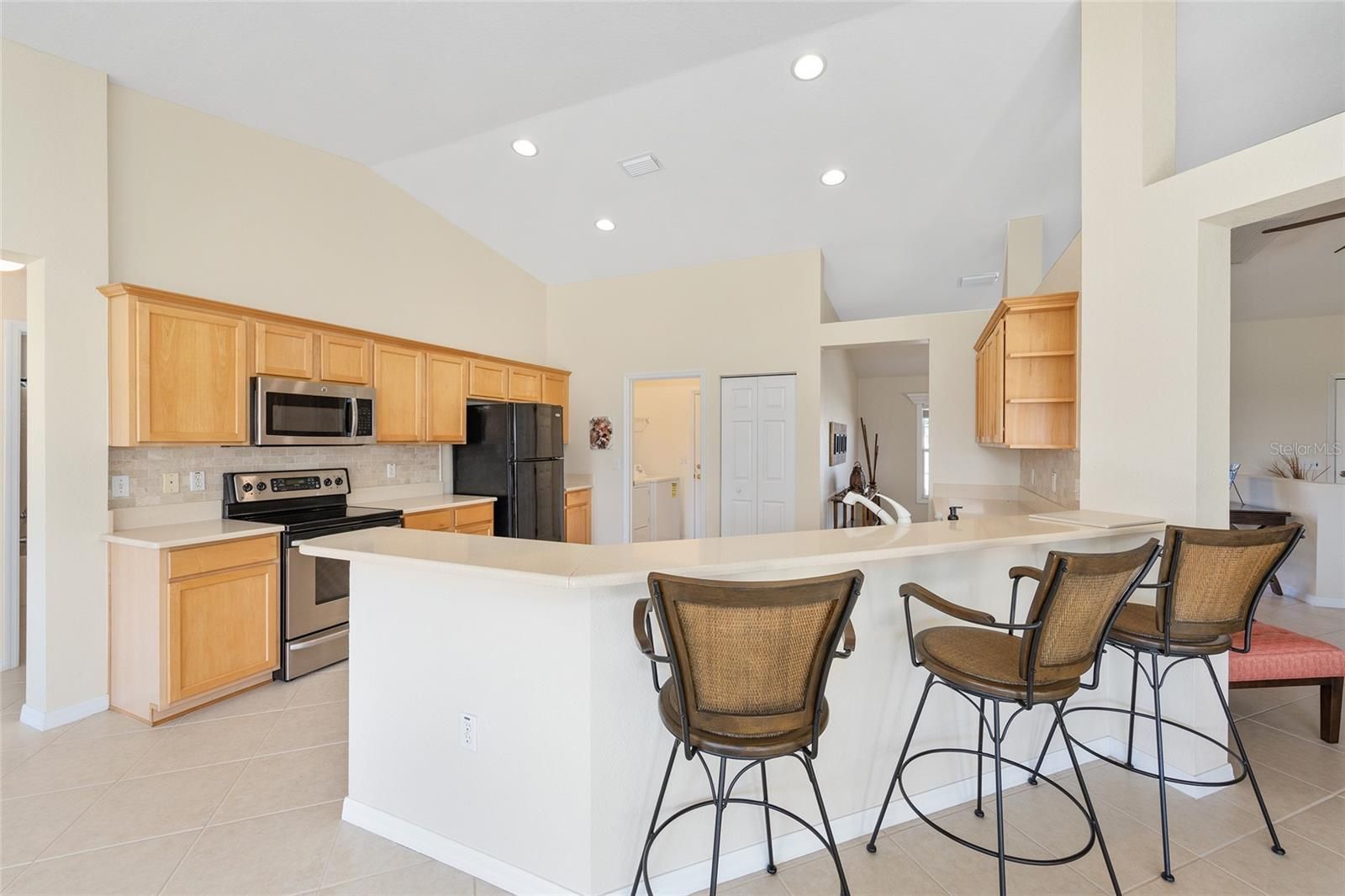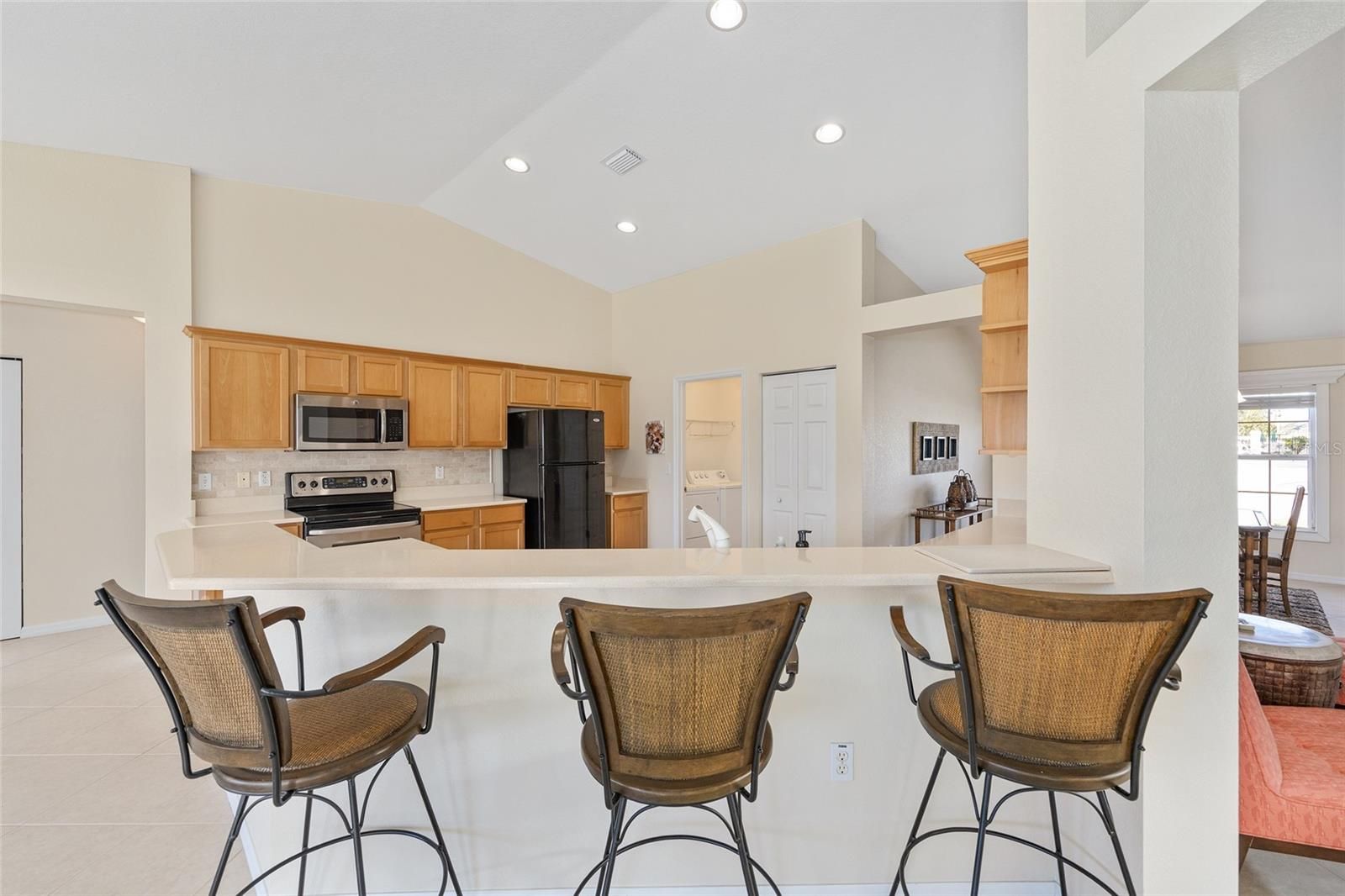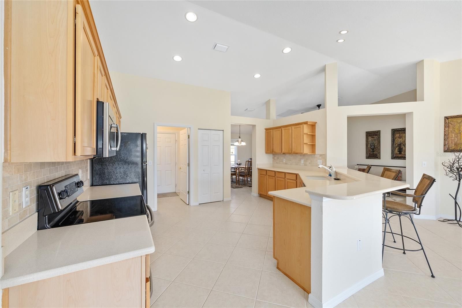 Once you step through the front door of this Providence 3-bedroom, 2-bath model, you’ll be instantly captivated by the spectacular view of the Masters Golf Course. This home enjoys one of the best locations in the community — directly across from the Horizon Pool and Horizon Center, with Bocce and Shuffleboard courts just steps away, and only a short 3–5 minute walk to the Liberty Grille Restaurant and Golf Course. The inviting floor plan includes a living room, dining room, and family room, with a split bedroom design for added privacy. Ceramic tile flooring runs throughout the main living areas, while the bedrooms are comfortably carpeted. The kitchen features abundant maple cabinetry, a tiled backsplash, vaulted ceiling, and plenty of workspace for the home chef.The family room and large screened lanai both take full advantage of the sweeping golf course views — the perfect spot to relax or entertain. The primary suite features bay windows, twin closets, and an ensuite bath with dual vanities, separate shower, and soaking tub. For golf enthusiasts, a practice green and chipping area with bunkers is just 100 yards away. The extended 24-foot garage includes a privacy screen and extra space for storage or a work area. With its superb location, outstanding golf views, and well-designed floor plan, this Providence model is the one you’ve been waiting for. Make plans to see it today!
