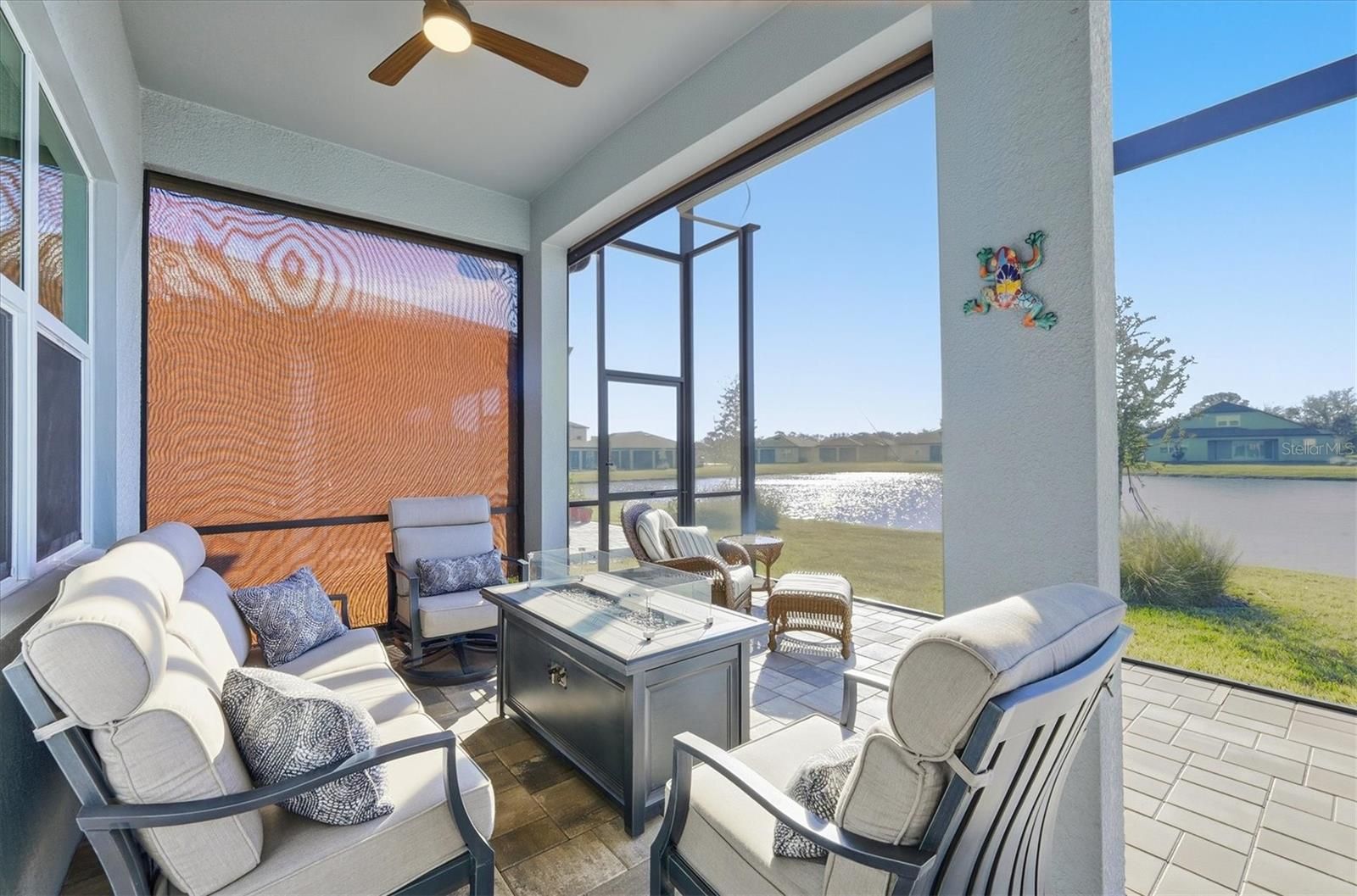 The reasons buyers love the PRESTIGE floorplan are many. A half bath for guests. A primary bedroom that features two walk-in closets. An additional oversized walk-in storage closet- just across from the kitchen. BUT it is the soaring 11ft ceilings that allow this home to feel much larger than 2080 sq ft! Inside this home, the wow continues as the sellers added wood-look beams in the foyer and gathering room, a perfectly placed drop zone just inside the garage. Speaking of the garage, there are solidly built high storage units. Outside, remote-controlled storm screens serve a dual purpose- safety but also keep the cooled or warmed air inside for additional entertaining space. A big, beautiful southerly pond view is visible from the Cafe, Gathering Room and Primary bedroom. Impact windows and doors provide safety and soundproofing; a Super shower with bench in the primary ensuite allows for aging in place and the guest bath has a walk-in shower also. The extended covered lanai and screened patio offers everything anyone could want in a Florida home. Located in the very active and competitive Del Webb Bay View where you can be as busy as you want to be! Pickleball, Tennis, Bocce, Table tennis, shuffleboard, etc. A heated resort style pool, resistance pool and lap pool, hot tub, community garden, clubs galore and with a restaurant on site, Bay View is golf cart friendly. Not to be forgotten- Two dog parks for our furry friends. Located 1.5 miles from I75 and 275.
