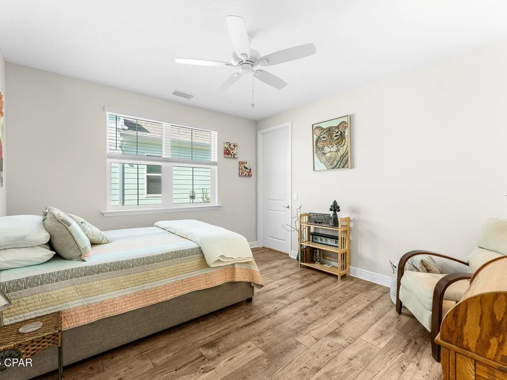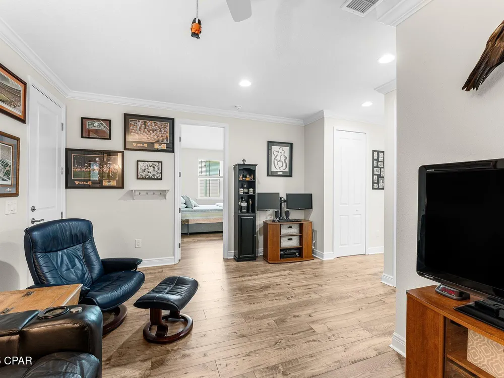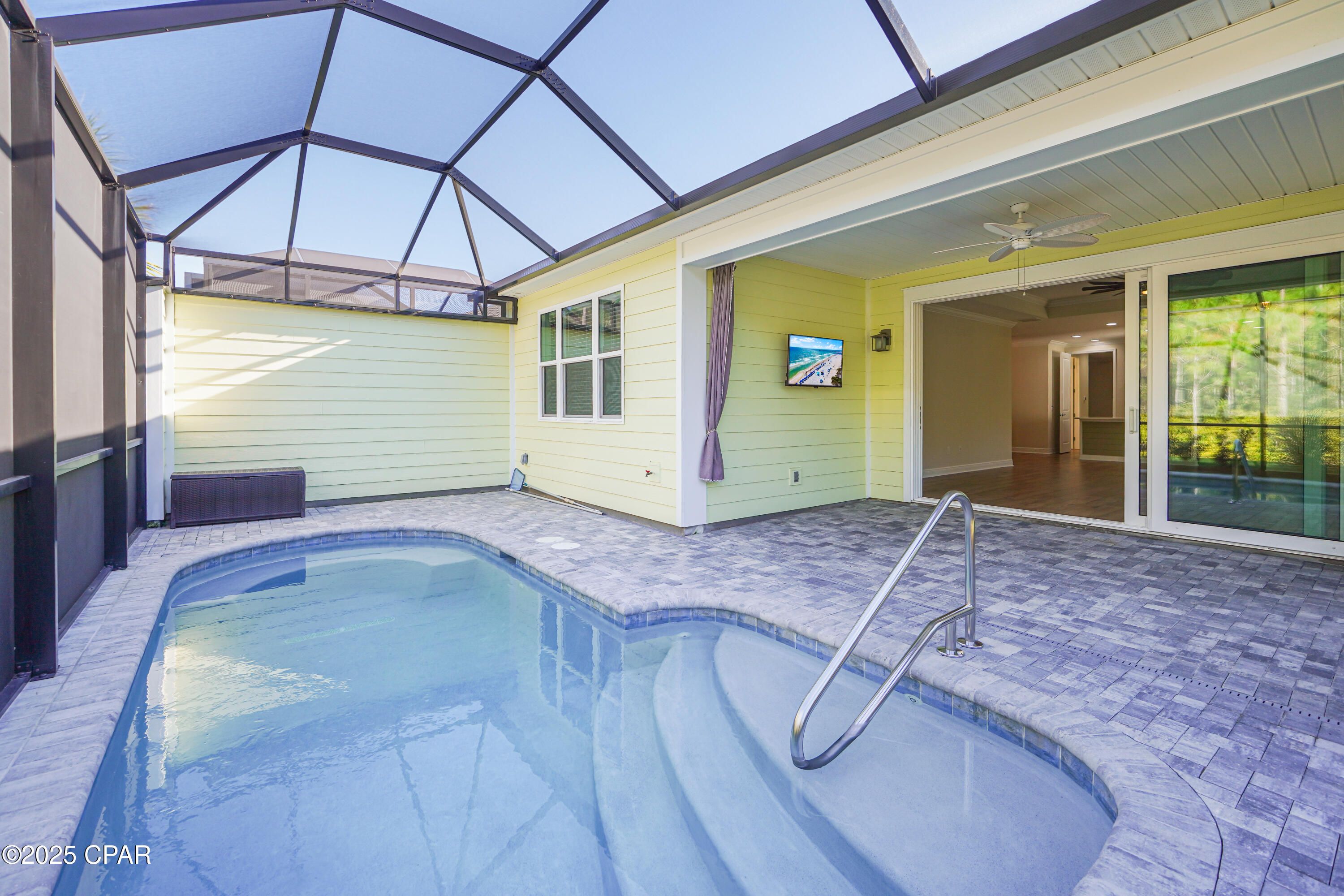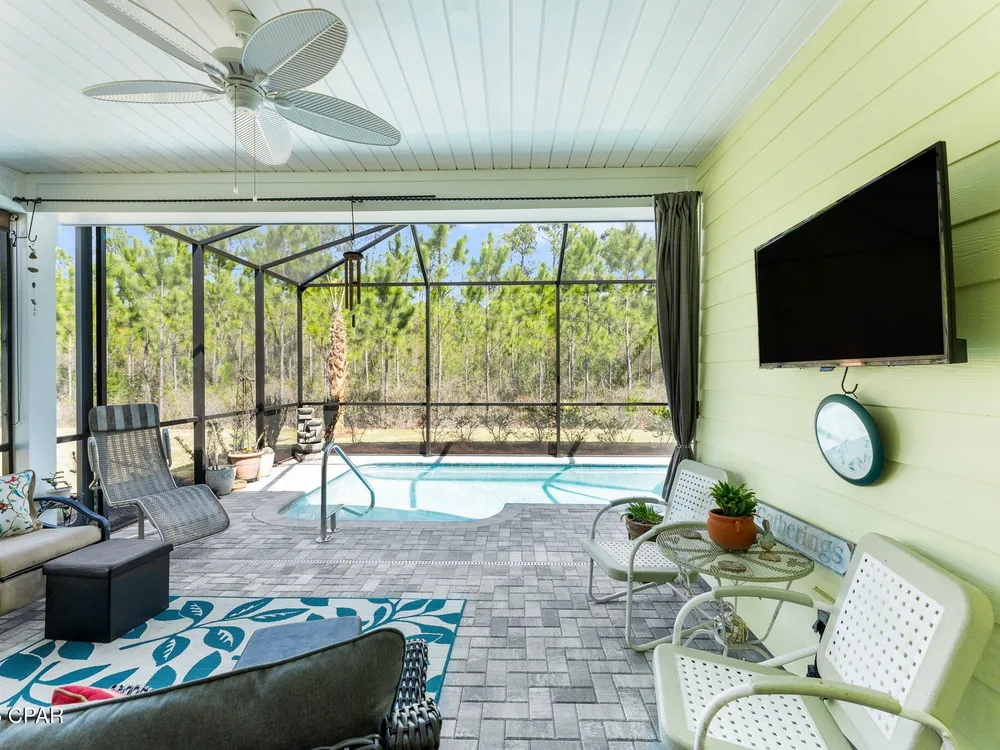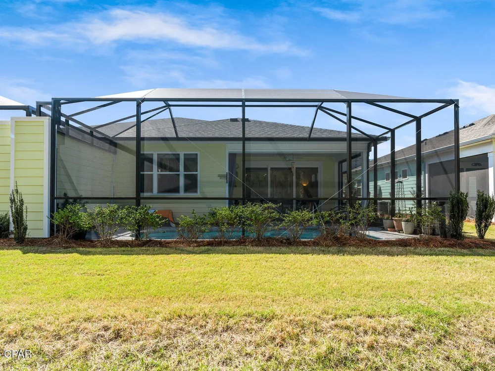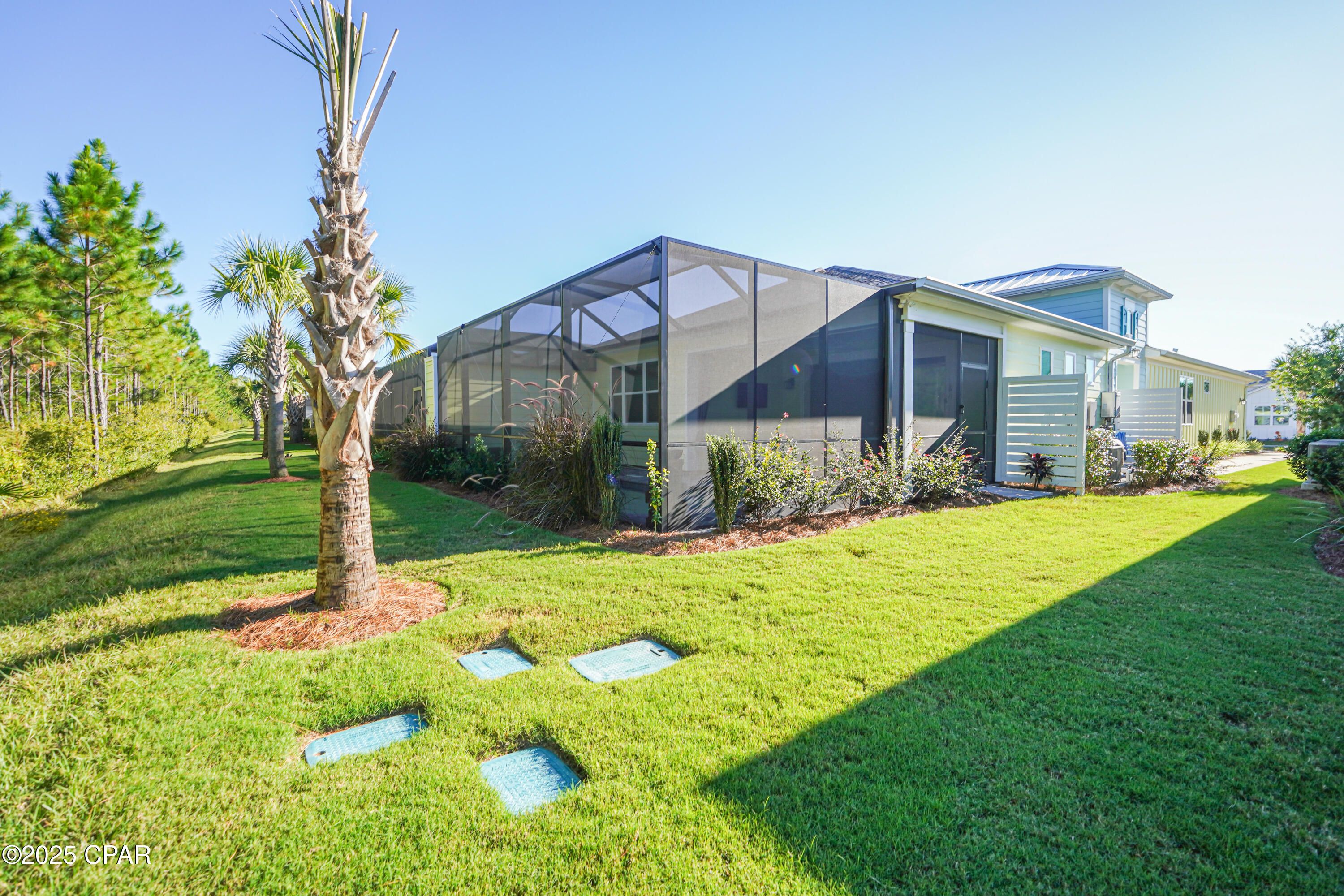 Latitude Margaritaville Watersound - Tortola Villa! Welcome to this beautifully appointed Tortola floorplan Villa with a POOL, in the highly desired and peaceful enclave of Phase 6a. Set on a private preserve lot, this home offers a perfect blend of comfort, privacy, and resort-style living. Interior Features include an open concept design with abundant natural light, Kitchen featuring quartz countertops, custom backsplash, and an electric range and large island. The Great Room is highlighted by a full wall of sliding glass doors that open seamlessly to the outdoor oasis. Two spacious en-suites plus a ½ bath - the Tortola is the only Villa floor plan to offer this unique layout Primary/Master bedroom ensuite overlooking the pool and preserve with tile shower, double vanity with quartz countertops and a large walk-in closet. Secondary/guest bedroom ensuite is almost as large as the primary with a huge walk-in closet and full bath with upgraded shower option. Flex space/den or office with a custom door between the main living/kitchen area for privacy added after closing for additional privacy. Laminate Revwood by Mohawk flooring throughout the home with the exception of the baths and laundry tile floors. Custom ceiling fans throughout. Upgraded lanai pavers, covered porch, screen enclosure surrounding the pool, all overlooking a peaceful preserve with stunning morning sunrises! Outdoor Living at its finest with your own private, upgraded lanai pavers, screen enclosure, Saltwater pool equipped with solar blankets for energy-efficient heating and a handrail for easy entry. Peaceful preserve views create a serene backdrop. Community & Lifestyle: Phase 6a is known for its quiet, quaint setting within Latitude Margaritaville Watersound. Residents enjoy access to all the incredible community amenities—golf cart underpasses, resort-style pools, tiki huts, and endless opportunities to embrace the Latitude lifestyle. This thoughtfully designed Tortola Villa truly captures the essence of Florida living—low maintenance, highly functional, and ready to be enjoyed. Villas have the exterior paint and roofs included in the HOA dues for repainting and roof replacement on a maintenance schedule. All landscaping, amenities covered in HOA dues, complete with a 10 year structural warranty from the original build date. Latitude Margaritaville Watersound is named among the TOP 50 master-planned communities in the U.S. providing a one-of-a-kind lifestyle! Amenities include the Town Center for the community which features a 2 story restaurant overlooking the Intracoastal Waterway, entertainment amphitheater for music and more, outdoor dance floor, resort style outdoor pool, lap indoor pool, state of the art Fitness Center, pickleball, tennis courts, bocce ball, Barkaritaville dog park, business center and a theater, pet grooming center, ceramics and wood-working shop. Activities year round, music and performances every Friday and Saturday nights and at the outdoor pool during season. Did I mention the BEACH!! Short-term Rentals allowed minimum of 30 days are allowed up to 3 leases per year (one leasing individual must be 55+). All leases must be approved by the HOA. Come experience the lifestyle Latitude Margaritaville Watersound and Panama City Beach has to offer!