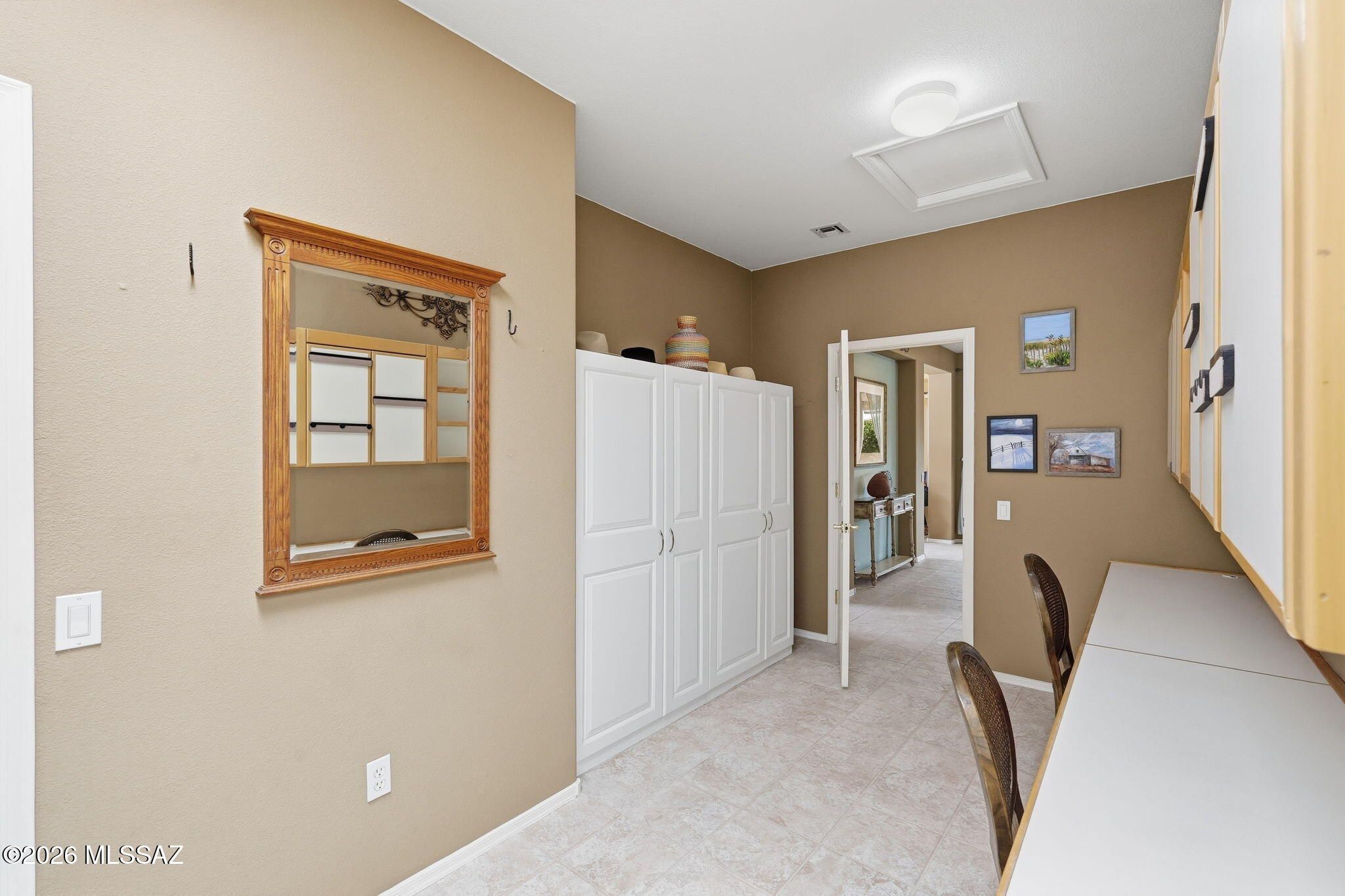 Wrap yourself in the warm glow of desert hues and lush, thoughtfully designed landscaping in this beautifully appointed two-bedroom, two-bath home, complete with a versatile den and dedicated office. The inviting kitchen is both stylish and functional, featuring stainless steel appliances, quartz countertops, and convenient pull-out cabinet organizers. Throughout the main living areas, low-maintenance ceramic tile and vinyl plank flooring offer durability with a refined finish. The bright, well-lit office provides the perfect space for hobbies or remote work, while the spacious den offers flexibility as a potential third bedroom with the addition of a Murphy bed or sleeper sofa.