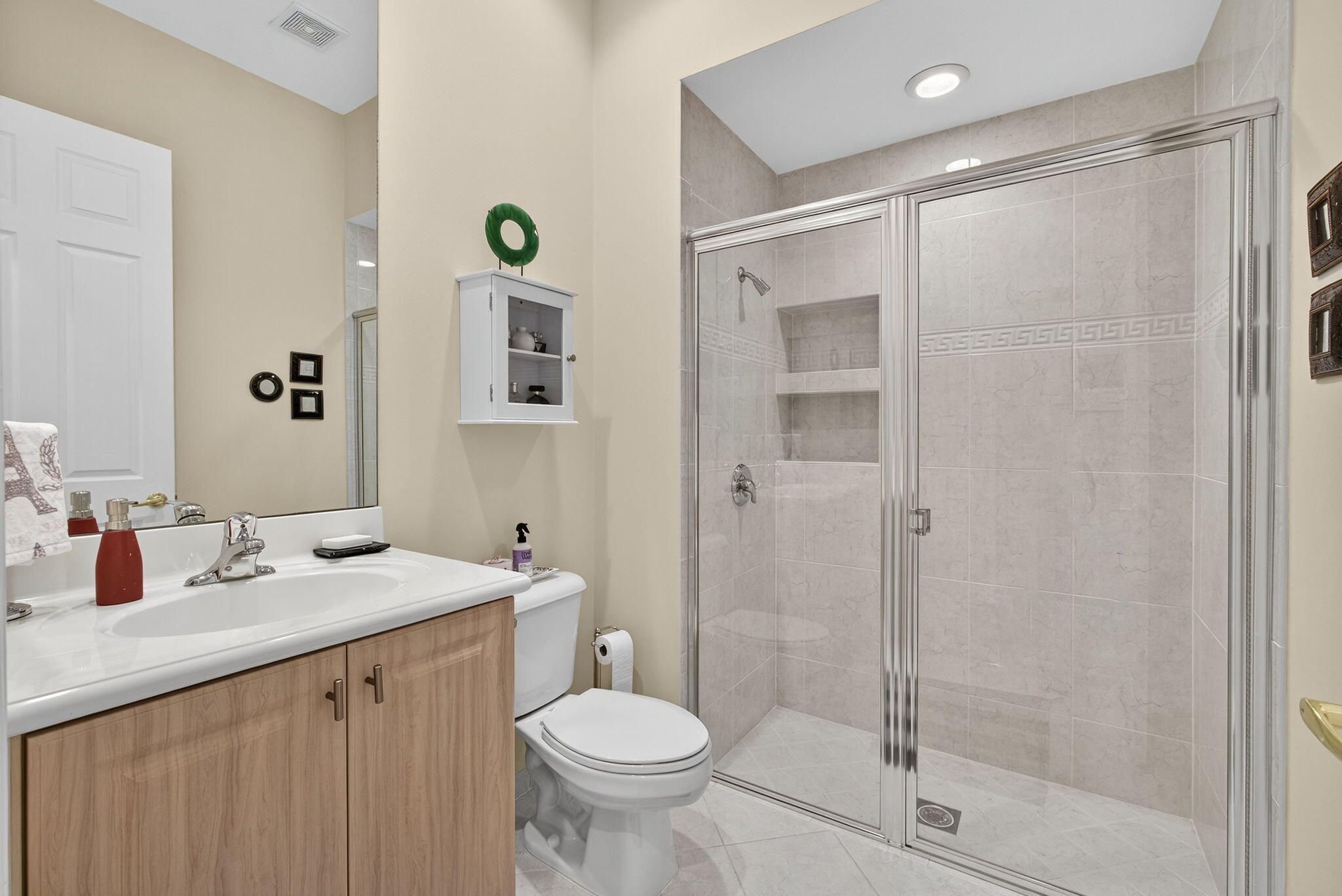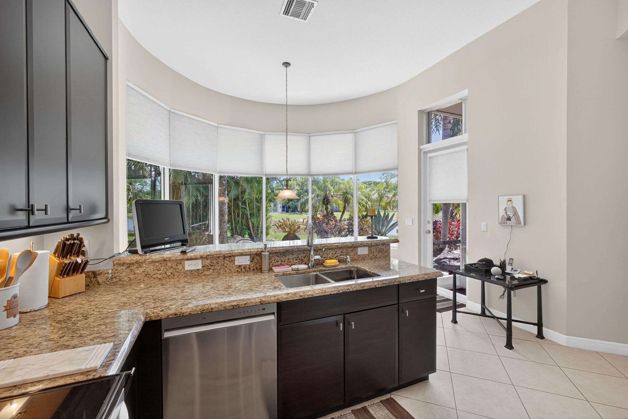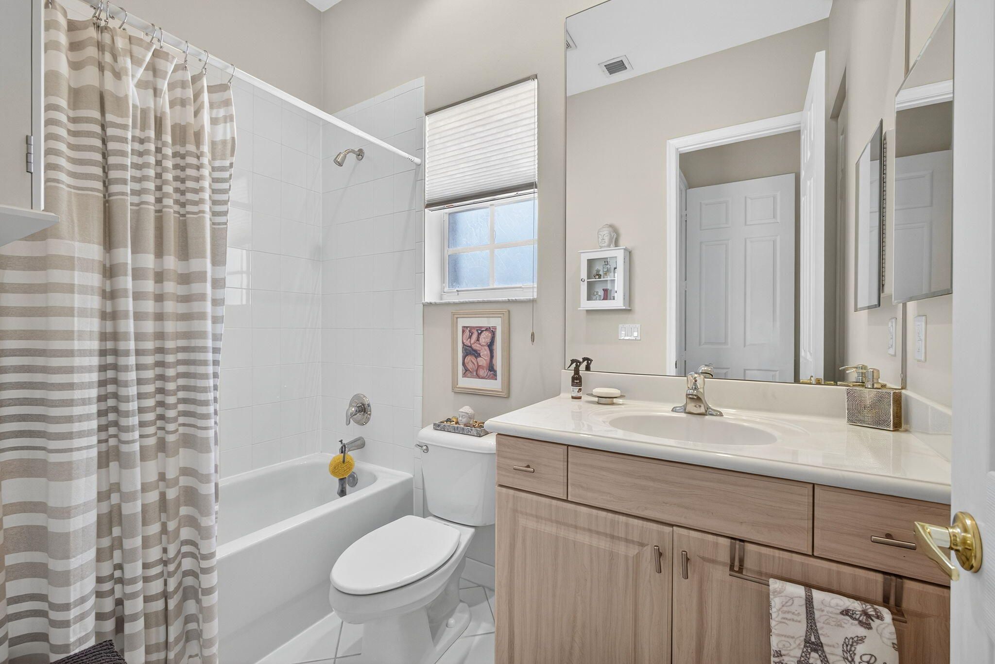 Welcome to this ONE OWNER ONE OCCUPANT like new Minto built corner Seabourn residence featuring three bedrooms, three full bathrooms, a versatile family room / office / flex space, and a 2 car attached garage & BRAND NEW TRANE AC. The property is situated in a meticulously maintained, Zen-inspired home has a stone garden entry and a low-maintenance backyard and many ''squared clean line'' features inside. The open floor plan is complemented with high ceilings & large windows providing nice views. The spacious eat in kitchen is complete with 6 large windows that create a bay area ideal for seating highlighting the water and garden views. Kitchen has granite countertops, Euro style cabinets, & newer modern LG appliances. The split floor plan incl 2 en suite bedrooms + 1 add'l BR and BA The main suite has separate shower and soaking tub w mirrored wall and 2 walk in closets. Of course there is a full sized laundry room w utility sink. The screened lanai offering garden and water views is perfect for coffee, entertaining or al fresco dining. Additional features incl : higher ceilings & windows, tiled main areas(diagonal) and bleached oak plank laminate flooring, off white walls throughout, plenty of ceiling fans, outdoor floodlights, glass French door, all HUNTER DOUGLAS blinds, tinted windows and full accordion shutters for those stormy days. Located within the age-restricted Buena Vida community, residents have access to a variety of amenities, including a clubhouse, café, pickleball and tennis courts, pools, spa, fitness center, and library, & more. The community is conveniently located near shopping, dining, major roads, PBIA, downtown West Palm Beach, and nearby beaches. Age Restricted Community.