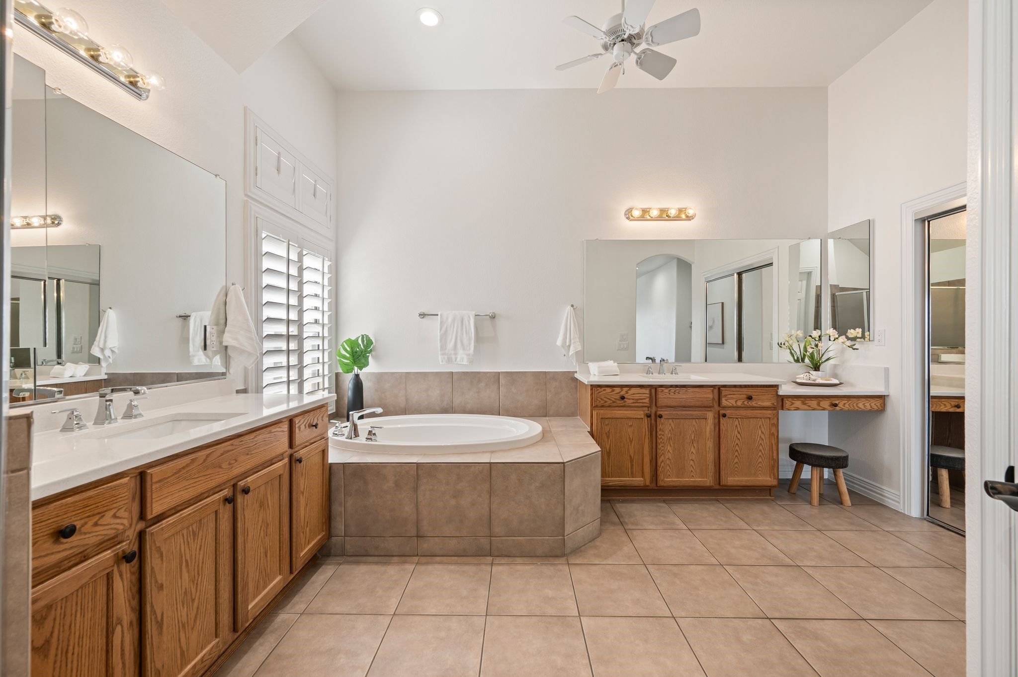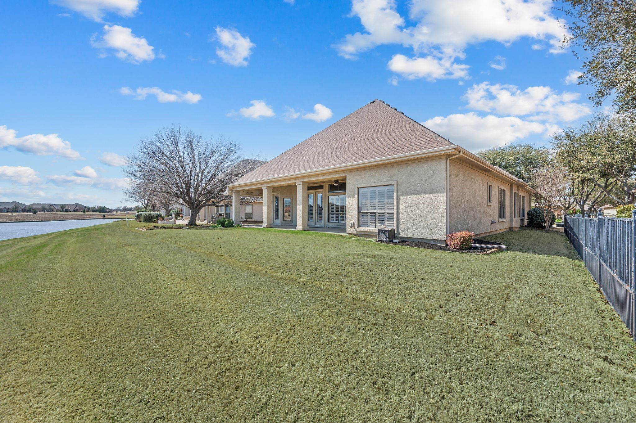 Experience elevated living in this stunning single-story home, perfectly positioned on the golf course with tranquil views of lush fairways and sparkling ponds. Located in a premier adult-only, resort-style community, this home offers the perfect blend of luxury, comfort, and lifestyle. Designed for effortless living and entertaining, the open-concept floor plan features 3 spacious bedrooms, 2.5 baths, two inviting living areas, two dining spaces, and a dedicated office with built in cabinets and desk. Walls of windows frame picturesque views and fill the home with natural light. The gourmet kitchen is the heart of the home, complete with granite countertops, newer stainless steel appliances, and an oversized island that overlooks the expansive living space, ideal for gathering with friends and family. Retreat to the generous primary suite, where relaxation awaits. This private haven includes two walk-in closets, dual vanities with Quartz counter-tops, a separate shower, and a soothing soaking tub designed for unwinding at the end of the day. Step outside to the covered patio and savor peaceful mornings and golden sunsets as the sun reflects off the water and the beautifully manicured greens, your own private resort backdrop. Beyond your doorstep, enjoy an exceptional array of amenities including a resort-style pool, clubhouse, on-site restaurant, and a full calendar of social activities designed to foster connection and fun with neighbors. Additional highlights include a three-year-old roof, fresh paint throughout, new LED lighting, Window shutters throughout, a full three-car garage, and an unbeatable location just down the street from the upcoming HEB. This is more than a home, it’s a lifestyle.