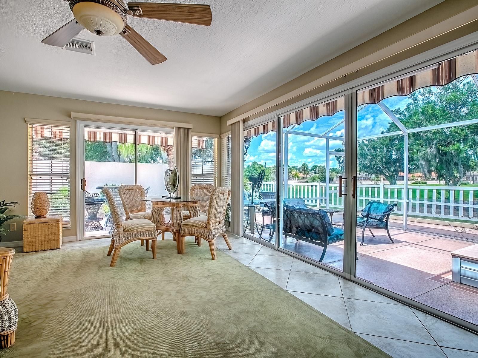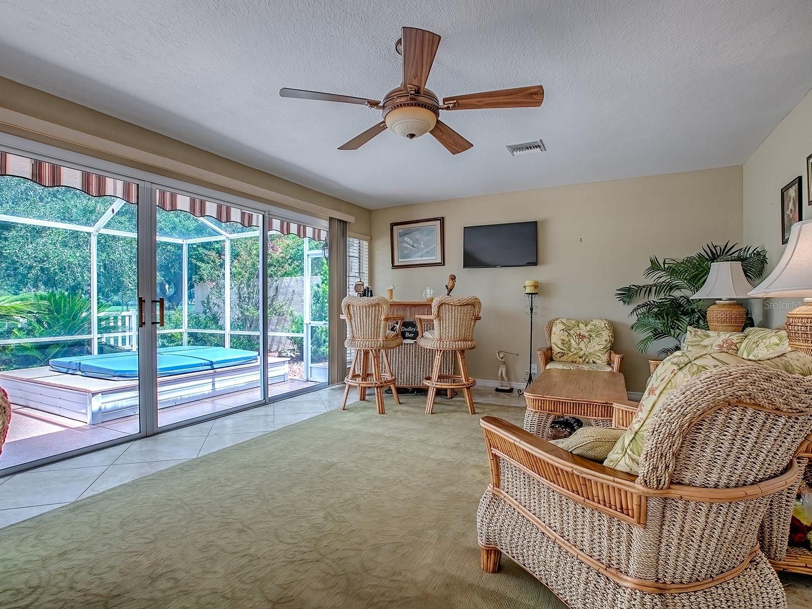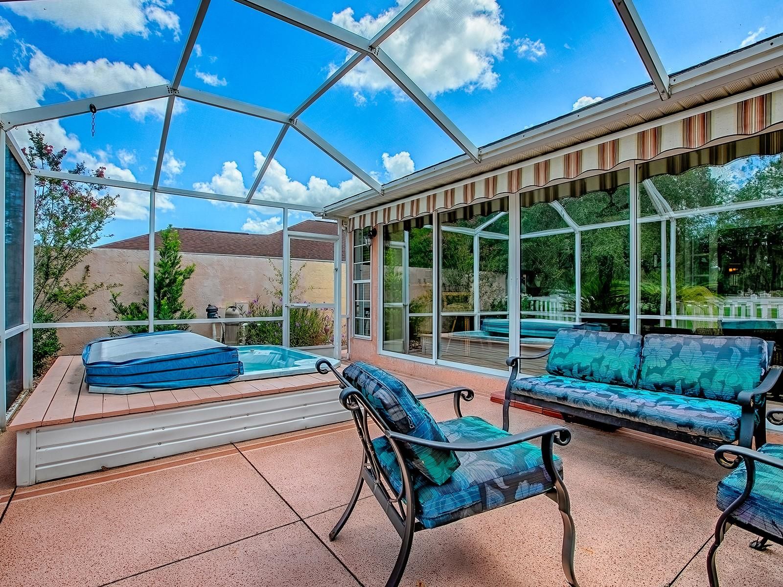 NEWER 2023 ROOF, BOND PAID, BROWARD WARRANTY, TERMITE BOND, AND TWO CAR GARAGE on this TURNKEY, INCLUDING GOLF CART, 2/2+ FLORIDA ROOM, GOLF COURSE COURTYARD VILLA located ACROSS THE STREET FROM SPANISH SPRINGS in HACIENDA VILLAS! SPECTACULAR GOLF COURSE VIEW of the 5th hole of the Championship course in Hacienda Hills. Enjoy the view from the Florida room or sitting in your IN GROUND HOT TUB in the expansive birdcage covering the large courtyard patio! Shade is offered by the remote controlled awning! This lovely villa offers diagonal tile with carpet insert throughout the dining, living area, and the Florida room with diagonal time in the kitchen, and carpet in the bedrooms. The kitchen has GRANITE countertops with diagonal tile backsplash, under cabinet lighting, a solar tube, and newer appliances. You'll also find SOLAR TUBES in the guest and primary bathrooms. Leaf filters were added with the new roof so low maintenance with the clean-up of your gutters. This is a GREAT LOCATION right around the corner from Spanish Springs for shopping, dining, and entertainment. Several Recreation Centers and 2 executive GOLF COURSES, Chula Vista and Mira Mesa close by for lots of fun! COME SEE ALL THIS VILLA AND THE SURROUNDING AREA HAS TO OFFER!