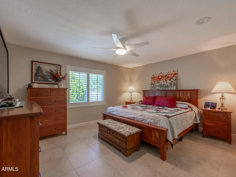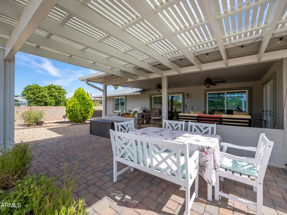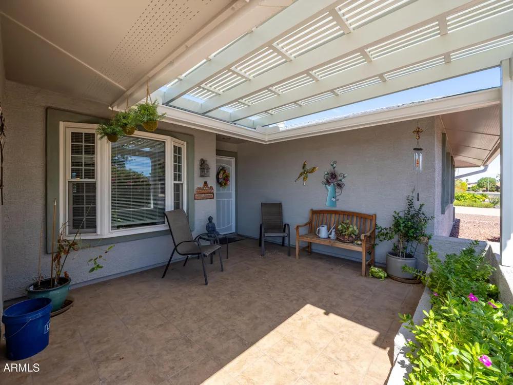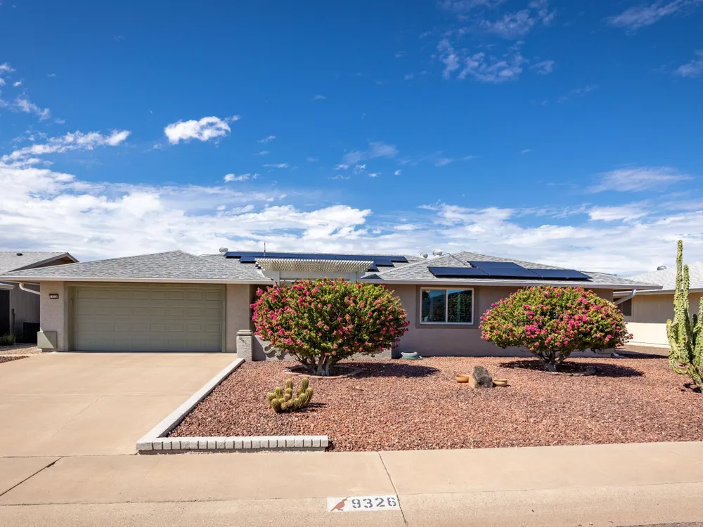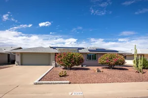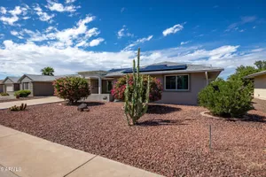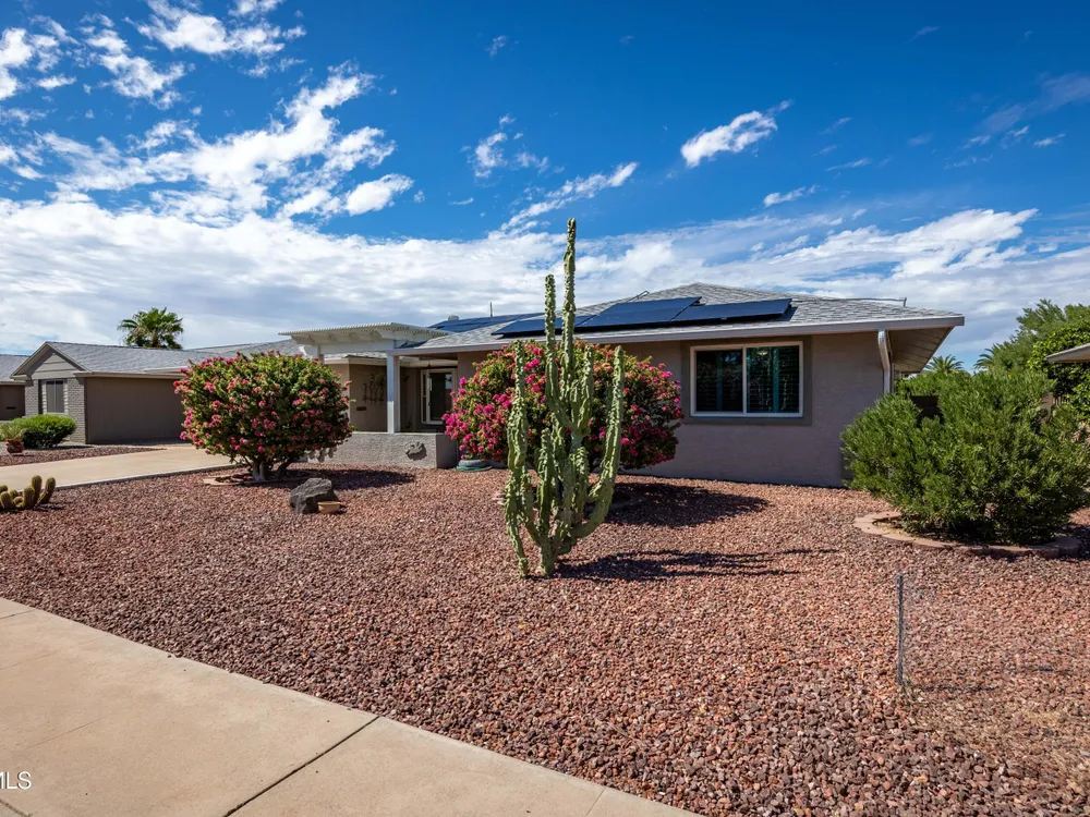 Charming home w/ three bedroom and one and three-quarter bathrooms has approximately 2,140 square feet of living space. The home features excellent curb appeal and an energy-efficient design, including a solar lease, ceiling fans, and dual-pane windows. The exterior is stucco, and has a tiled covered courtyard entrance. Inside, the home has tile flooring throughout. The lighting is LED, and the popcorn ceilings have been removed. The primary suite includes double sinks and a tiled shower, and the second bathroom also has a tiled shower. The vanities are white, providing a clean, modern look. The stunning eat-in kitchen offers granite countertops, cherry wood cabinets, a tiled backsplash, stainless steel appliances, recessed lighting, and a bay window. An expansive Arizona room provides additional living space and room for your favorite hobby. The inside laundry room has attached cabinets for storage, and there is a two-car garage. Beautiful, spacious backyard features block fencing and an extended covered patio with tile flooring and pavers.