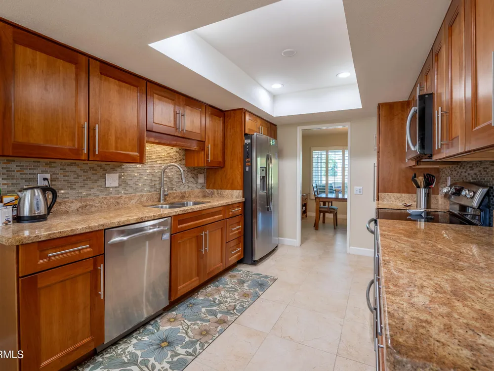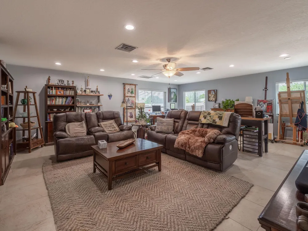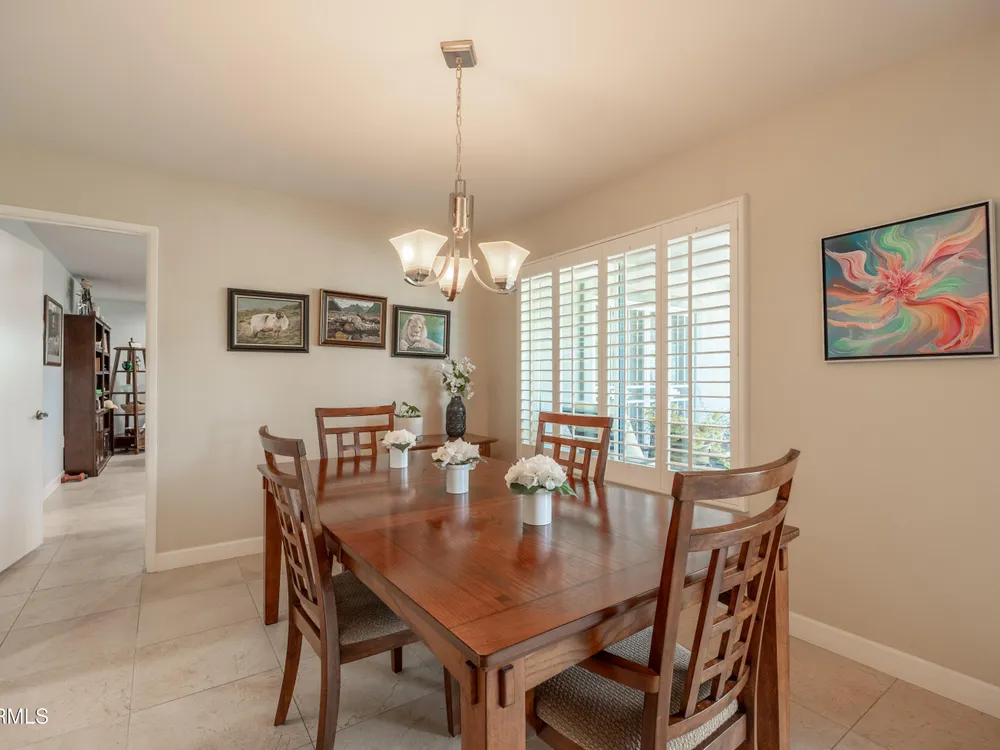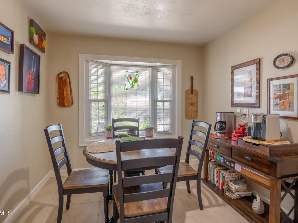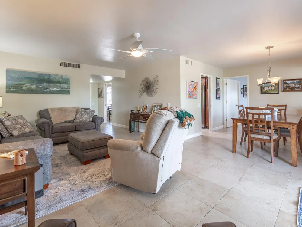 Charming home w/ three bedroom and one and three-quarter bathrooms has approximately 2,140 square feet of living space. The home features excellent curb appeal and an energy-efficient design, including a solar lease, ceiling fans, and dual-pane windows. The exterior is stucco, and has a tiled covered courtyard entrance. Inside, the home has tile flooring throughout. The lighting is LED, and the popcorn ceilings have been removed. The primary suite includes double sinks and a tiled shower, and the second bathroom also has a tiled shower. The vanities are white, providing a clean, modern look. The stunning eat-in kitchen offers granite countertops, cherry wood cabinets, a tiled backsplash, stainless steel appliances, recessed lighting, and a bay window. An expansive Arizona room provides additional living space and room for your favorite hobby. The inside laundry room has attached cabinets for storage, and there is a two-car garage. Beautiful, spacious backyard features block fencing and an extended covered patio with tile flooring and pavers.