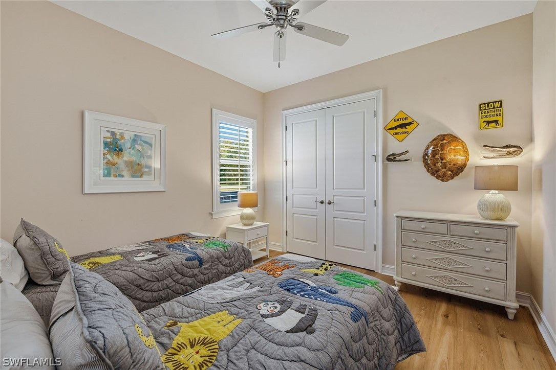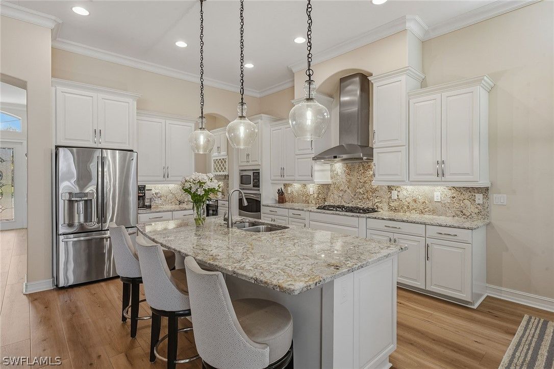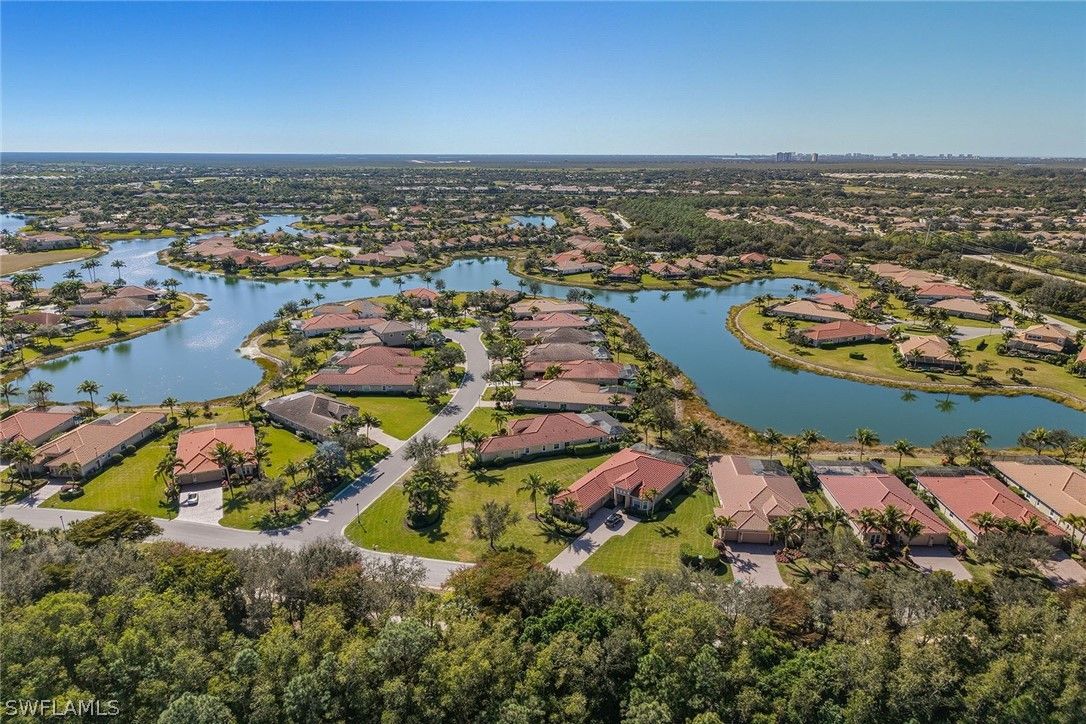 Ideally positioned to capture breathtaking sunsets, this outstanding residence showcases tranquil lake views, creating a serene backdrop for everyday living. On a quiet cul-de-sac in the premier guard-gated community of Fiddler’s Creek, this immaculate home features an open floor plan filled with natural light, soaring ceilings and refined architectural details. The lanai enjoys wide, open water views and is thoughtfully landscaped for privacy, while plantation shutters throughout add timeless style and functionality. Offering three bedrooms plus a study, three-and-a-half baths, including a pool bath, and a three-car garage with ample storage, the home combines comfort and elegance. An extended paver driveway, tile roof, and full impact doors and windows enhance curb appeal and peace of mind. Inside, plank luxury vinyl flooring flows throughout the main living areas, bedrooms and study, complemented by crown molding, coffered ceilings and recessed lighting. The foyer opens to a formal dining area with coffered ceiling detail and arched windows, while the study with glass French doors creates a refined private office retreat. The open kitchen is elegant and functional, featuring granite countertops with full backsplash, white cabinetry, pendant lighting over the island, a walk-in pantry and premium appliances, including a five-burner natural gas cooktop, stainless wall oven and microwave, dishwasher, French door refrigerator and an under-counter wine cooler in the butler’s pantry. The primary suite offers a coffered ceiling, plantation shutters, direct lanai access, and sweeping pool and lake views, along with a spacious walk-in closet with wood shelving. The en-suite bath includes porcelain tile flooring, granite counters, a soaking tub, and a walk-in shower with floor-to-ceiling tile and frameless glass enclosure. Two guest bedrooms with plantation shutters and ceiling fans are served by two well-appointed baths featuring quartz vanities. Outdoor living is effortless on the expansive lanai, fully enclosed with newly upgraded no-see-um screening. The heated saltwater pool and spa with cascading water feature overlook the sparkling lake, while two ceiling fans and a summer kitchen with stainless three-burner gas grill, granite counters and under-cabinet beverage refrigerator make entertaining seamless. Residents enjoy an award-winning, gated community with newly enhanced amenities, including a refreshed resort-style pool, updated Gator Grille and 10 new pickleball courts. The clubhouse offers fitness and spa facilities, tennis, pickleball, dining, and activity and event calendar. Optional memberships with no golf waitlist provide access to the championship course, new clubhouse, marina and beach club. Furnishings are negotiable.