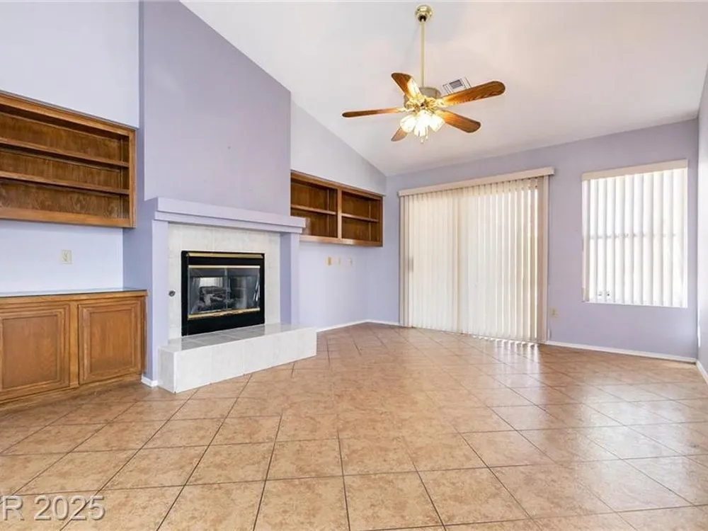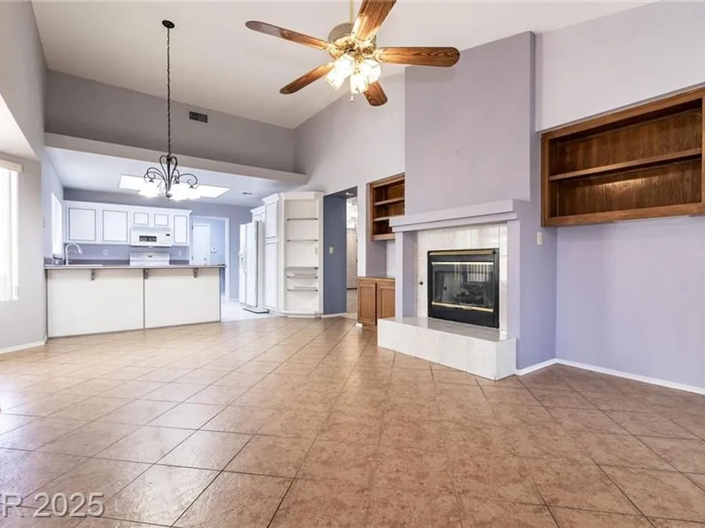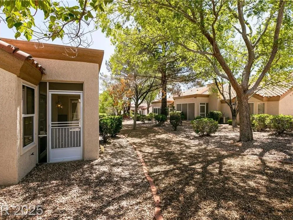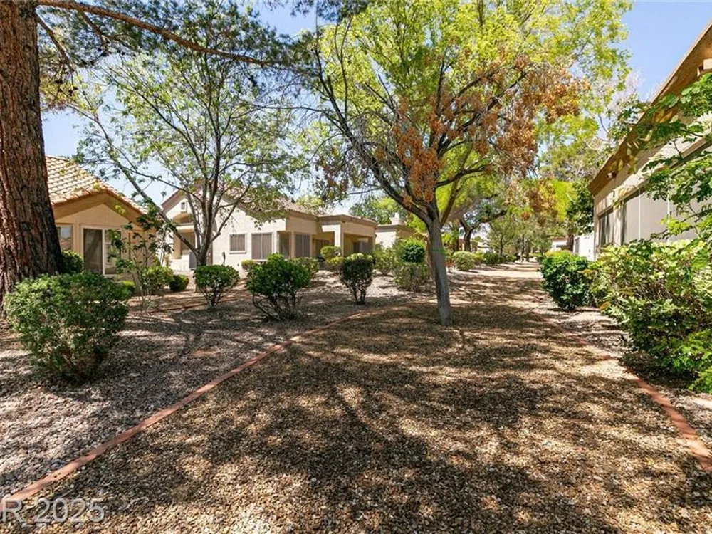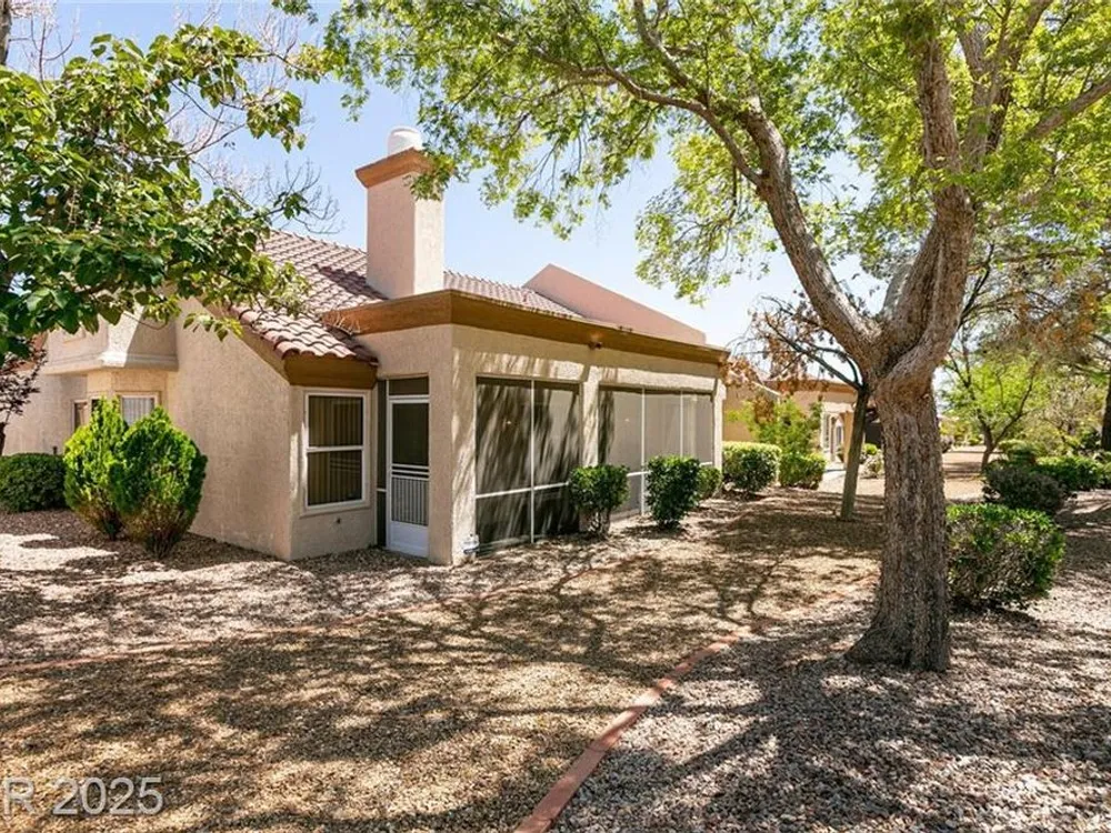 Welcome to the popular 1749 sq, ft Linden model! Through the gate you enter a walkway with blooming plants.As you enter the foyer you will marvel at the dramatic vaulted ceilings that overlook the living room with a gas fireplace with its beautiful hearth seat and mantel. This room opens through sliding doors to a screened in patio.. There is a separate space adjacent to the living area for your dining room furniture under the chandelier.. To the right is the tiled large Nevada Room with it's own fireplace and two sets of built-in bookshelves.There is room for casual dining next to the bay window. In the adjacent kitchen with it's dramatic solid countertops and cabinets with crown molding design you will find convenient pull-out cabinets. A special extra is an office space which takes the place of the golf cart ramp. It has granite counters and overhead cabinets. Primary bathroom has a huge walk-in closet with shelving.The garage boasts built-in cabinets. .