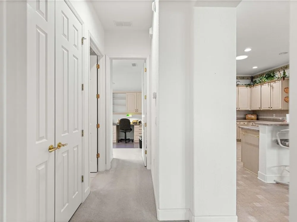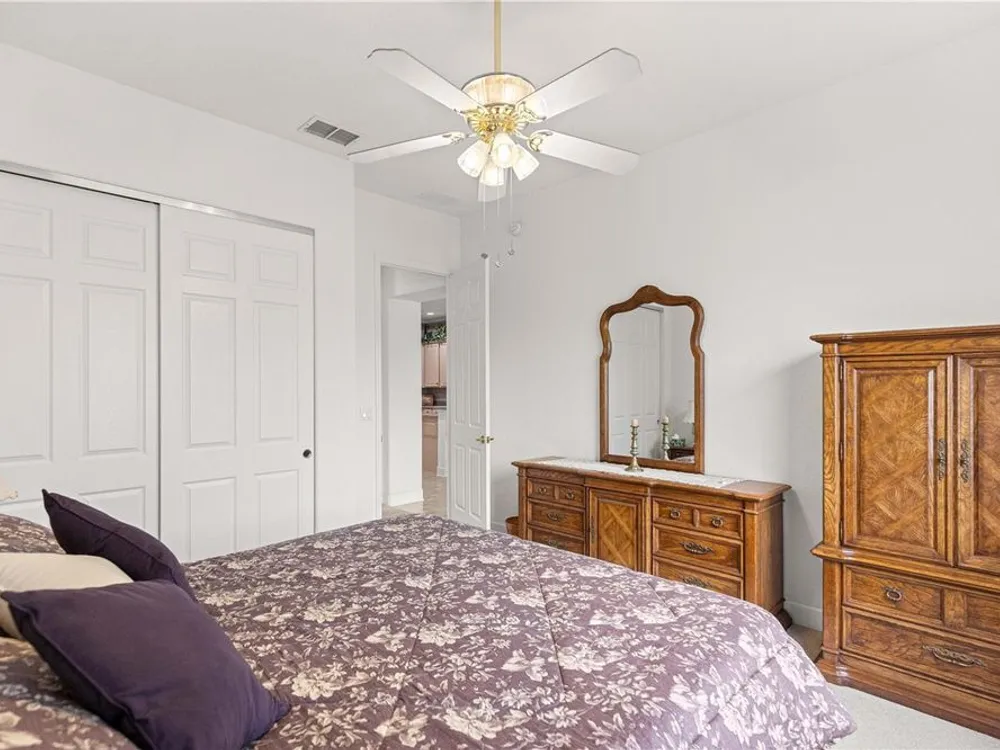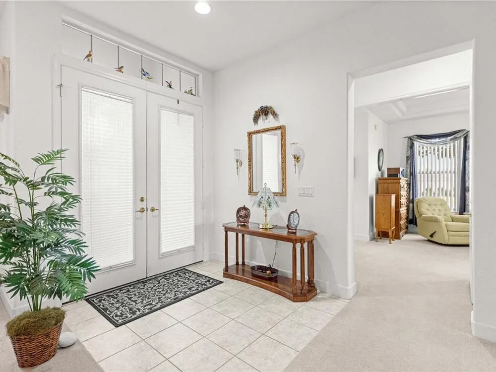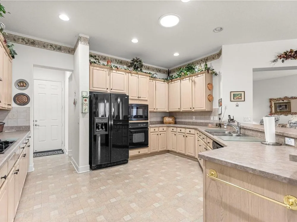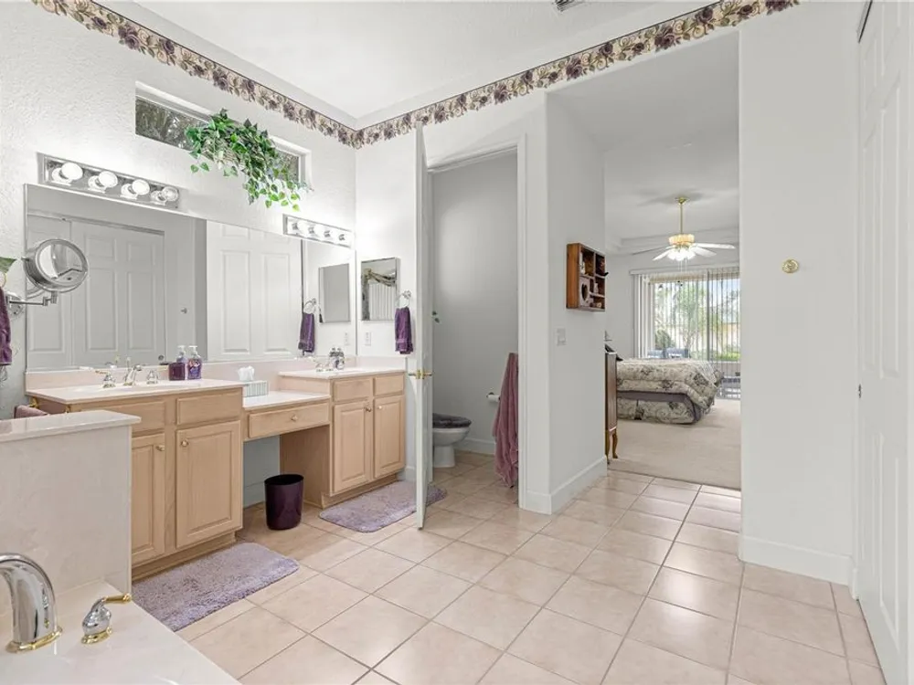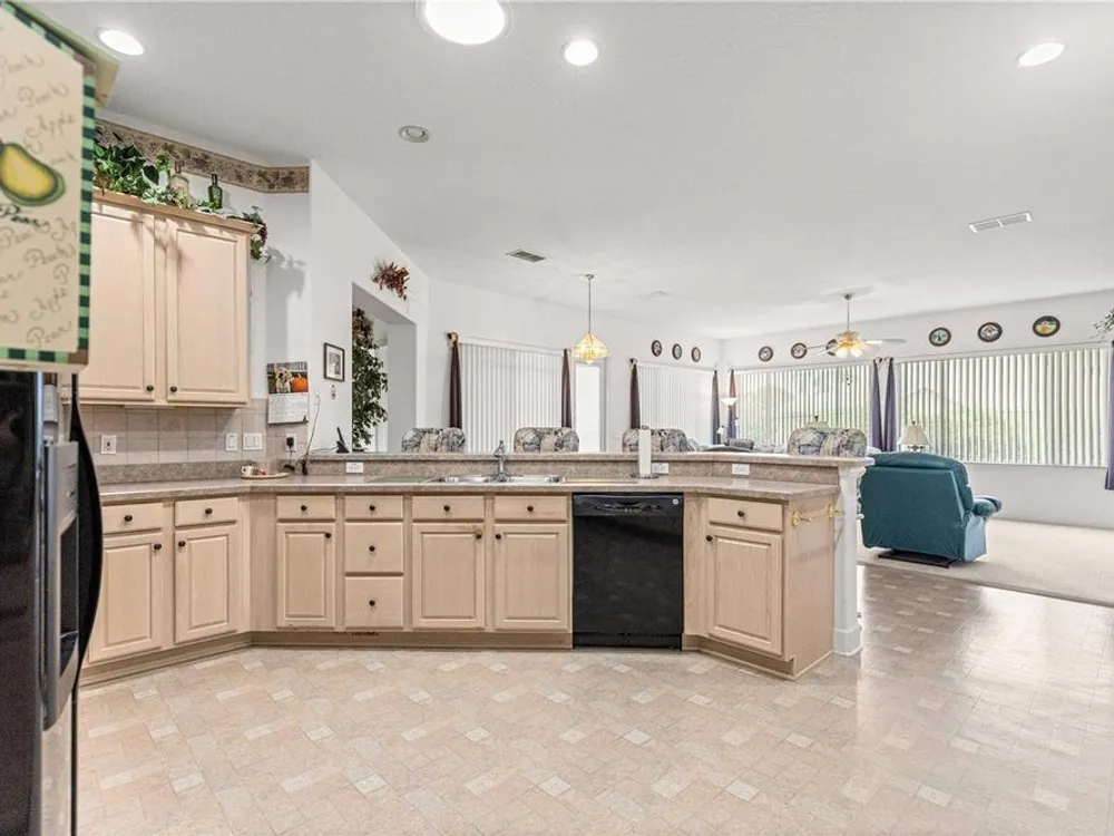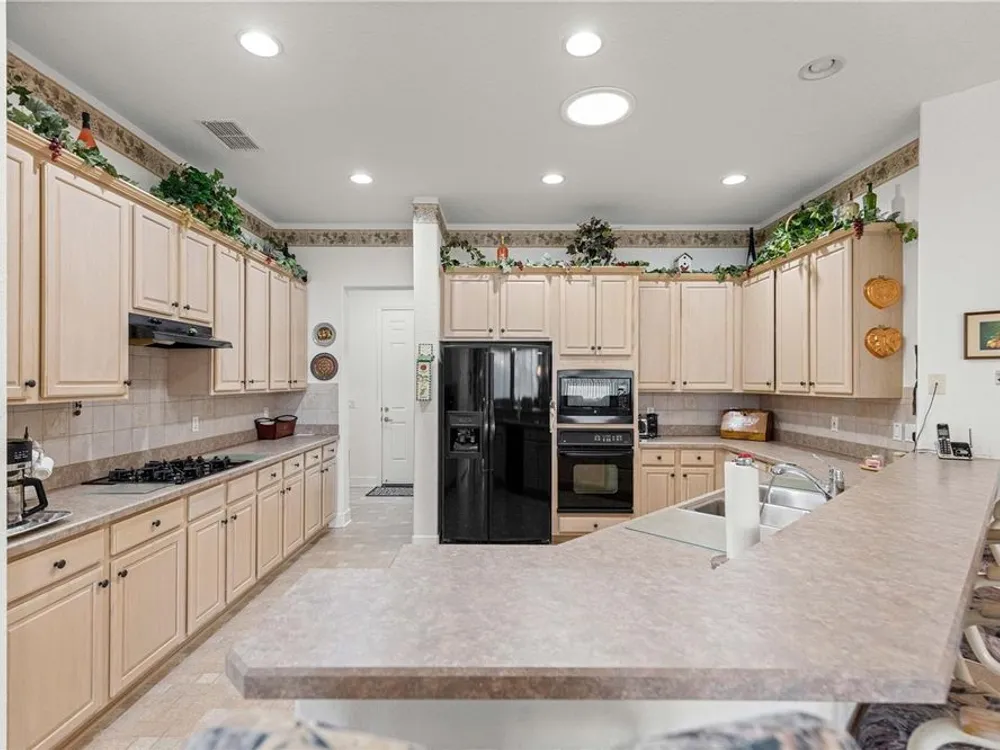 Luxurious Hampton model boasts French glass double French doors leading into a spacious formal dining room and formal living room. Large gourmet kitchen with skylight and built-in oven and gas stove top, open floor plan with great room. Three-bedroom split floor plan, one of the guest bedrooms has a built-in desk area. Primary bedroom has tray ceilings and primary bath is roomy with garden tub and shower, double sinks and window. Inside laundry room with sink and extra cabinets with countertop. All of the doors in this model are 9 ft doors with high ceilings making this home look grand. The 1/2 bath off of the entry is a plus not found in many of the community models. Garage is extended in length and width giving space for a workshop or golf cart parking. Electric screen on garage door. Driveway and sidewalk are brick pavers adding to the upgraded curb appeal of this spacious home with beautiful landscaping. Double sized lanai is screened with a large exterior patio that has exterior piping for a gas grill. A real plus this home comes with a well for irrigation. Roof re-shingled 2014 and HVAC replaced 2014. Home is centrally located in the St. Andrews section, close to the clubhouse, pro-shop, restaurant with easy access to main Del Webb Blvd with cart path and sidewalk. The Del Webb community is loaded with amenities and activities to enjoy your new lifestyle. Call for a private showing, a must see.