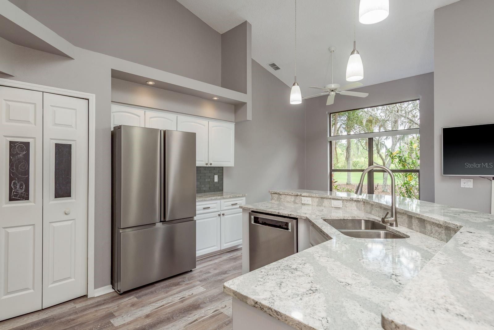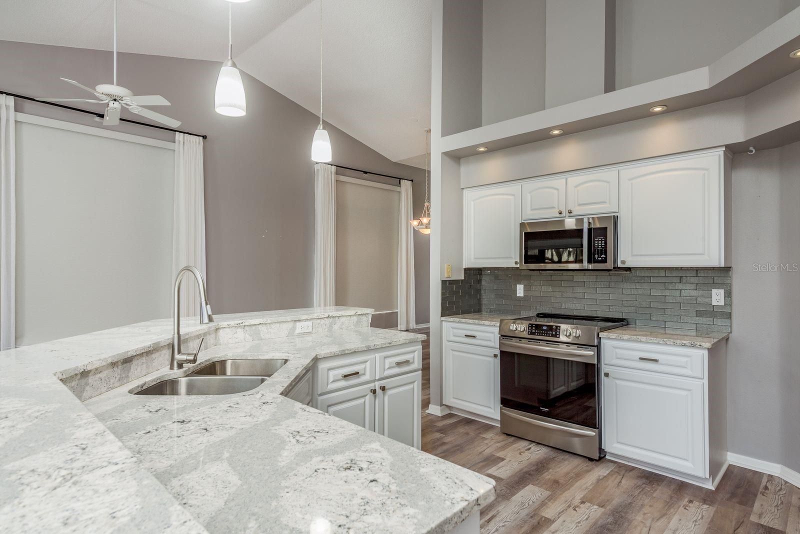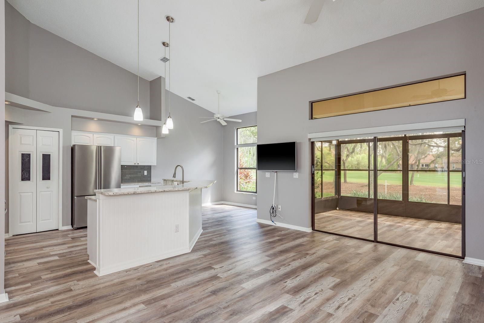 - Cathedral Ceiling(s), Ceiling Fan(s), Eat-in Kitchen, High Ceilings, Kitchen/Family Room Combo, Living/Dining Room, Open Floorplan, Solid-Wood Cabinets, Split Bedrooms, Stone Counters