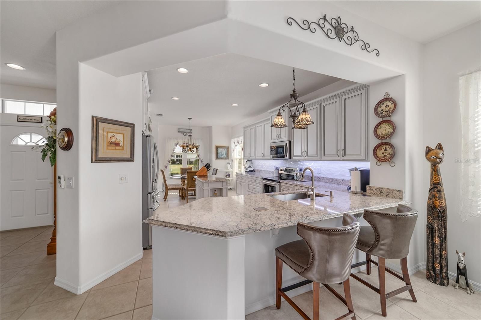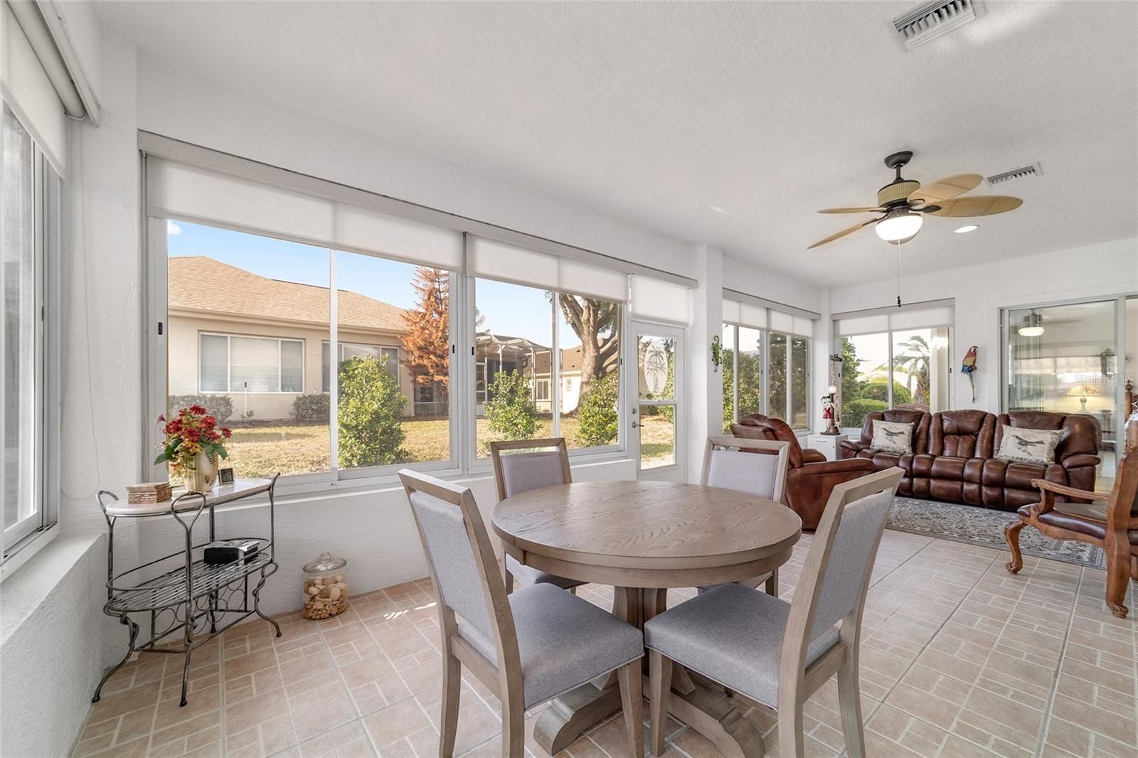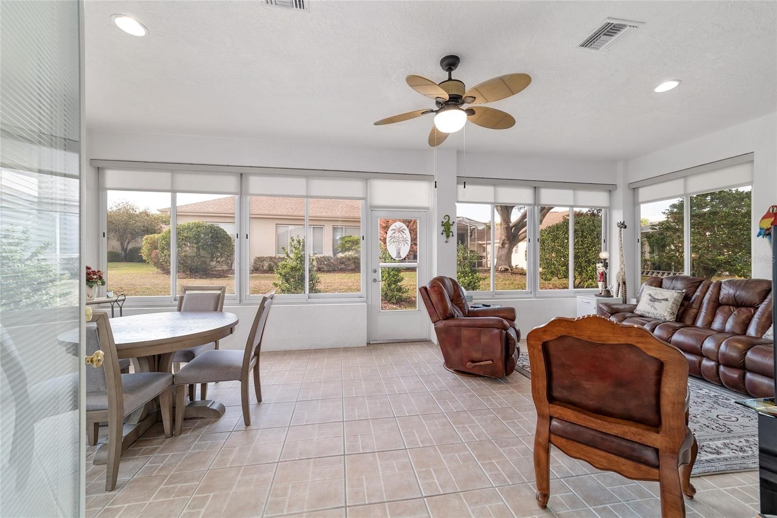 Move-in ready and highly sought-after Santa Rosa floor plan offering 2 bedrooms, 2 baths, plus a versatile den—PLUS an impressive 432 sq ft enclosed Florida room. This beautifully finished space is insulated, climate-controlled, and features French doors off the living room, creating the perfect year-round retreat. Step inside to a spacious living room highlighted by a cozy gas fireplace with mantel and accent lighting, flowing seamlessly into a large formal dining area—ideal for entertaining. The remodeled kitchen is a standout, featuring KraftMaid wood cabinetry with soft-close doors and pull-out shelving, stainless steel appliances, quartz countertops, two pantry cabinets, under-cabinet lighting, a tiled backsplash, and a center island. The bright dinette area surrounded by windows fills the space with natural light. The primary suite is generously sized with a charming bay window, while the updated en-suite bath (2021) offers new cabinetry and a walk-in, roll-in shower. New double-hung windows (2021) with transferable lifetime warranty, Extended 29-ft deep garage with insulation and ventilation, Two solar attic fans and a garage vent fan Outdoor living is just as inviting with a paver patio, walkway, and a 14-ft electric retractable SunSetter awning—perfect for enjoying the spacious backyard. Generac whole-house generator (2020), Roof (2020), Water heater (2019), HVAC (2016), Paver driveway and sidewalk (2022. AWARD-WINNING Del Webb Spruce Creek Golf & Country Club is a GATED, 3,250 home, +55 Community with over 70 clubs, 3 pools, 3 spas, a Clubhouse, a Fitness Center, Bocce Ball, Shuffleboard, 12 Pickle ball Courts, 7 Tennis Courts, Sand Volleyball, Water Volleyball, Lake Vista Gazebo, Pavilions, Walking Paths and so much more! Come see this beautiful community with a GORGEOUS Tree Canopy on the Boulevard and its Restaurant, Liberty Grille. Come, enjoy the four (4) 9-hole Golf Courses today and begin living your BEST LIFE! DON'T WAIT TO SEE THIS SHOW QUALITY HOME! This home truly combines comfort, quality upgrades, and thoughtful design—ready for you to move in and enjoy.
