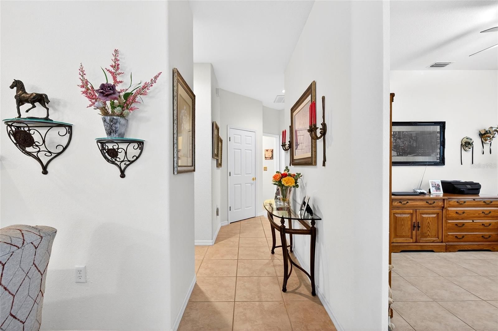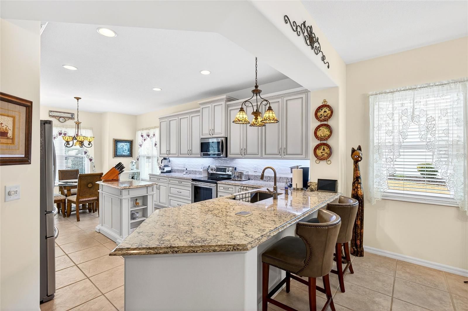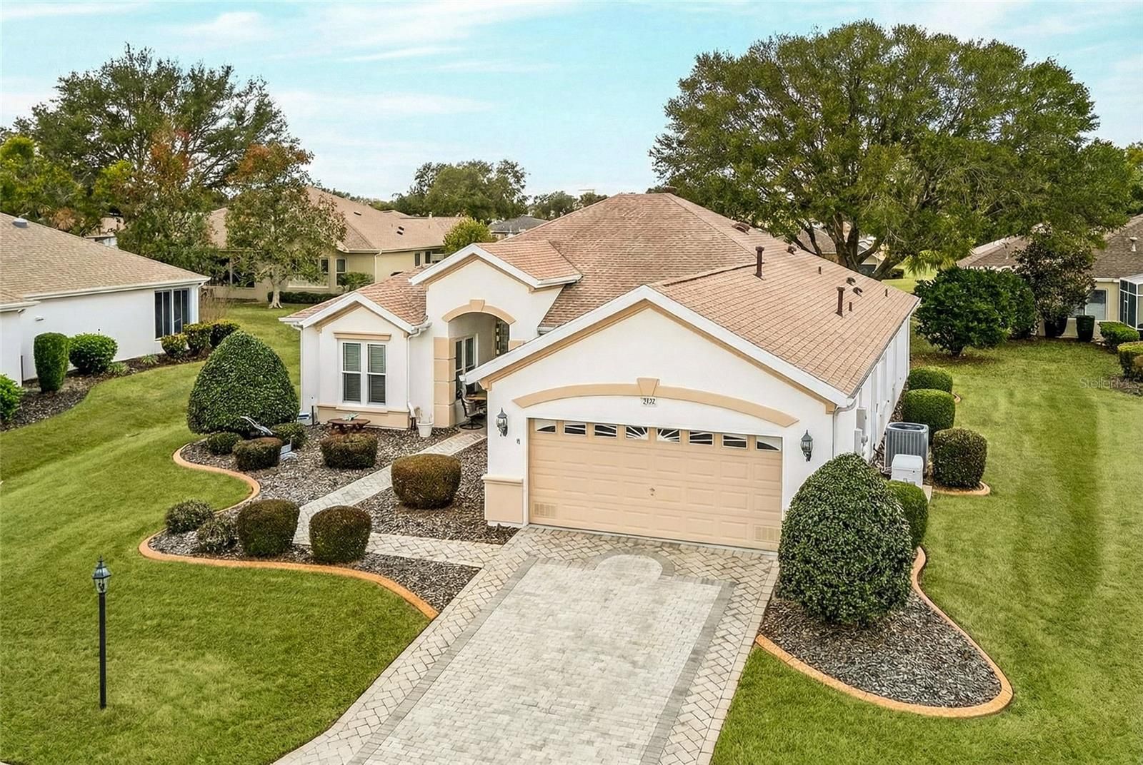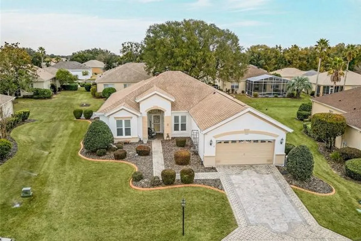 One or more photo(s) has been virtually staged. THE INCREDIBLE GATED SPRUCE CREEK BY DEL WEBB WITH RESORT STYLE AMENITIES!! THIS SANTA ROSA MODEL WILL BE THE REASON YOU WANT TO CALL SPRUCE CREEK COUNTRY CLUB YOUR HOME! FROM THE MOMENT YOU DRIVE UP YOU ARE GREETED WITH TRUE PRIDE OF OWNERSHIP STARTING WITH THE CUSTOM PAVER DRIVEWAY AND WALKWAY TO FRONT DOOR WITH 2021 STORM DOOR, CURBED LANDSCAPING AND WELL MAINTAINED LANDSCAPING. THE FRONT COVERED ENTRY LEADS TO THIS MAGICAL OPEN FLOOR PLAN FEATURING 2021 RENOVATED KITCHEN A SHOW STOPPER WITH QUARTZ COUNTERTOPS, CUSTOM KRAFTSMAID CABINETRY WITH SOFT DOORS AND DRAWERS, PULL OUTS DESIGNED TO MAKE IT EASY TO GET TO THOSE ITEMS IN BACK OF CABINETS WITH EASE. UNDER COUNTER LIGHTS, STAINLESS STEEL APPLIANCES AND PENINSULA ISLAND. TILE BACKSPLASH AND UNDERMOUNT STAINLESS STEEL SINK COMPLETE THIS MASTERPIECE. THE BREAKFAST AREA HAS PICTURESQUE WINDOWS. SPACIOUS LIVING ROOM WITH GAS FIREPLACE FOR THOSE COLD RARE FLORIDA NIGHTS. DINING ROOM IN CENTER OF HOME OVERLOOKS THE LIVING ROOM AND GORGEOUS KITCHEN. SURROUND SOUND FOR ENTERTAINMENT, 2021 DOUBLE HUNG WINDOWS WITH TRANSFERABLE LIFETIME WARRANTY. TO RIGHT OF ENTRY IS THE DEN/OFFICE , 2ND BEDROOM AND BATH FOR GUESTS. INSIDE LAUNDRY ROOM WITH WASHER/ DRYER AND STORAGE. DOWN THE HALL IS IMPRESSIVE LARGE PRIMARY BEDROOM WITH BAY WINDOW,PRIMARY BATH FEATURING WALK IN/ROLL IN SHOWER, DOUBLE VANITY 2021. PRIMARY STEPS OUT TO COVERED AND ENCLOSED UNDER AIR FLORIDA ROOM WITH TONS OF NATURAL LIGHT. STEP OUTSIDE TO EXTENDED PAVER PATIO WITH AUTOMATIC 14 FOOT CUSTOM SUN SETTER AWNING FOR SHADE. 29 FOOT EXTENDED GARAGE FOR EXTRA ROOM, 2 ATTIC SOLAR FANS, GARAGE DOOR INSULATION, NEW ROOF 2020, HVAC 2016, HOT WATER 2019, WHOLE HOME NATURAL GAS GENERATOR. ALL DREAMS ARE A REALITY IN THIS SANTA ROSA!