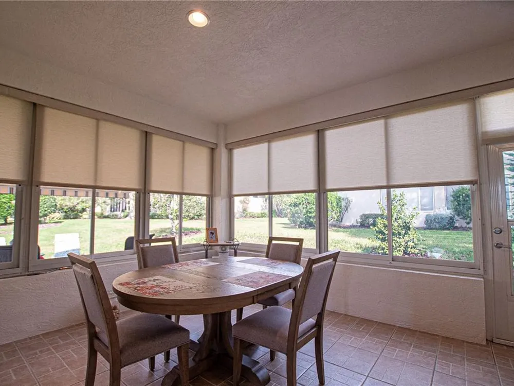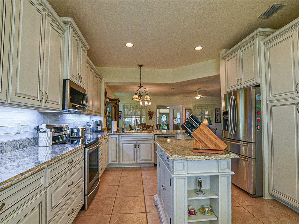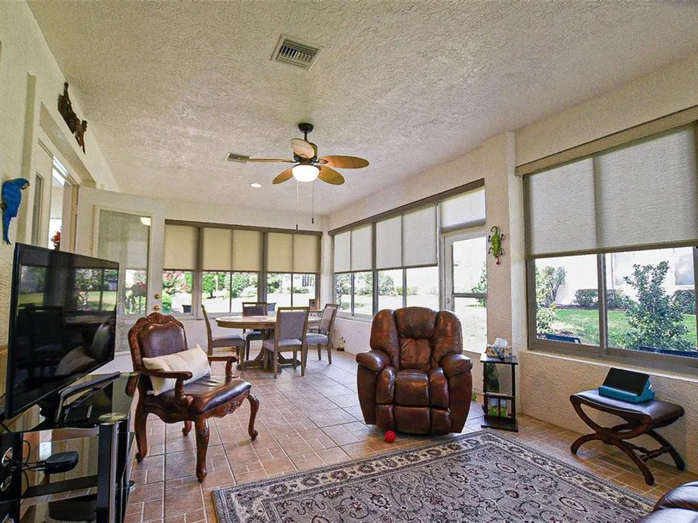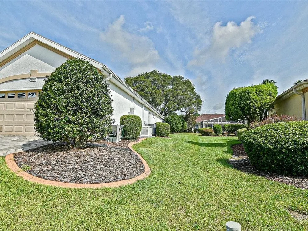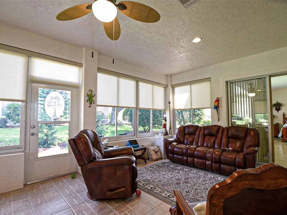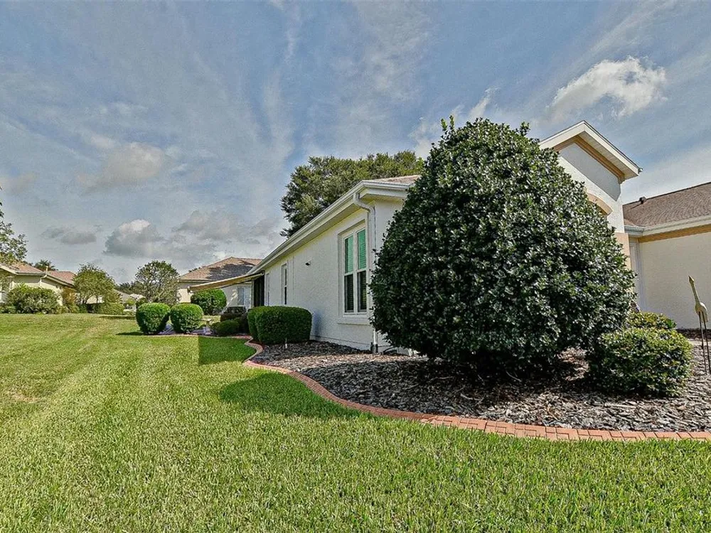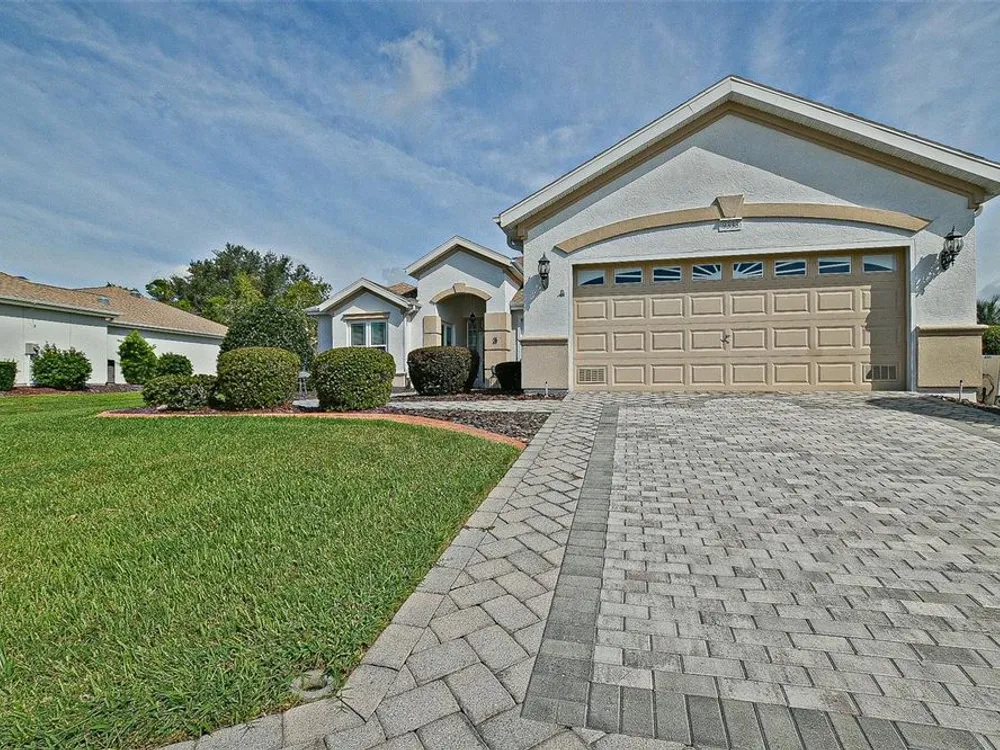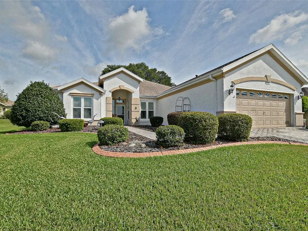 Move in ready and highly popular Santa Rosa floor plan, boasts 2 bedrooms, 2 baths and a den plus an enlarged (432 sf) Florida room enclosed, insulated, with knee wall, and under heat and air with French doors off of the living room. Driveway and sidewalk pavers were redone and sealed in 2022 and storm door added (2021) Enter the spacious living room, that has a gas fireplace with eyeball light and mantel and large formal dining room. Remodeled spacious kitchen with KraftMaid wood cabinets, with pull out shelving and soft close doors and stainless-steel appliances. Two pantry cabinets and under cabinet lighting. Quartz countertops on counters and center island. Tiled backsplash and 14-gauge stainless steel under counter sink round out this beautiful kitchen with dinette area and loads of windows for natural light. The primary bedroom is super large and has a bay window and add to that the primary bath is remodeled with walk in, roll in shower and new cabinets in 2021. 5 surround sound speakers throughout the home and a welcoming guest bedroom plus a den round out the features of this beautiful home. New double hung windows installed in 2021 with a lifetime warranty transferrable to new owners. Extended deep (29 ft) garage with garage door insulation and vents, 2 solar attic fans and garage vent fan. The back patio has pavers and a walkway plus a 14 ft electric retractable Sun Setter awning to enjoy the large back yard. All of this plus a Generac whole house generator (2020) Roof re-shingled (2020) HVAC (2016) Hot water heater (2019). Come view this beautiful move in ready home today and start enjoying the lifestyle of Del Webb's Spruce Creek Golf and Country Club.