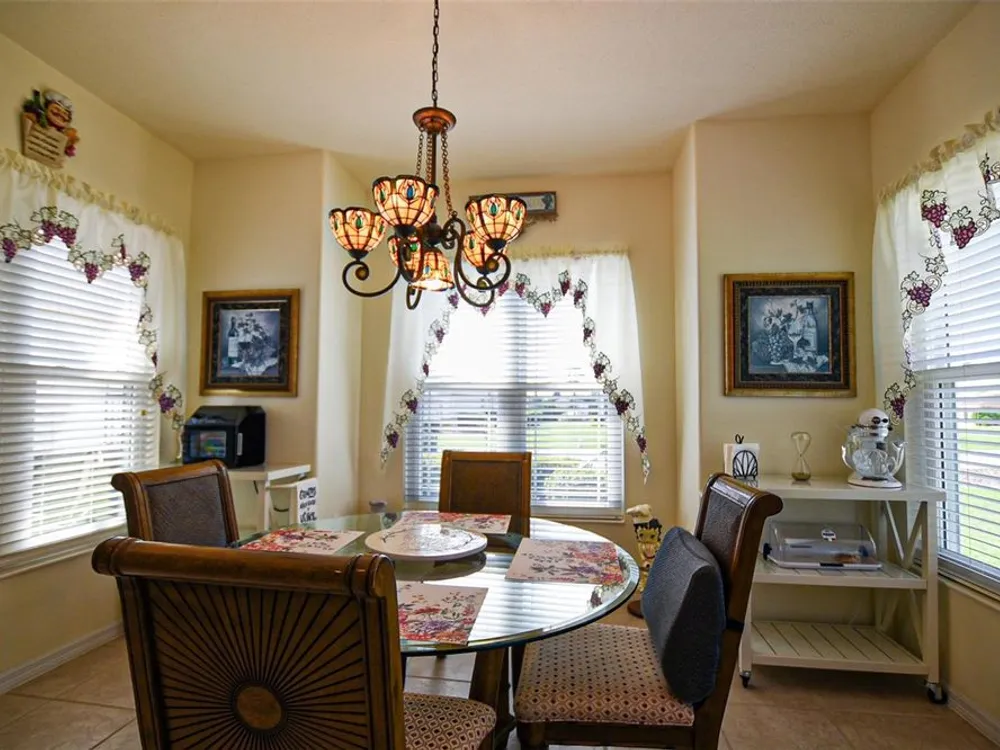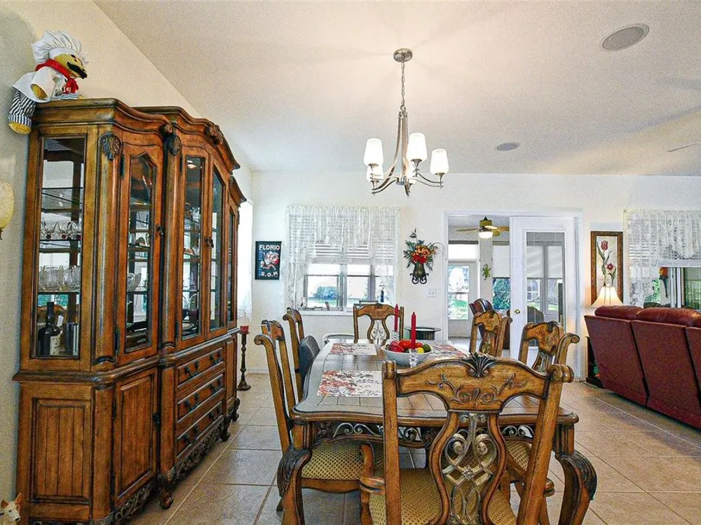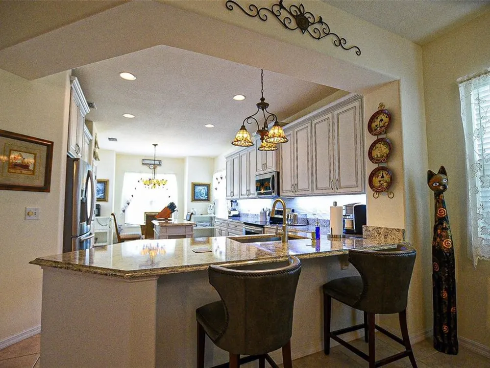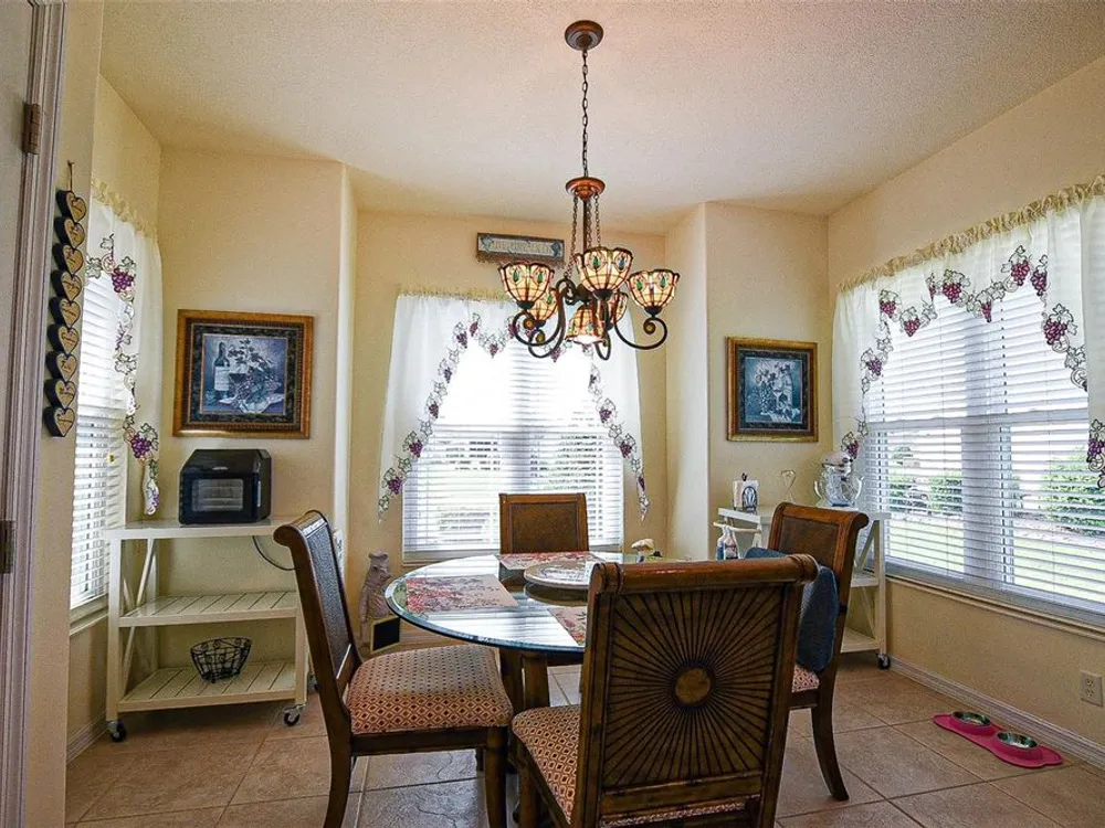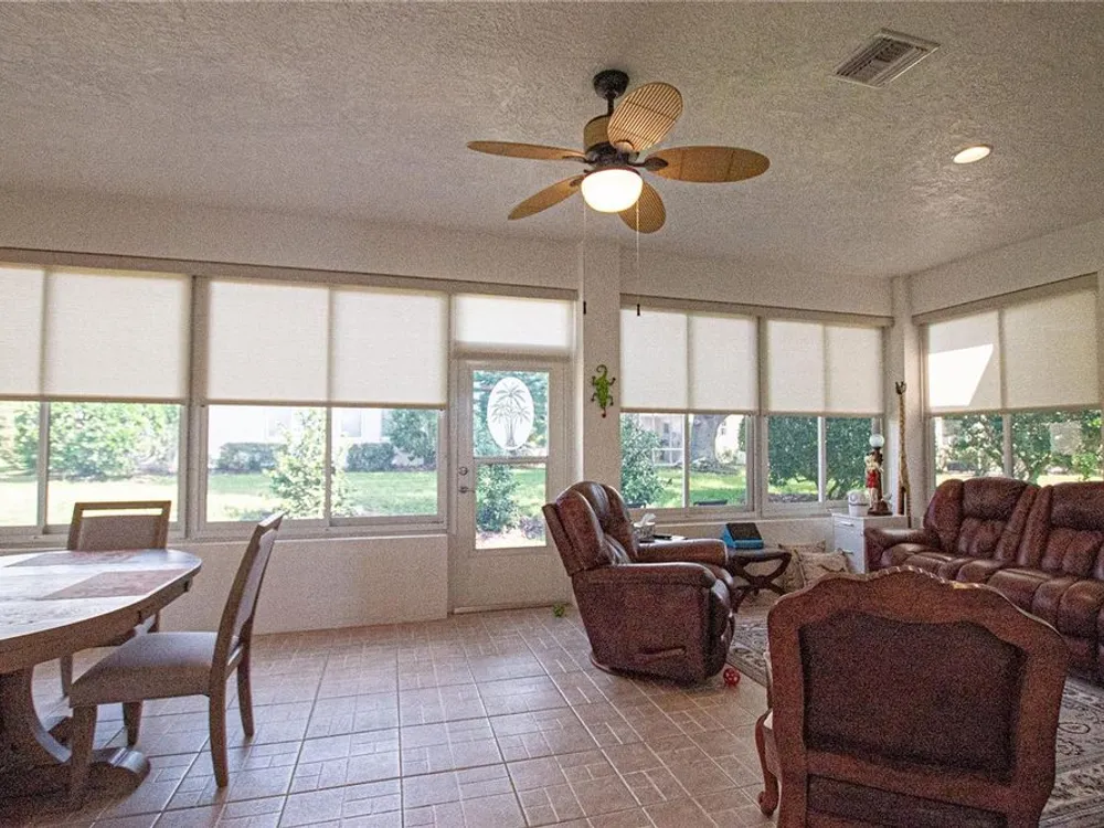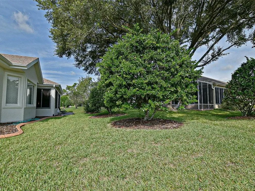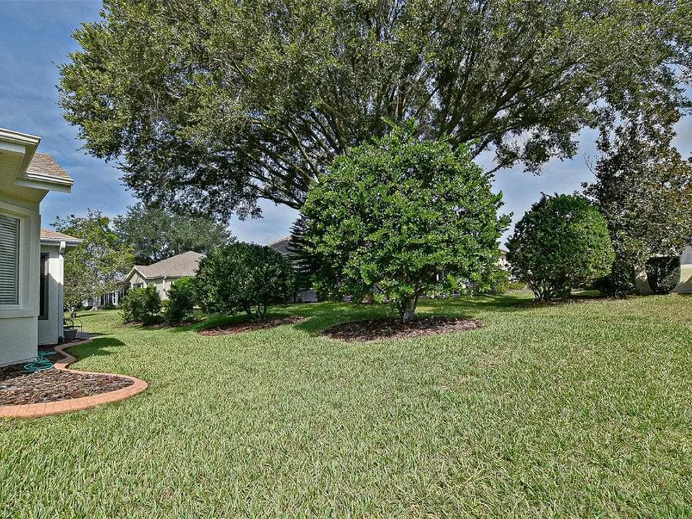 Move in ready and highly popular Santa Rosa floor plan, boasts 2 bedrooms, 2 baths and a den plus an enlarged (432 sf) Florida room enclosed, insulated, with knee wall, and under heat and air with French doors off of the living room. Driveway and sidewalk pavers were redone and sealed in 2022 and storm door added (2021) Enter the spacious living room, that has a gas fireplace with eyeball light and mantel and large formal dining room. Remodeled spacious kitchen with KraftMaid wood cabinets, with pull out shelving and soft close doors and stainless-steel appliances. Two pantry cabinets and under cabinet lighting. Quartz countertops on counters and center island. Tiled backsplash and 14-gauge stainless steel under counter sink round out this beautiful kitchen with dinette area and loads of windows for natural light. The primary bedroom is super large and has a bay window and add to that the primary bath is remodeled with walk in, roll in shower and new cabinets in 2021. 5 surround sound speakers throughout the home and a welcoming guest bedroom plus a den round out the features of this beautiful home. New double hung windows installed in 2021 with a lifetime warranty transferrable to new owners. Extended deep (29 ft) garage with garage door insulation and vents, 2 solar attic fans and garage vent fan. The back patio has pavers and a walkway plus a 14 ft electric retractable Sun Setter awning to enjoy the large back yard. All of this plus a Generac whole house generator (2020) Roof re-shingled (2020) HVAC (2016) Hot water heater (2019). Come view this beautiful move in ready home today and start enjoying the lifestyle of Del Webb's Spruce Creek Golf and Country Club.