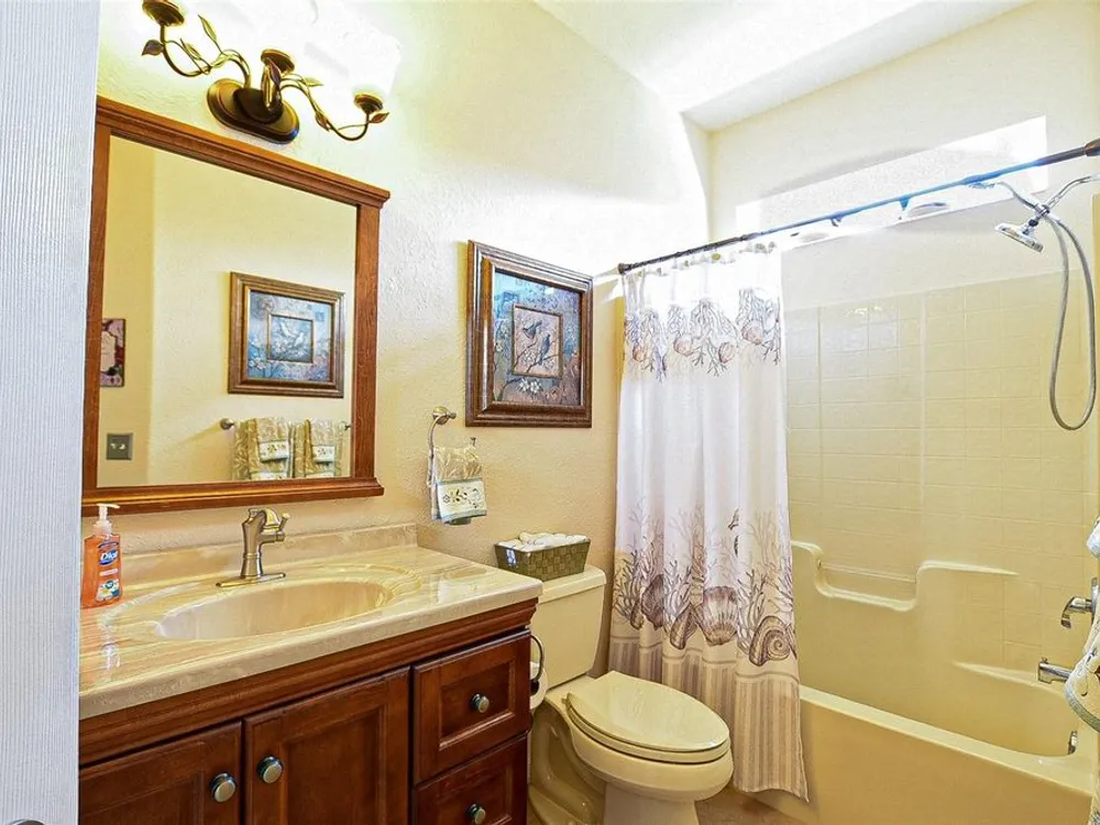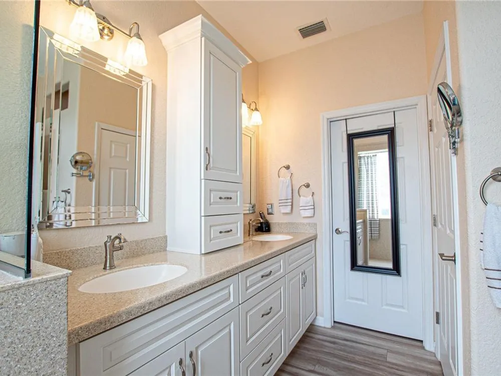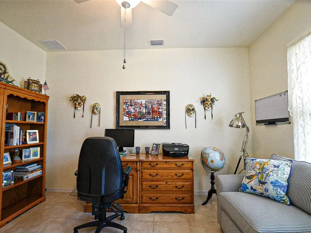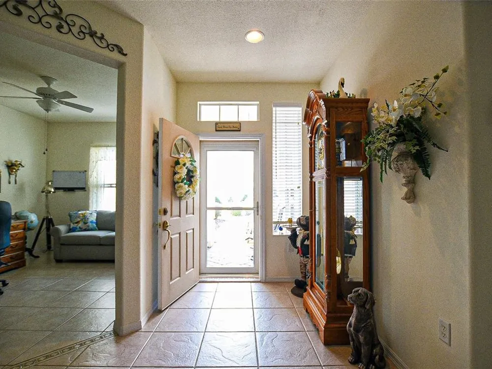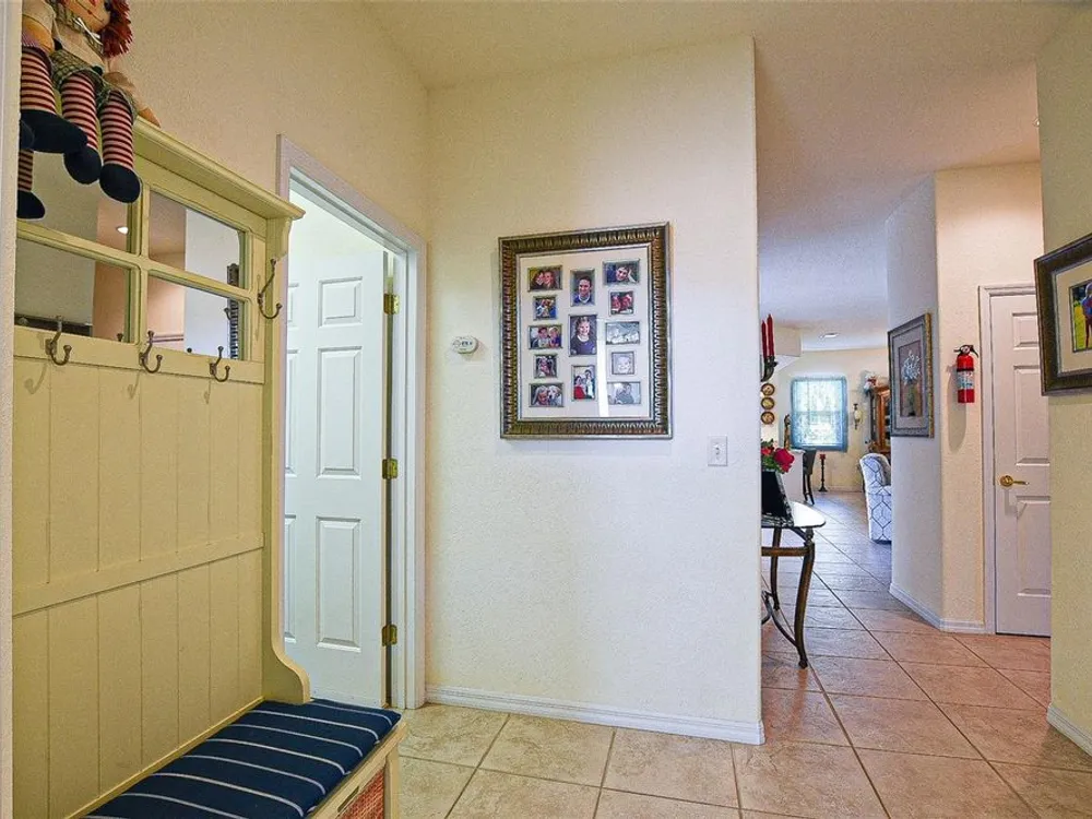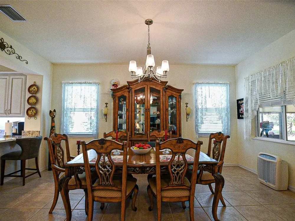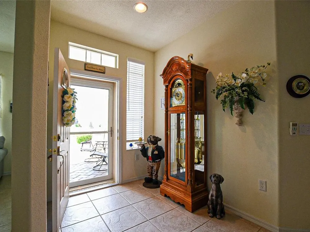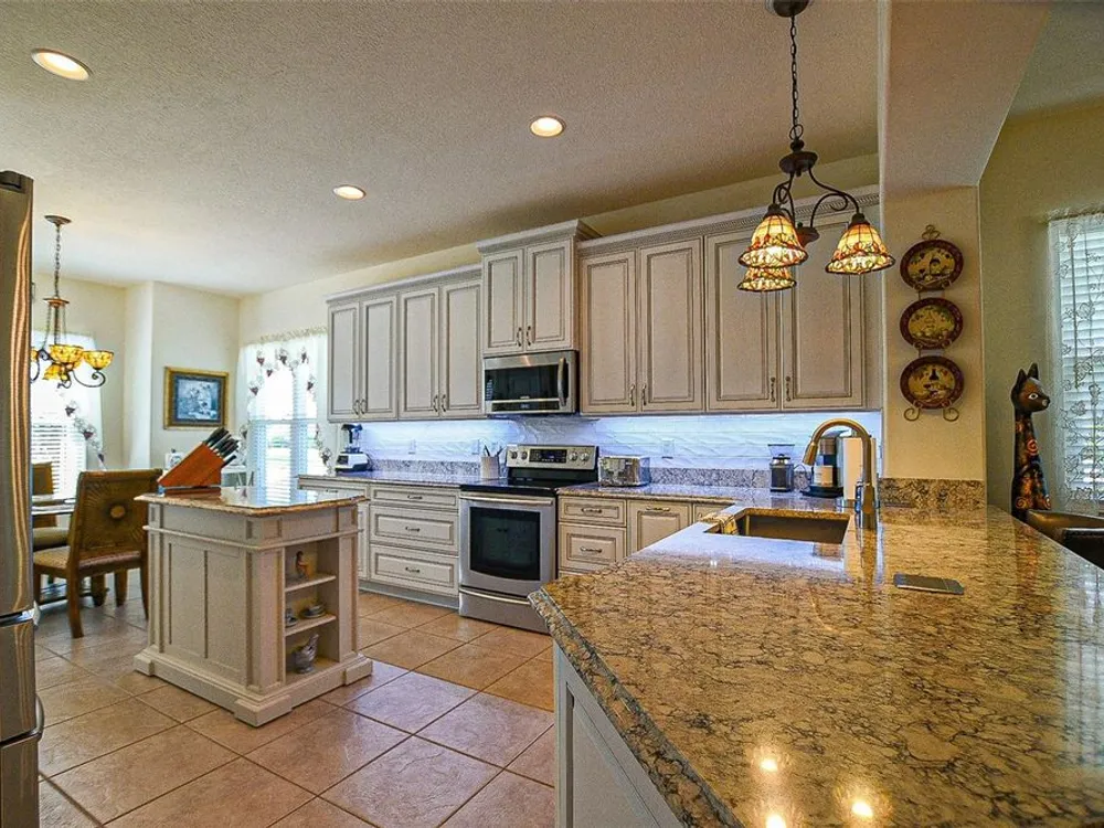 Move in ready and highly popular Santa Rosa floor plan, boasts 2 bedrooms, 2 baths and a den plus an enlarged (432 sf) Florida room enclosed, insulated, with knee wall, and under heat and air with French doors off of the living room. Driveway and sidewalk pavers were redone and sealed in 2022 and storm door added (2021) Enter the spacious living room, that has a gas fireplace with eyeball light and mantel and large formal dining room. Remodeled spacious kitchen with KraftMaid wood cabinets, with pull out shelving and soft close doors and stainless-steel appliances. Two pantry cabinets and under cabinet lighting. Quartz countertops on counters and center island. Tiled backsplash and 14-gauge stainless steel under counter sink round out this beautiful kitchen with dinette area and loads of windows for natural light. The primary bedroom is super large and has a bay window and add to that the primary bath is remodeled with walk in, roll in shower and new cabinets in 2021. 5 surround sound speakers throughout the home and a welcoming guest bedroom plus a den round out the features of this beautiful home. New double hung windows installed in 2021 with a lifetime warranty transferrable to new owners. Extended deep (29 ft) garage with garage door insulation and vents, 2 solar attic fans and garage vent fan. The back patio has pavers and a walkway plus a 14 ft electric retractable Sun Setter awning to enjoy the large back yard. All of this plus a Generac whole house generator (2020) Roof re-shingled (2020) HVAC (2016) Hot water heater (2019). Come view this beautiful move in ready home today and start enjoying the lifestyle of Del Webb's Spruce Creek Golf and Country Club.
