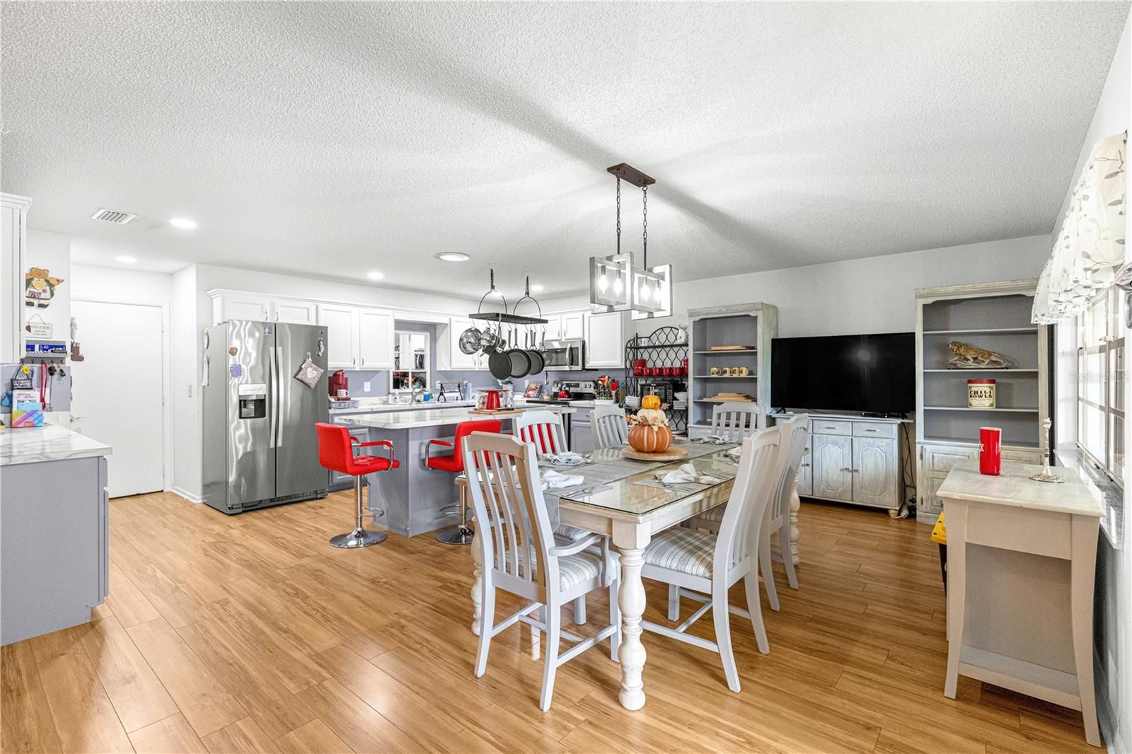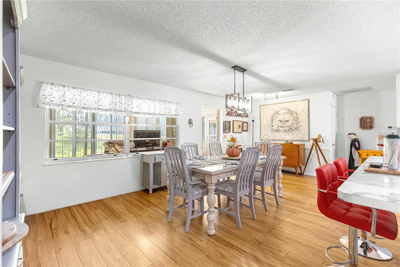 This spacious, end unit Bostonian is located in the much sought after 55+ golf community of On Top of the World. Plenty of privacy! A large front porch perfect for having your morning coffee and saying hello to your neighbors on this quiet street. Roof is a 2023 and HVAC is a 2015. Once inside, you will immediately notice there is NO carpet in the home. There is the comfortable sized living room. Then you will enter into the chef's dream of a kitchen. With a multitude of resurfaced dual toned cabinets making so much space for storage, abundant counter tops and a large island/bar. Newer stainless-steel appliances. The wide-open Florida room makes this a great space for entertaining family and friends! There is an additional screened in lanai with private views. A large primary bedroom with a walk-in closet. Primary bath has a step-in shower with rain glass and updated vanity. The second bedroom is currently used as an office, and second bath features a tub/shower combo. The two car garage also houses your washer & dryer and an extra refrigerator. Don't wait to make your appointment to view today!
