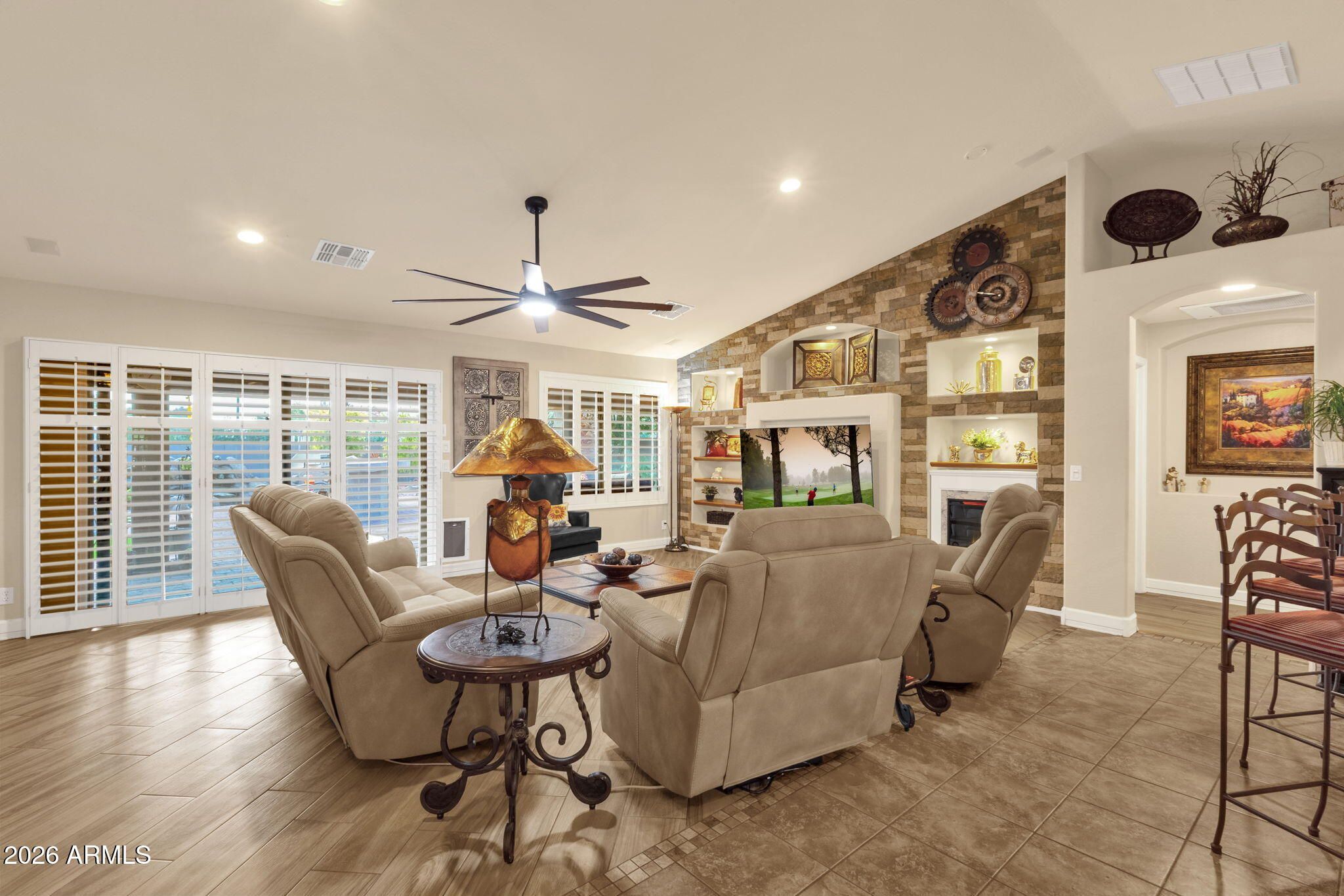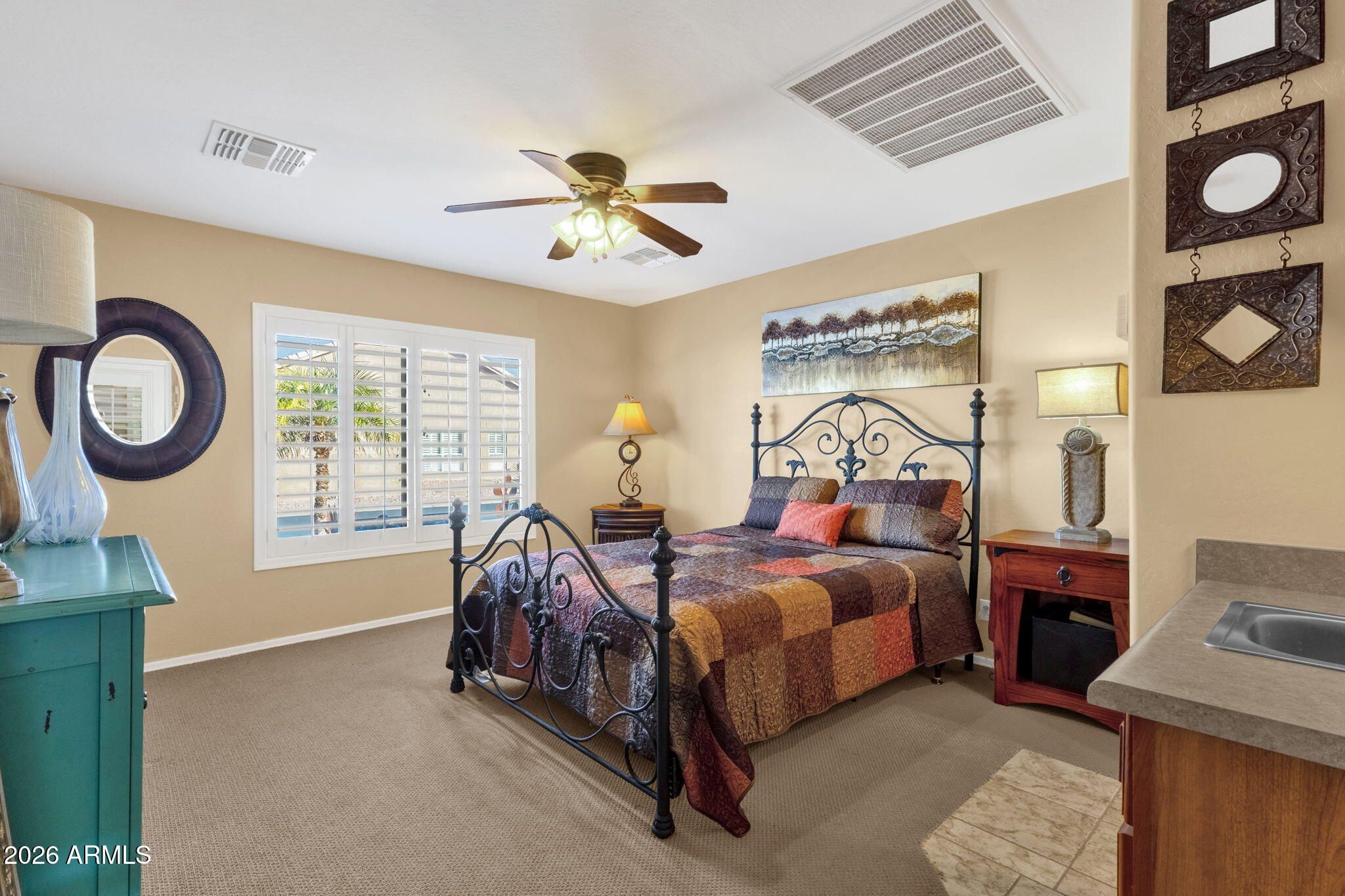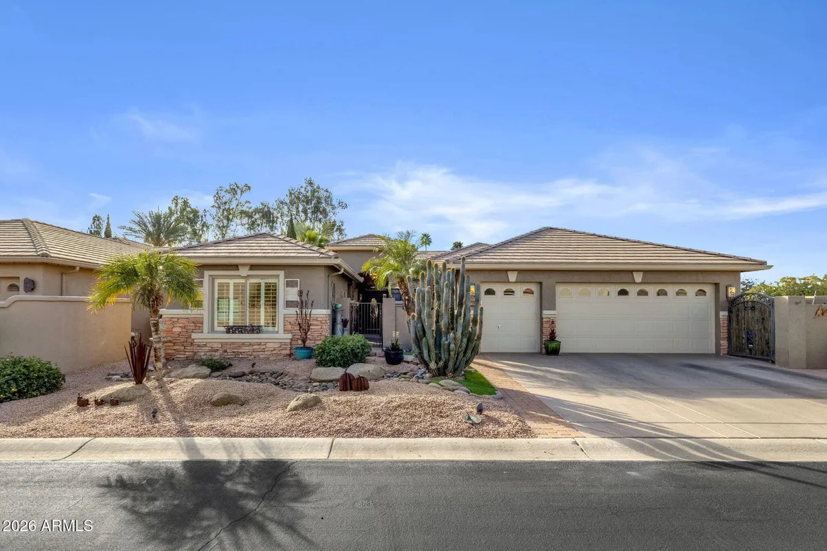 Very special and unique home located on an over 8,000 square foot lot with no homes behind you or to the West in the Active Adult Community of Sun Lakes. This ''Palmera'' model home features a spacious great room with vaulted ceilings, 2 bedrooms, 2 baths, and a detached one-bedroom Casita, perfect for guests or family, located in the courtyard at the home. The eat-in kitchen with breakfast bar has upgraded granite counters, special backsplashes, pullouts, stainless appliances, upgraded cabinets, and overlooks the great room. The perfect area for the person who loves to cook and entertain. This split floorplan home has tiled flooring throughout, designer new interior paint, shutters throughout, electric fireplace, three car garage, and so much more. The large master bedroom suite with its own bath features a walk-in shower, double sinks, and spacious built-in closet. You will enjoy the large backyard with water feature, outdoor built-in BBQ, seating area with gas firepit, full length covered patio, making it the perfect area to relax or entertain. Come enjoy all this community has to offer from golf, tennis, pickleball, clubs and so much more.