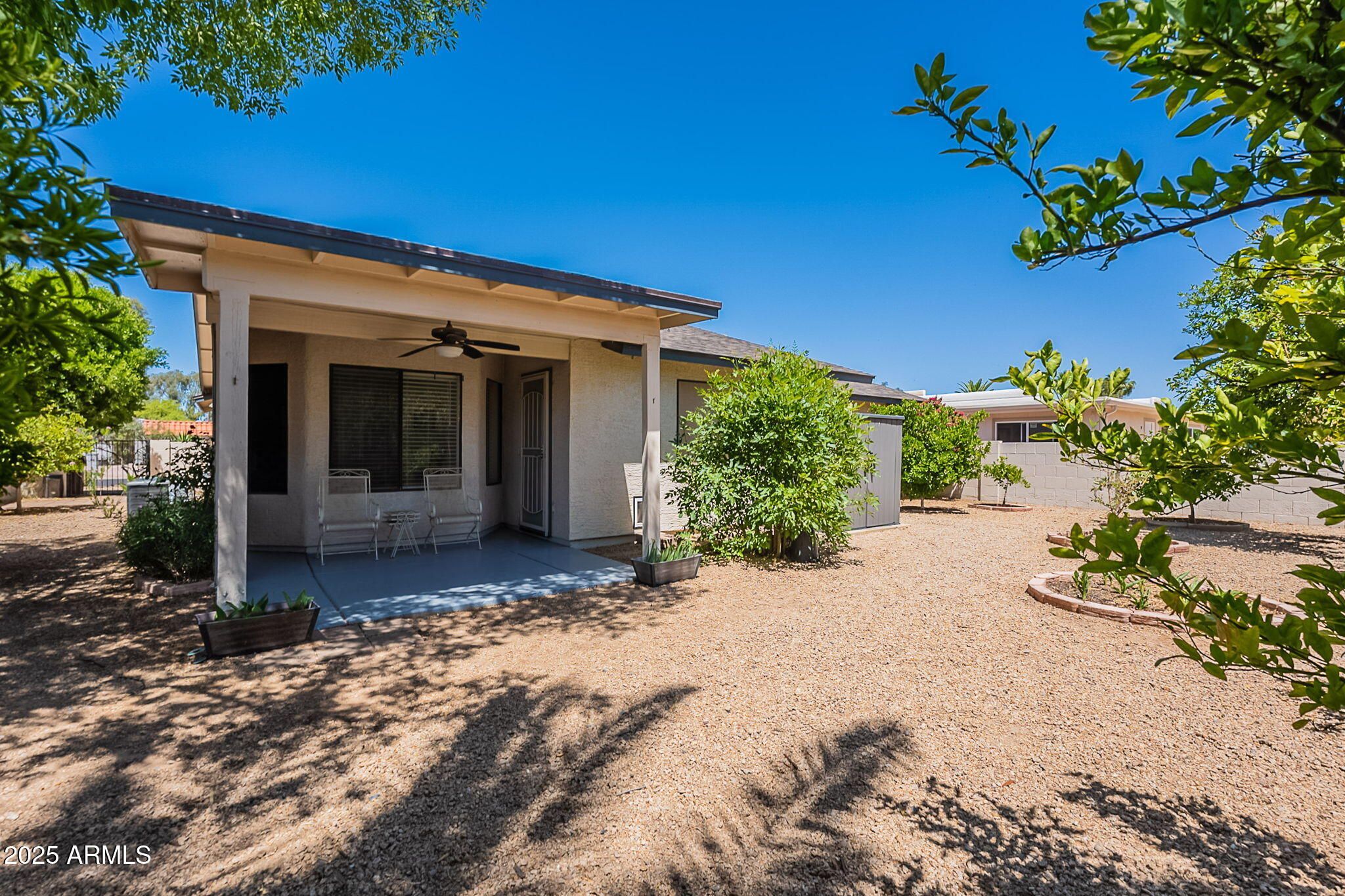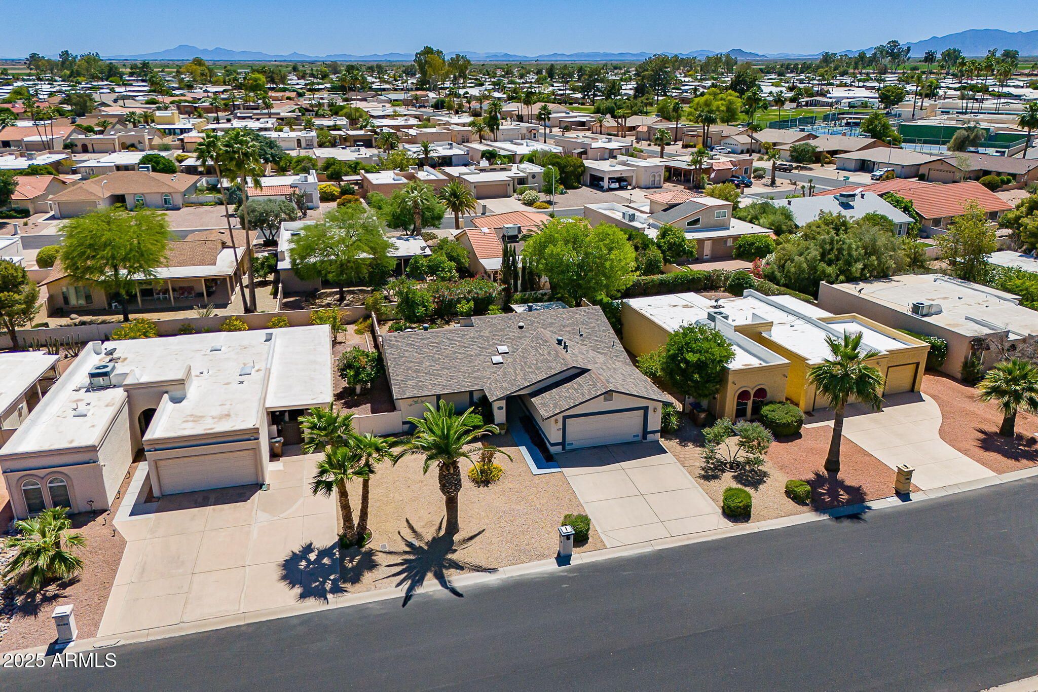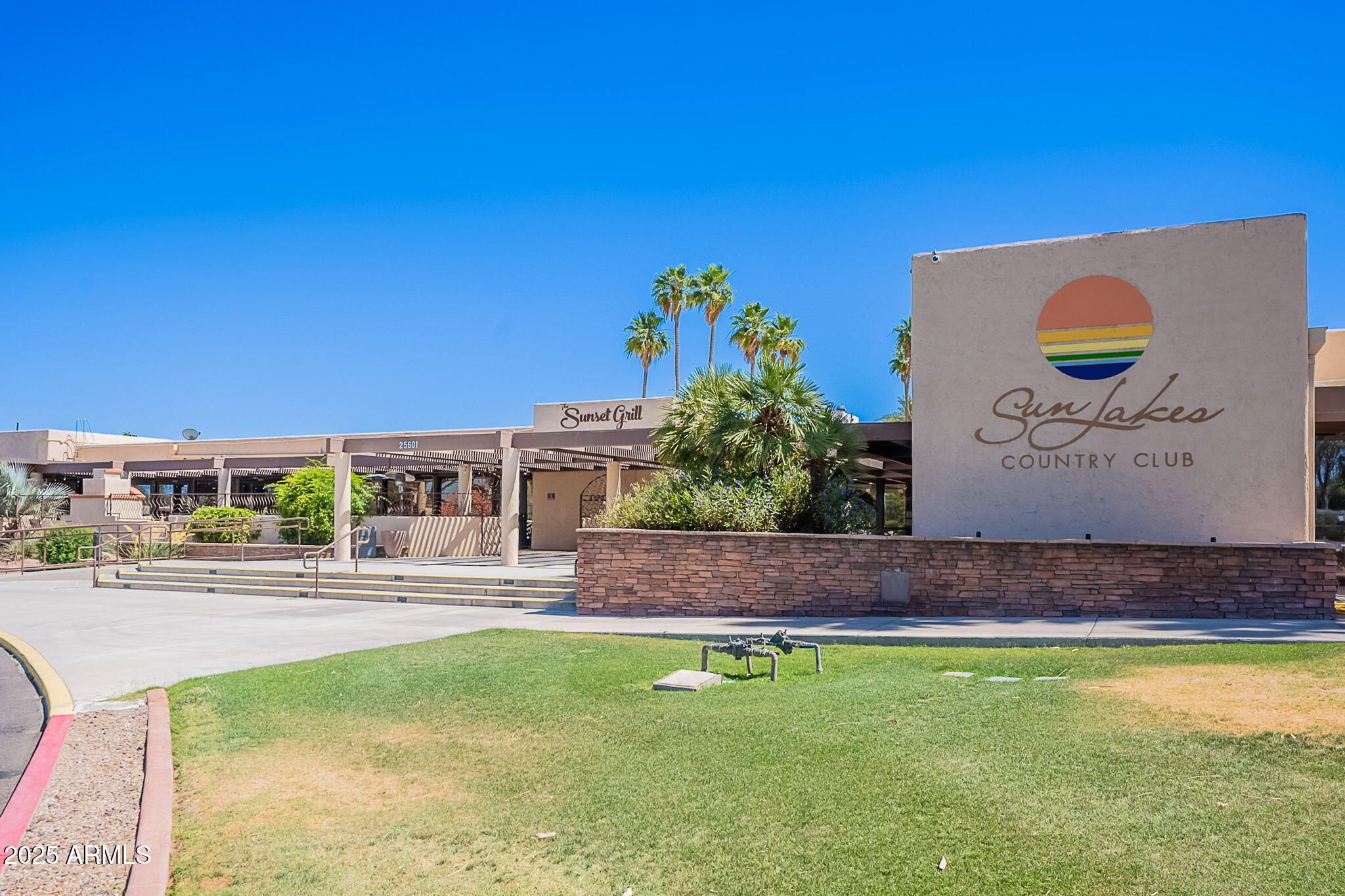 Welcome to this beautifully maintained home in the highly desirable 55+ community of Sun Lakes Country Club. This spacious 2-bedroom plus den, 2.5-bath home is the only one in the neighborhood with gas, featuring a gas furnace & gas water heater. Inside, you'll find beautiful tile flooring throughout for easy maintenance, along with vaulted ceilings in all rooms except the second bedroom and bathrooms, giving the home an open and airy feel. The kitchen is both functional & stylish w/beautiful countertops, white cabinetry, newer double oven, smooth-top electric stove. Quality blinds been installed on all windows & solar shade screens for added energy efficiency. Both bathrooms feature new faucets, shower heads & toilets. The home includes two generously sized bedrooms w/walk-in closets, plus a versatile den ideal for an office or hobby room. Pride of ownership is evident with numerous recent upgrades, including a new roof with 40-year shingles (2020), a new HVAC and heating unit (2020), new attic insulation, a new sewage line (2018), a garage attic fan, two new exterior doors, new security door, & new doorknobs throughout. The private backyard oasis features a covered patio, a small locking storage shed & 11 fruit-bearing citrus trees. The oversized two-car garage offers built-in cabinets on one side and a workbench on the other, perfect for storage and projects. Sun Lakes Country Club offers resort-style amenities including golf, tennis, swimming, fitness centers, restaurants, social clubs, and more. This home blends comfort, functionality, and active adult living in one of Arizona's most vibrant 55+ communities.