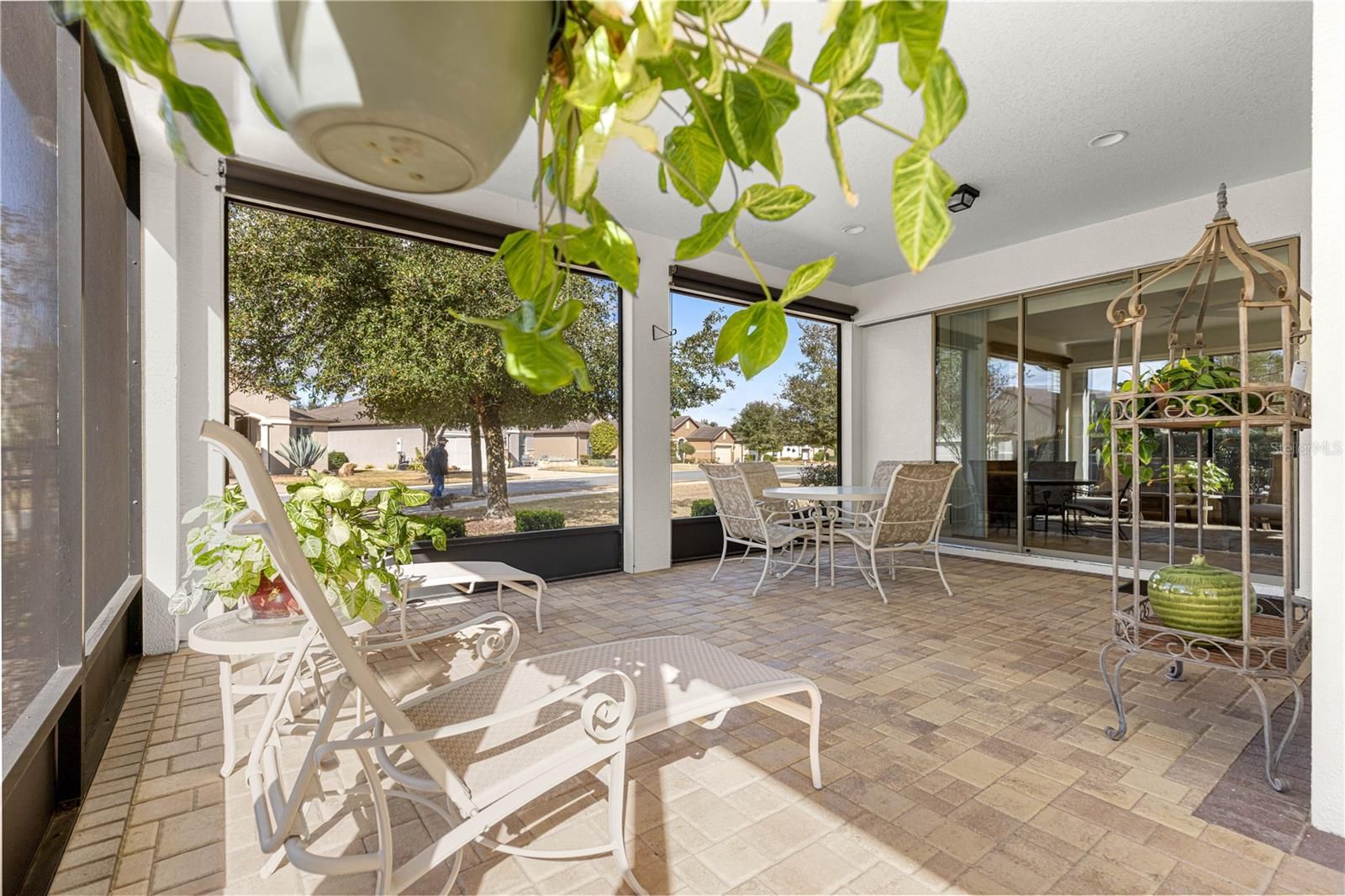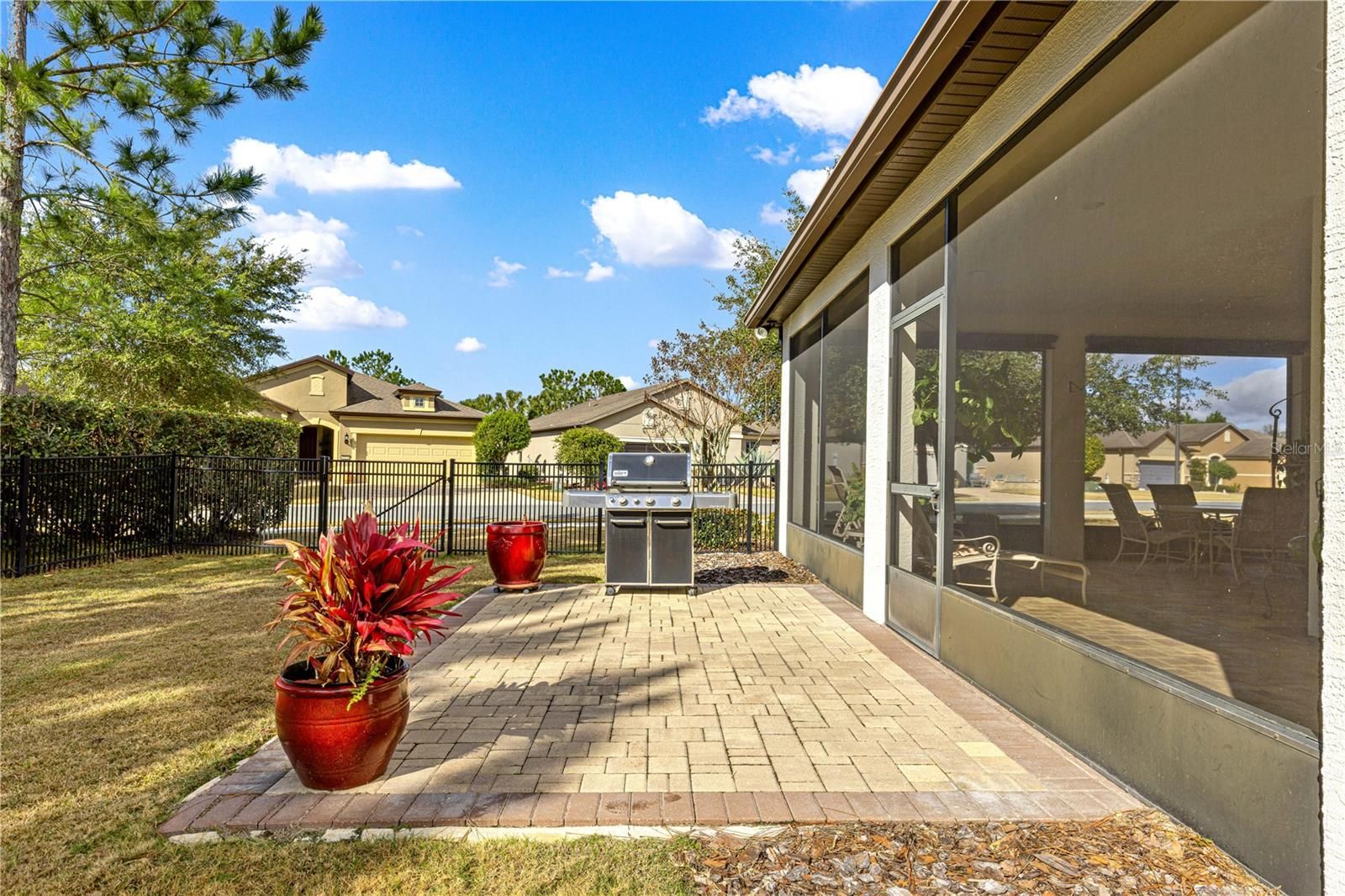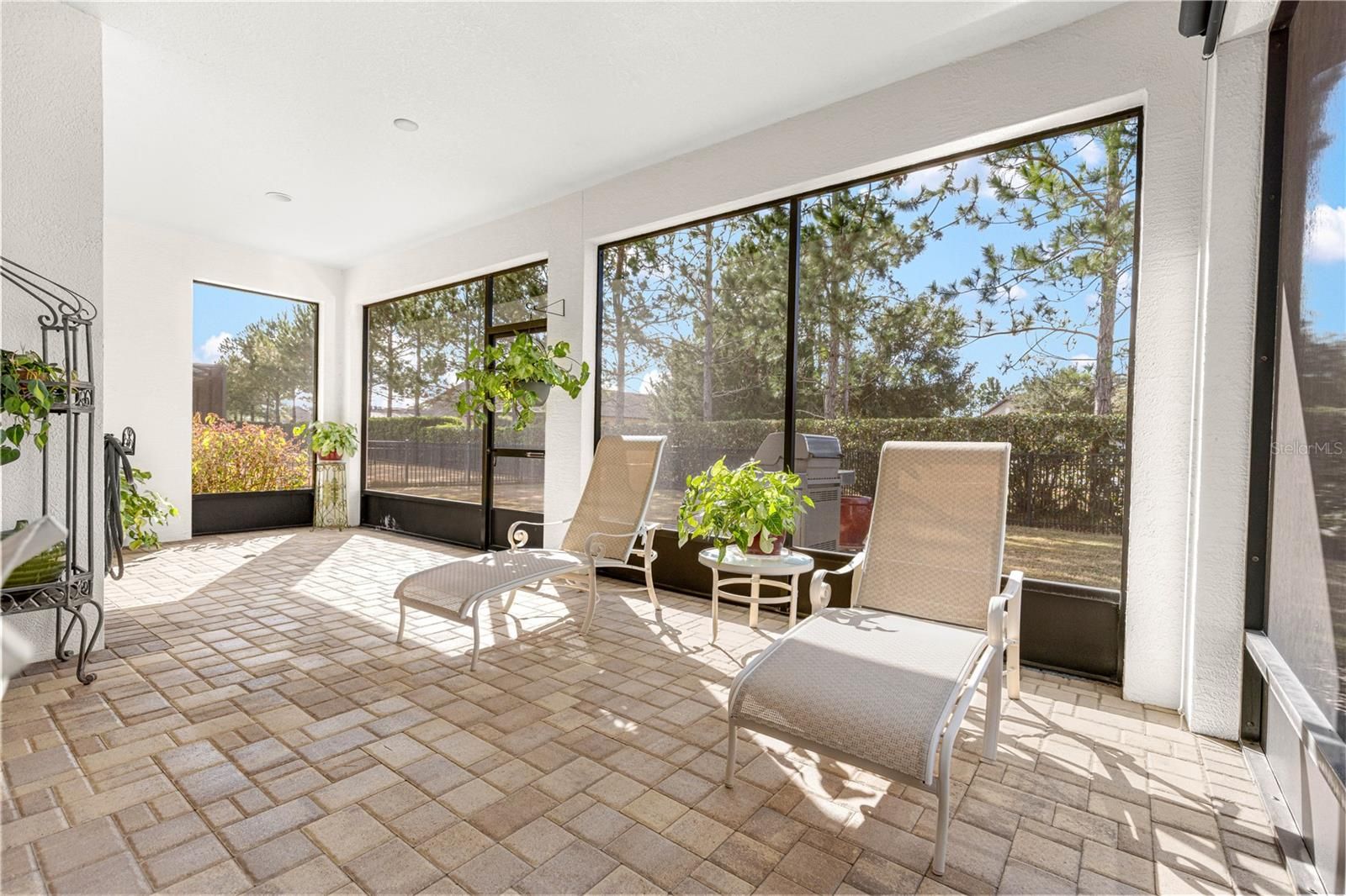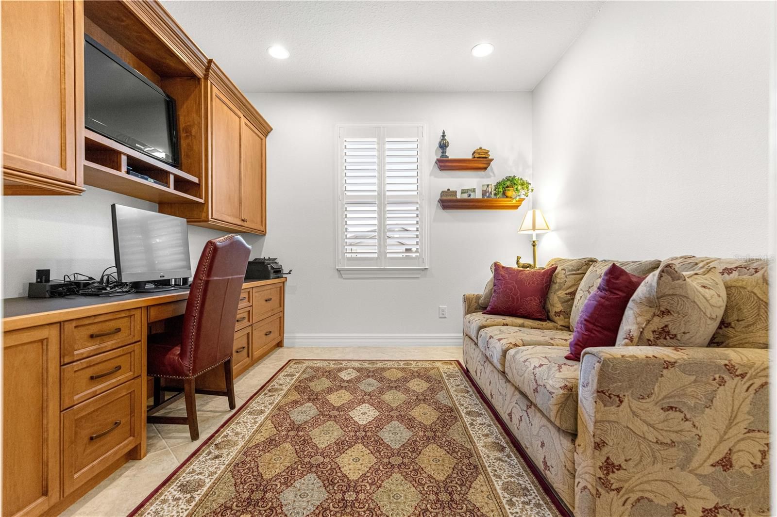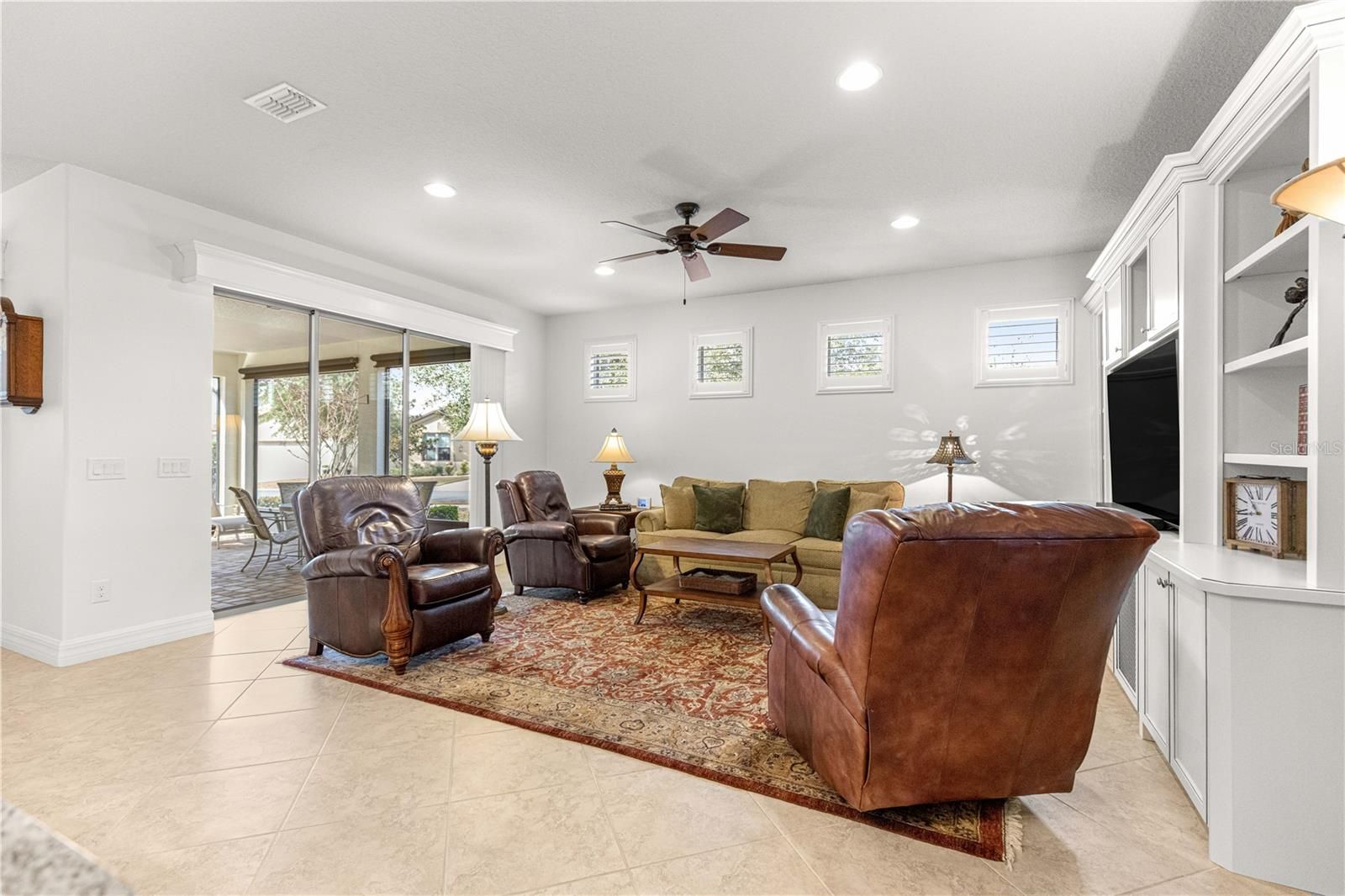 This thoughtfully designed 2-bedroom, 2-bath Summerwood model sits on an oversized corner lot, wrapped in mature greenery and privacy hedges. It offers style, functionality, and exceptional storage throughout. The beautiful carriage doors are 8’ tall, and have had extra shelving added for convenience, and there is a large built-in entertainment area in the living room to display and store favorite items. A large dedicated office features built-in desk space and custom cabinetry, perfect for working from home or managing daily tasks. The home showcases tile flooring in the main living areas and luxury vinyl plank flooring in the bedrooms, complemented by plantation shutters and a soft, neutral color palette that creates a warm, inviting feel. A stunning leaded glass front door adds charm and curb appeal. The kitchen has lovely granite countertops, stainless appliances, and pull-out shelving for ease of use. The spacious primary suite is a true retreat, highlighted by a coffered ceiling, custom feature wall, and a spa-like primary bath with a beautifully tiled walk-in shower. The secondary bedroom and bath provide comfortable accommodations for guests. Enjoy an exceptionally large laundry room with sink, folding area, and abundant cabinetry for storage. The oversized extended garage offers space for two cars plus a golf cart, along with built-in shelving and extensive storage options. This home has wonderful outdoor living space, the screened in lanai has pull-down shades, and there is a great pavered patio for grilling and enjoying the fresh air. This home sits in the established Weston neighborhood of Stone Creek, and combines comfort, elegance, and practicality—perfect for those seeking a well-appointed, move-in-ready residence in an active 55plus community." (Golf cart and some furniture available outside of contract)