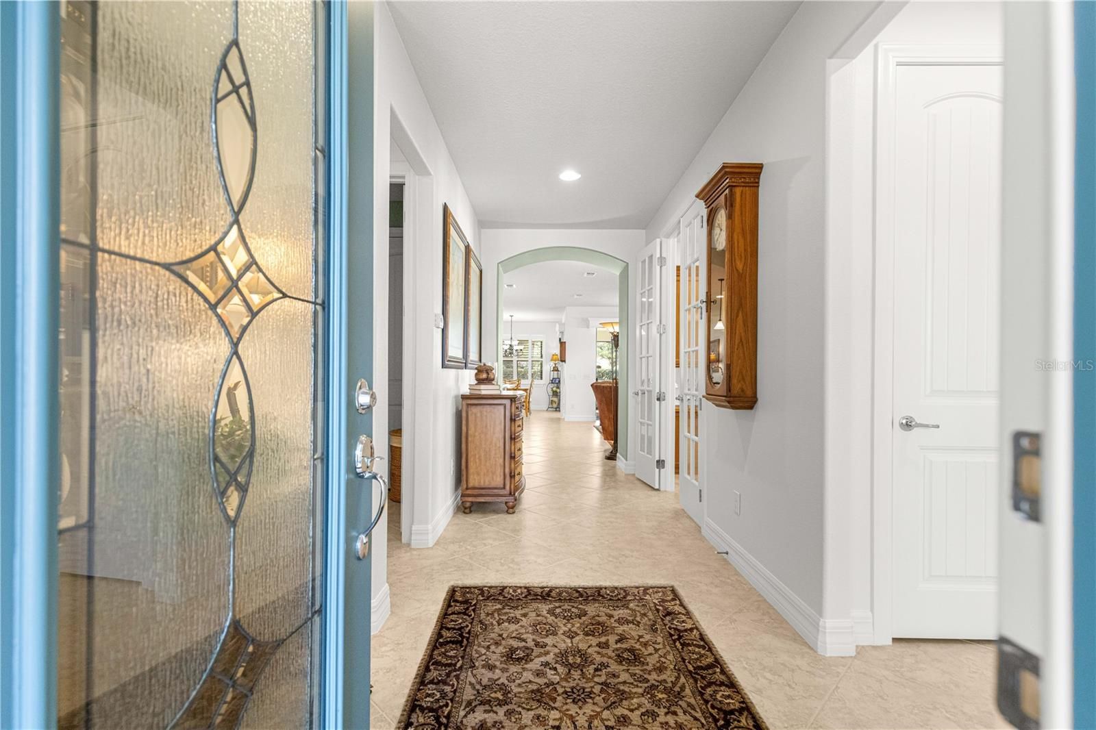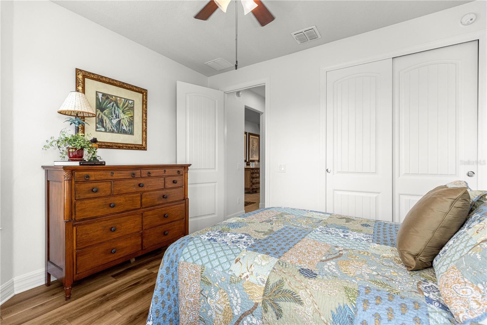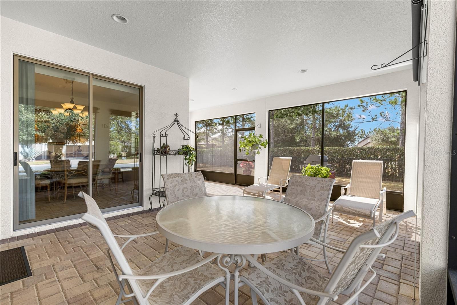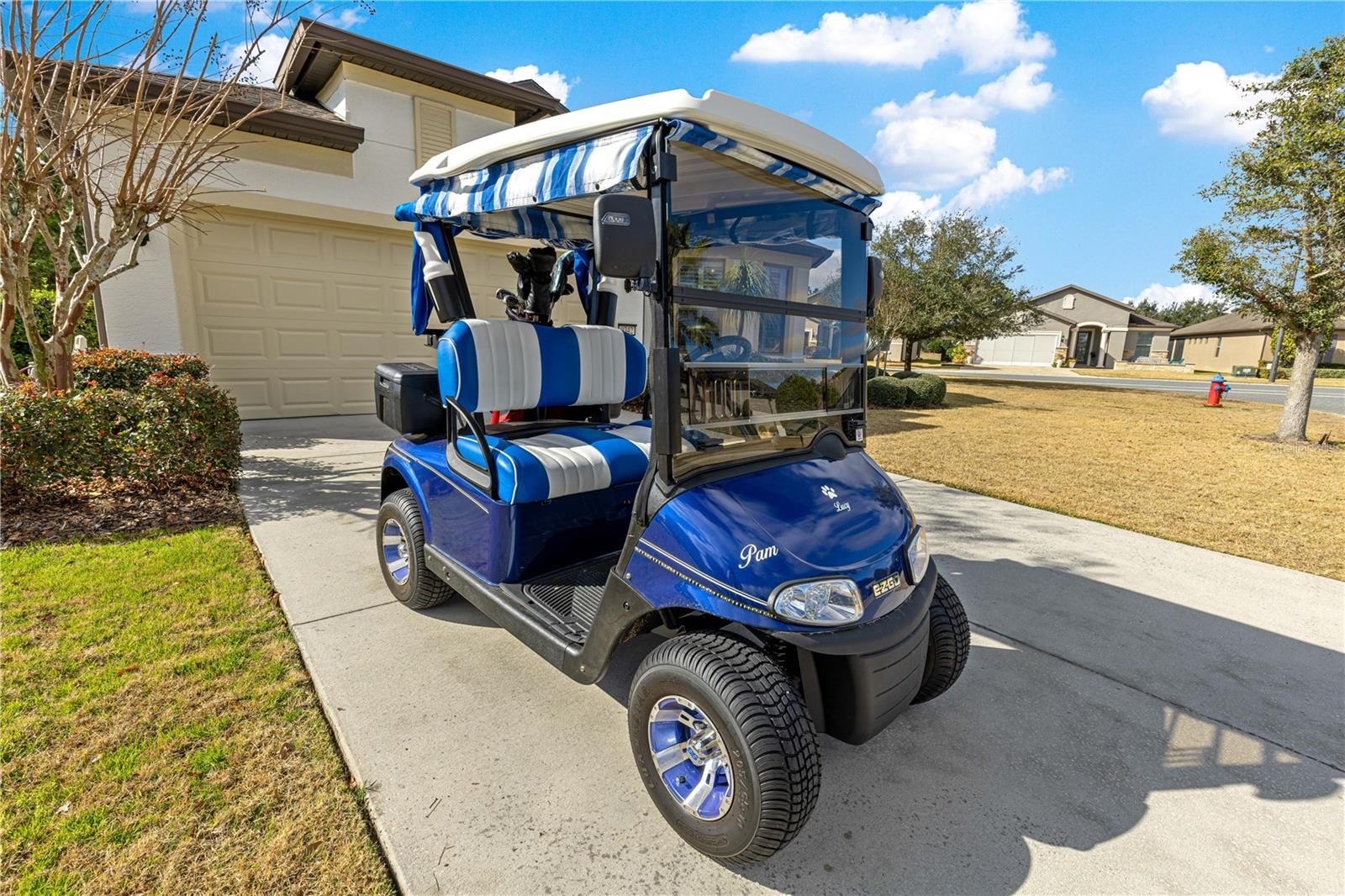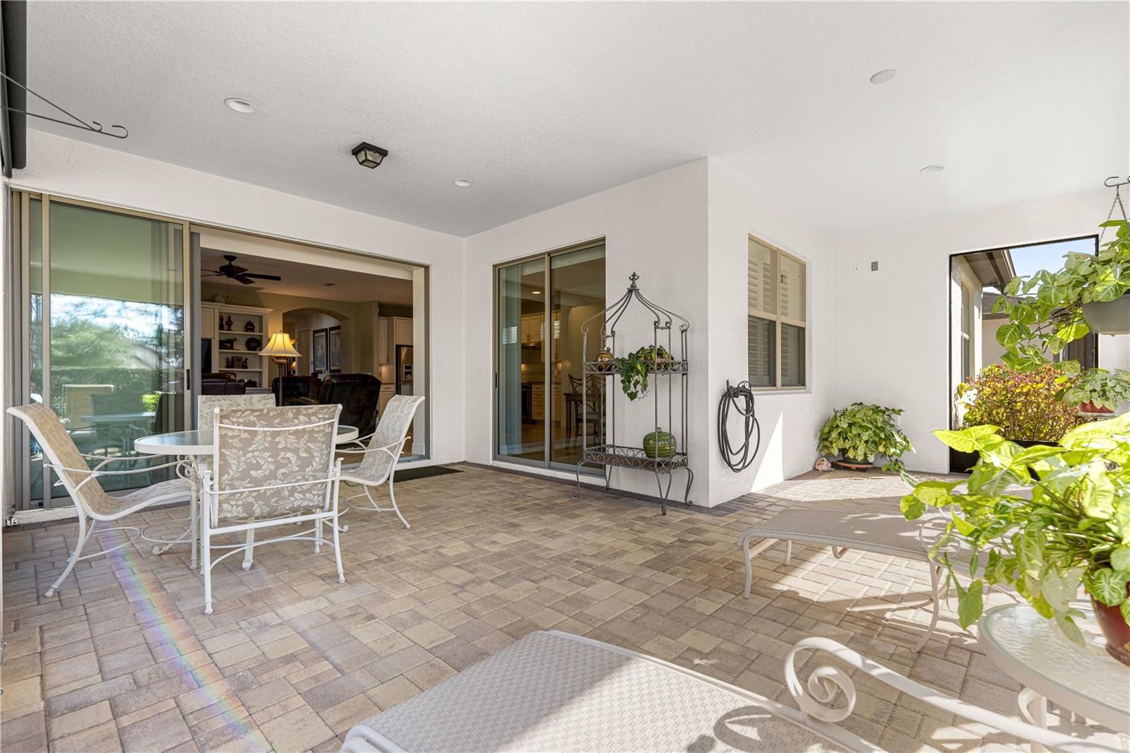 This thoughtfully designed 2-bedroom, 2-bath Summerwood model sits on an oversized corner lot, wrapped in mature greenery and privacy hedges. It offers style, functionality, and exceptional storage throughout. The beautiful carriage doors are 8’ tall, and have had extra shelving added for convenience, and there is a large built-in entertainment area in the living room to display and store favorite items. A large dedicated office features built-in desk space and custom cabinetry, perfect for working from home or managing daily tasks. The home showcases tile flooring in the main living areas and luxury vinyl plank flooring in the bedrooms, complemented by plantation shutters and a soft, neutral color palette that creates a warm, inviting feel. A stunning leaded glass front door adds charm and curb appeal. The kitchen has lovely granite countertops, stainless appliances, and pull-out shelving for ease of use. The spacious primary suite is a true retreat, highlighted by a coffered ceiling, custom feature wall, and a spa-like primary bath with a beautifully tiled walk-in shower. The secondary bedroom and bath provide comfortable accommodations for guests. Enjoy an exceptionally large laundry room with sink, folding area, and abundant cabinetry for storage. The oversized extended garage offers space for two cars plus a golf cart, along with built-in shelving and extensive storage options. This home has wonderful outdoor living space, the screened in lanai has pull-down shades, and there is a great pavered patio for grilling and enjoying the fresh air. This home sits in the established Weston neighborhood of Stone Creek, and combines comfort, elegance, and practicality—perfect for those seeking a well-appointed, move-in-ready residence in an active 55plus community." (Golf cart and some furniture available outside of contract)