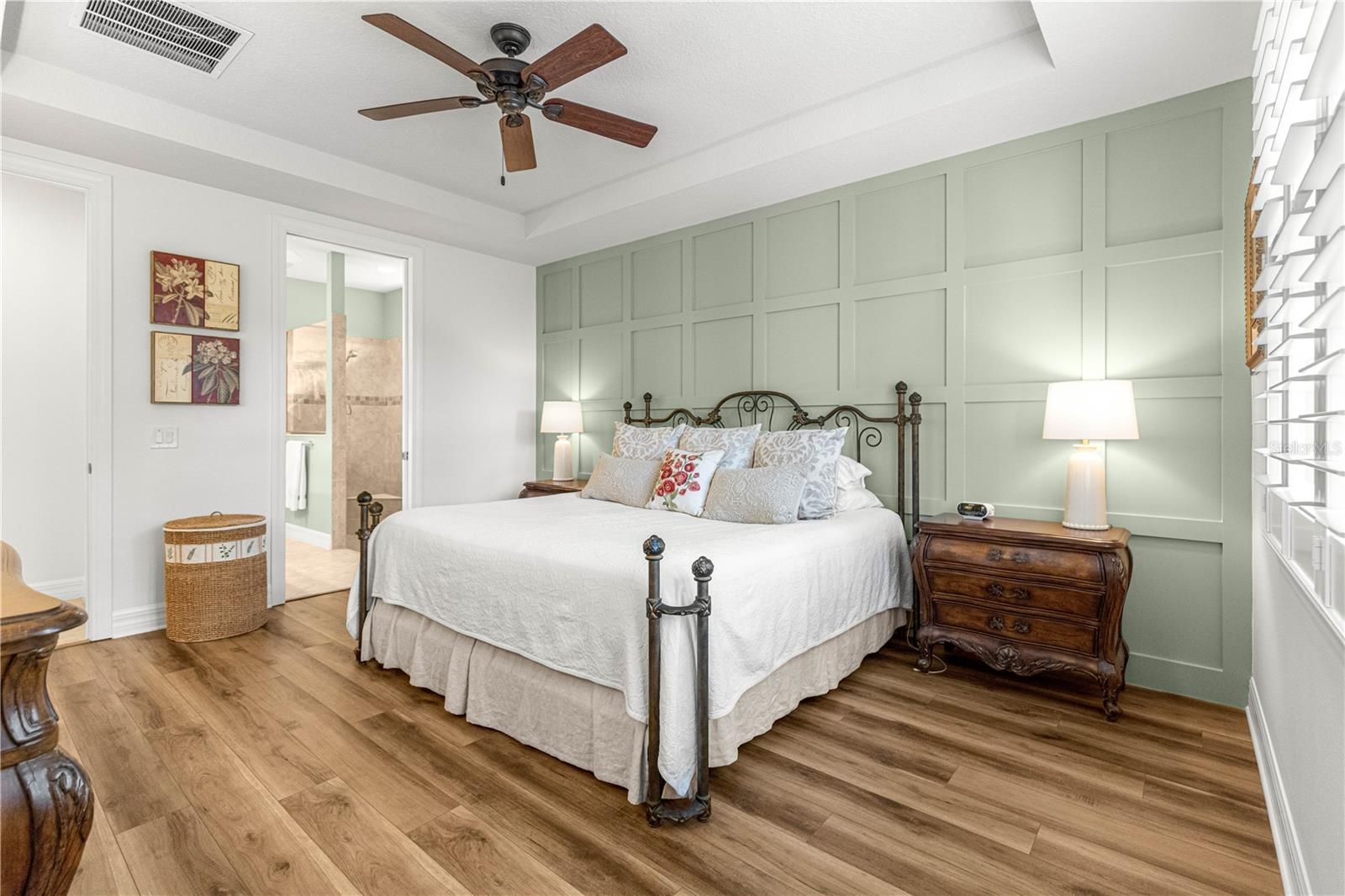 - Ceiling Fan(s), Eat-in Kitchen, High Ceilings, In-Wall Pest Control, Open Floorplan, Main Level Primary, Stone Counters, Window Treatments