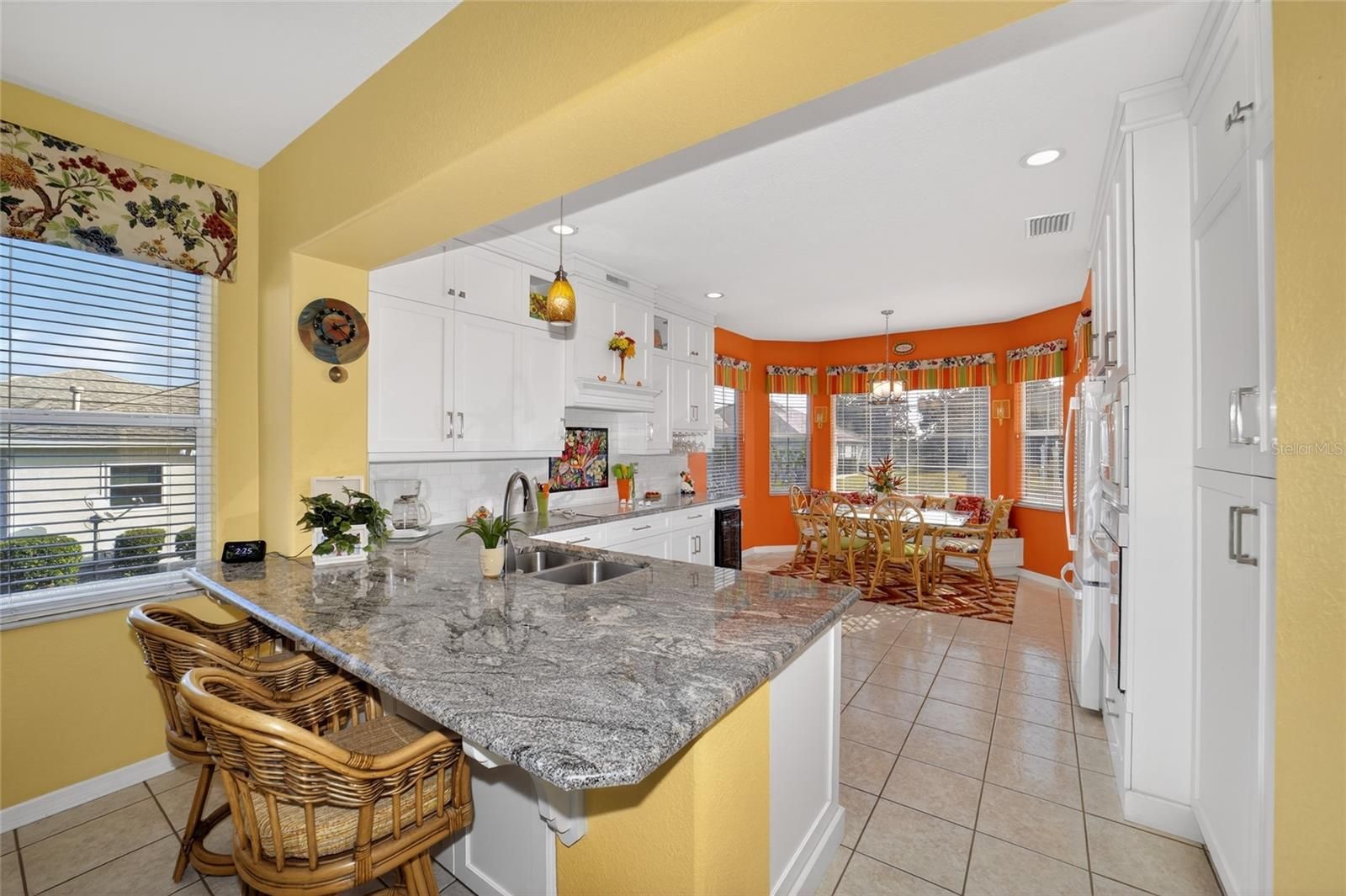 WOW is what you’ll say as you step inside this custom Coral Gables model, offering 2 bedrooms, 2 baths, plus a den, and an exceptional location. Once inside, you’ll be in awe of the sweeping views of the 9th green of the Heritage Golf Course, ideally situated adjacent to the Horizon Pool, Horizon Center, Pro Shop, and Liberty Grille. The kitchen has been completely remodeled with custom white cabinetry, white tile, and beautiful one-level granite countertops. High-end white appliances include a French-door refrigerator with bottom freezer, built-in microwave and oven, countertop range, and a built-in wine refrigerator. Additional features include bay windows, a large double pantry, ample cabinetry, generous prep space, and seating for casual dining. The breakfast nook offers lovely views of the front landscaping making this kitchen both functional and inviting for entertaining.The open floor plan creates a warm and welcoming atmosphere, enhanced by ceramic tile flooring and recessed lighting throughout. The Great Room opens completely to the Florida Room, which leads to a screened lanai and an adjacent patio—perfect for enjoying the sun and grilling. Ceramic tile flooring extends throughout the entire home, including the bedrooms. The primary suite features bay windows and an updated en-suite bath with a granite vanity, and as totally built out custom closet. The guest bath has also been upgraded.The3 car extended garage includes an electric privacy screen, designer-painted floors, and two drop-down attic staircases for additional storage. There is a custom built office just off the kitchen with overhead cabinetry. The laundry is located in the garage next to a utility sink. Major updates include a Generac whole-house generator, HVAC (2018), roof (2014), and newer hot water heater. This is truly a special home in a prime location—one you won’t want to miss seeing. Furniture is available.