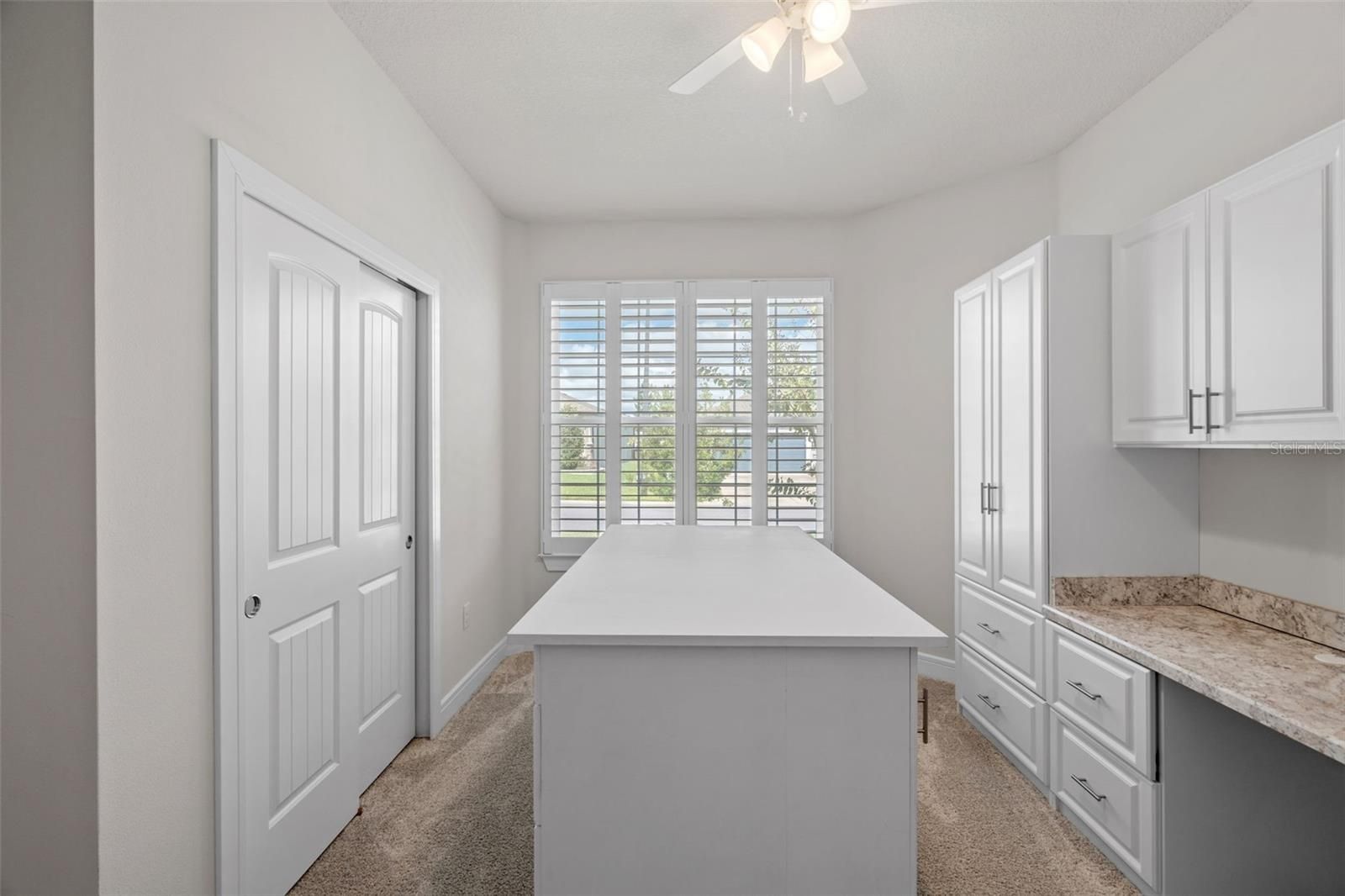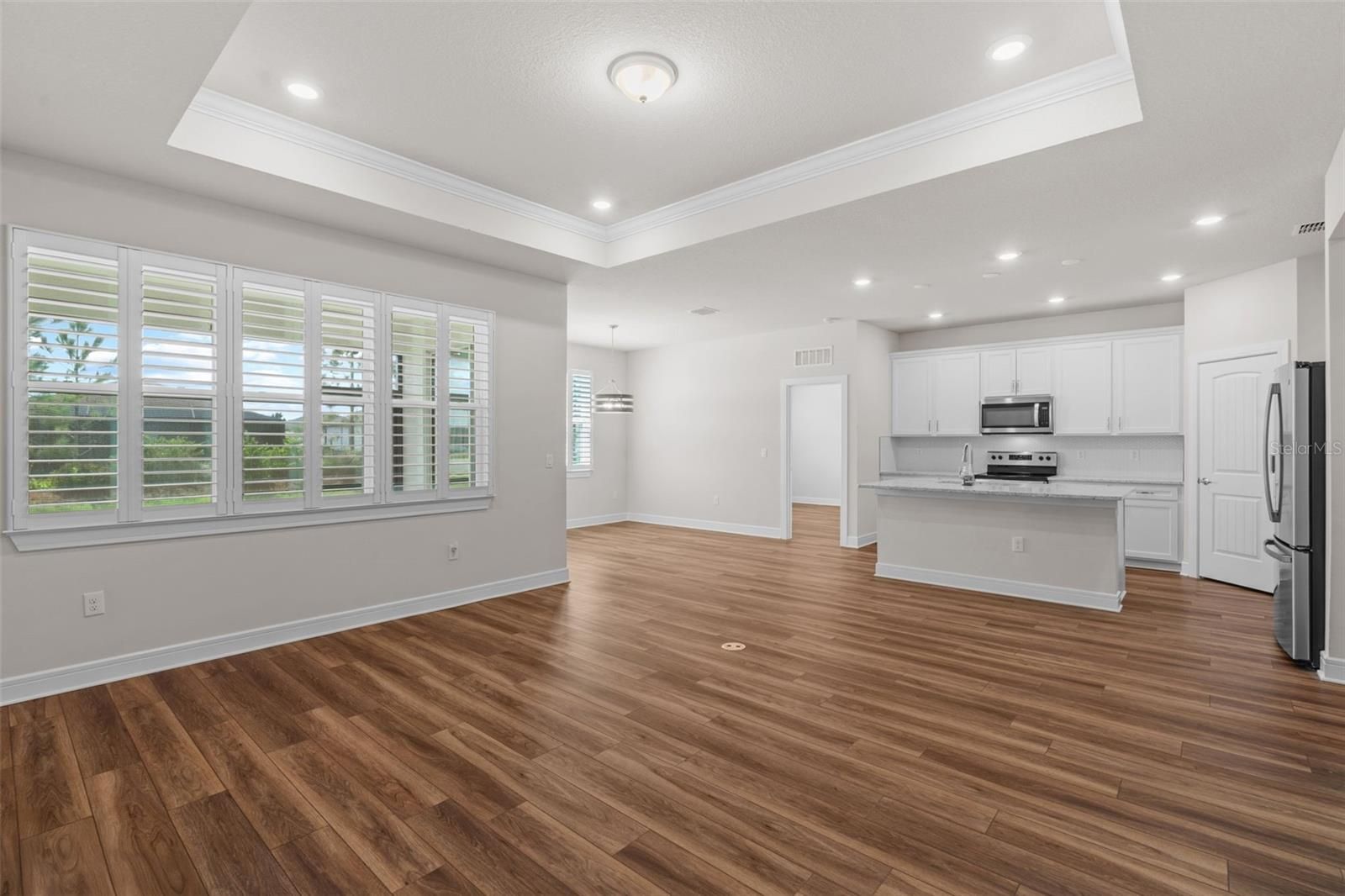 - Built-in Features, Ceiling Fan(s), High Ceilings, Kitchen/Family Room Combo, Open Floorplan, Main Level Primary, Thermostat, Tray Ceiling(s), Window Treatments
