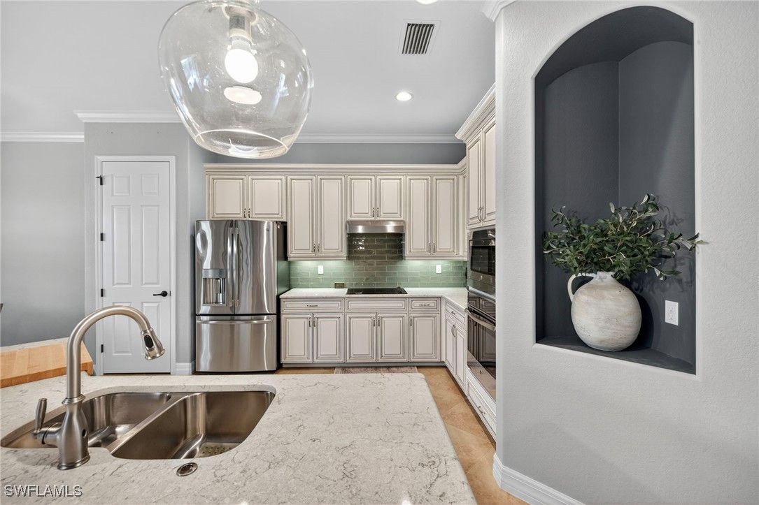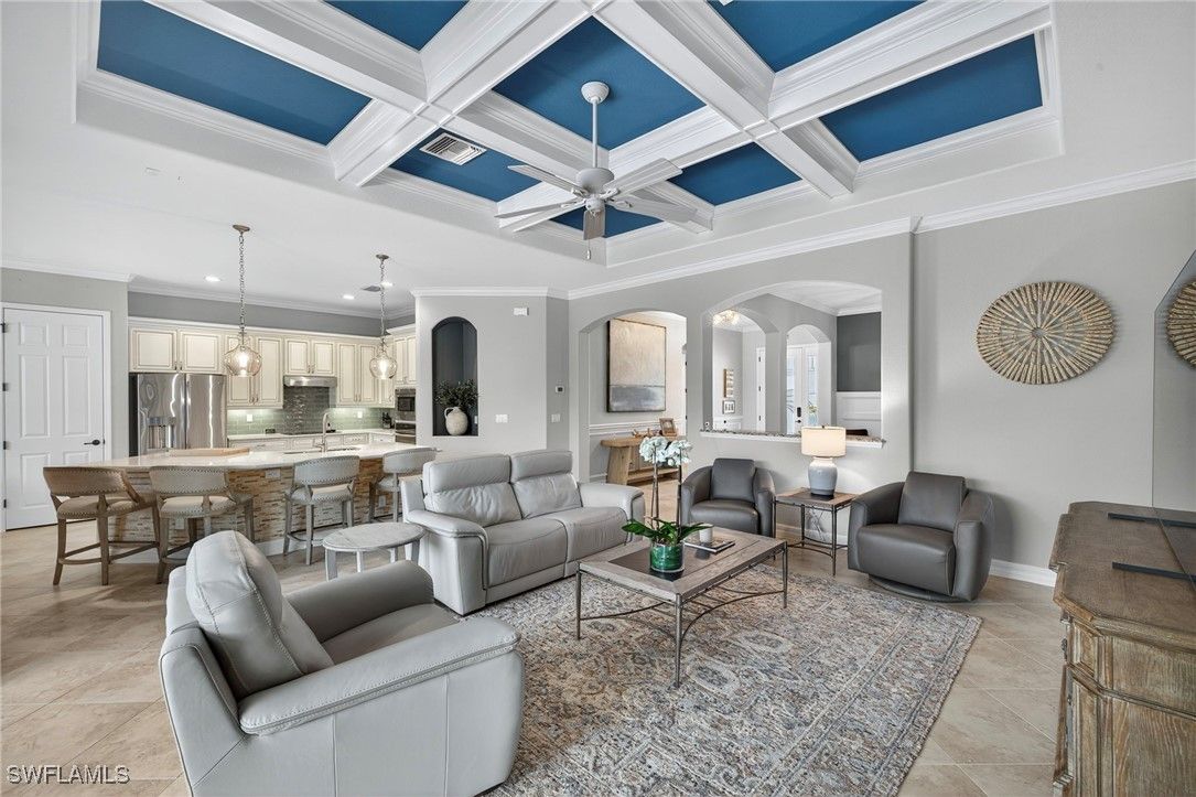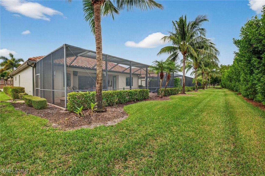 From the moment you arrive, the home’s inviting curb appeal and impact-resistant glass entry door set the tone for what lies beyond — a bright, open interior brimming with natural light and refined architectural touches. The entryway opens to soaring coffered ceilings, crisp wainscoting, and a welcoming layout that blends timeless design with modern sensibility. The kitchen, a true focal point of the home, features sleek white cabinetry, gleaming quartz countertops, and upgraded appliances — perfect for both everyday living and entertaining guests. The seamless transition from the indoor living area to the outdoor oasis through wide glass sliders creates the ideal Florida flow. Outside, a private retreat awaits. The screened lanai is complete with a built-in outdoor kitchen, a sparkling pool, and a rejuvenating spa — all framed by lush tropical landscaping for privacy and tranquility. Whether hosting friends for cocktails or enjoying a quiet evening under the stars, this is the ultimate Naples lifestyle setting. As part of Treviso Bay’s coveted social membership, residents enjoy access to the exclusive Villa Rilassare club, offering a resort-style lagoon pool, lap pool, poolside restaurant and bar, luxurious spa, fitness center, and courts for tennis, pickleball, and bocce. The TPC golf clubhouse provides additional dining, events, and community gatherings that make Treviso Bay one of Naples’ most sought-after communities. Located just five miles from Naples’ renowned white-sand beaches and the upscale shopping and dining of Fifth Avenue South, this exceptional property combines comfort, elegance, and an unbeatable location. It’s more than a home — it’s your private piece of paradise.
