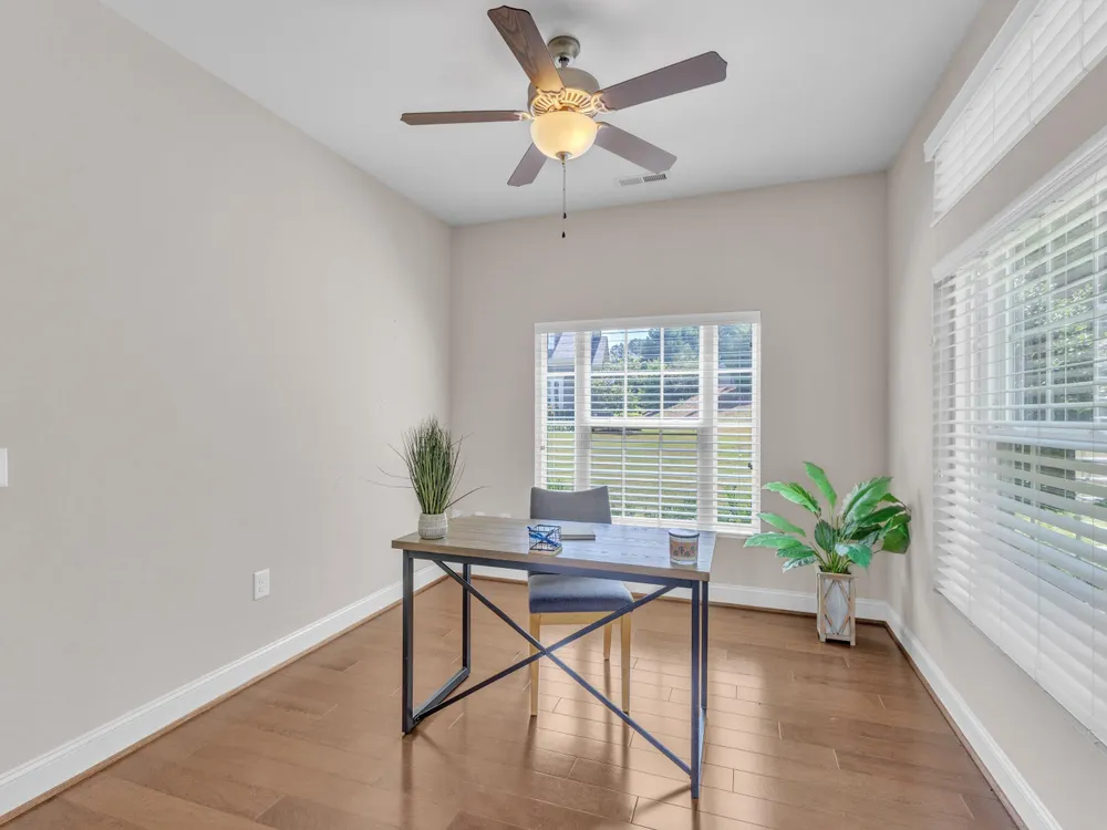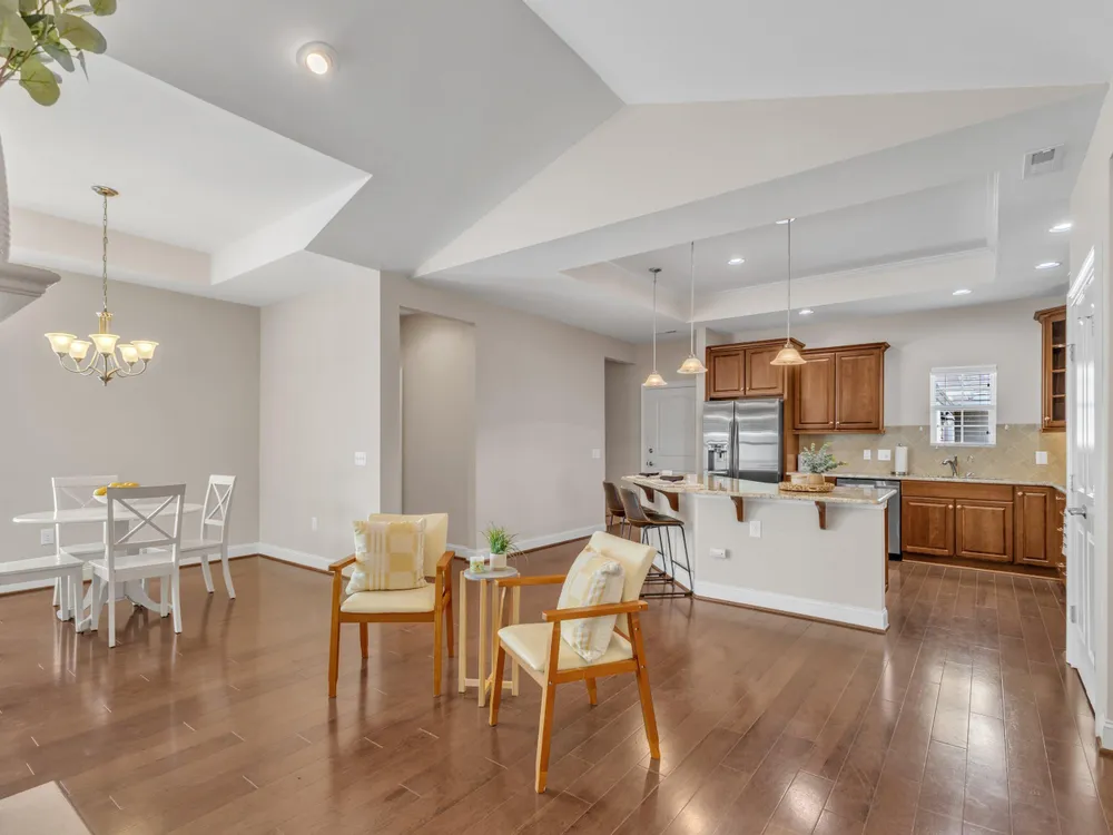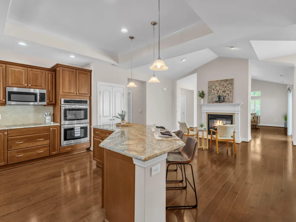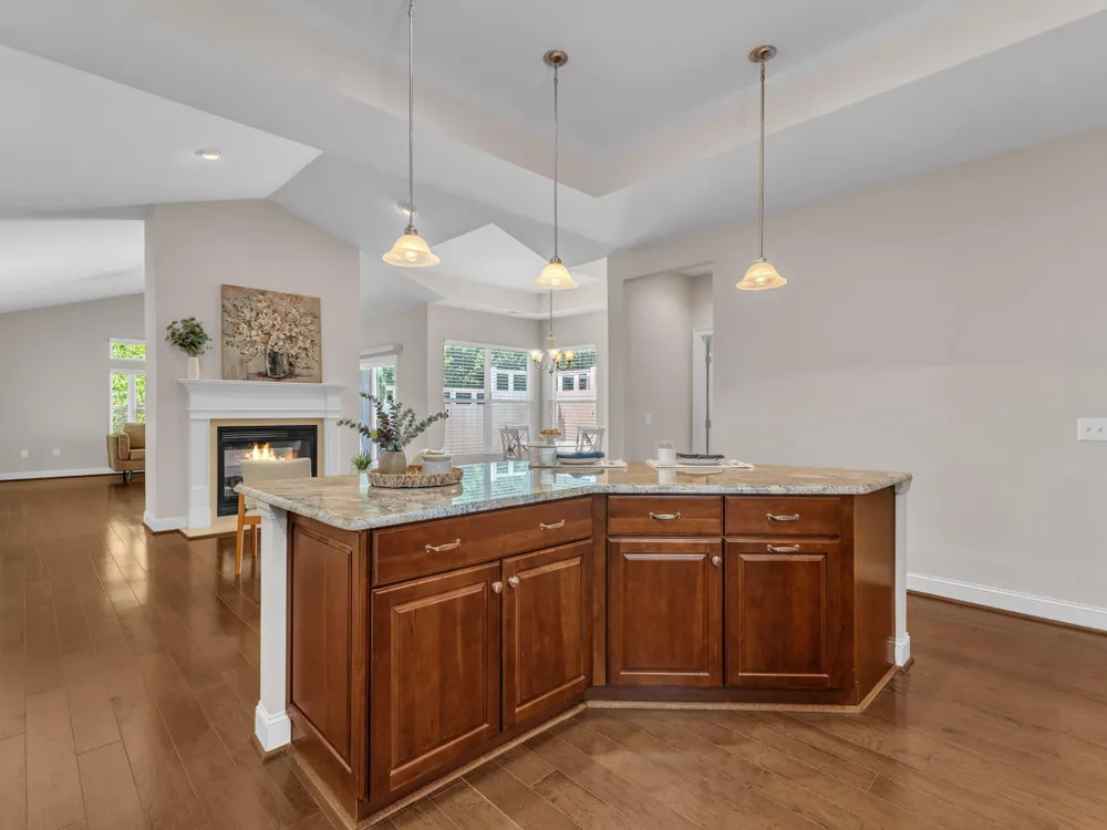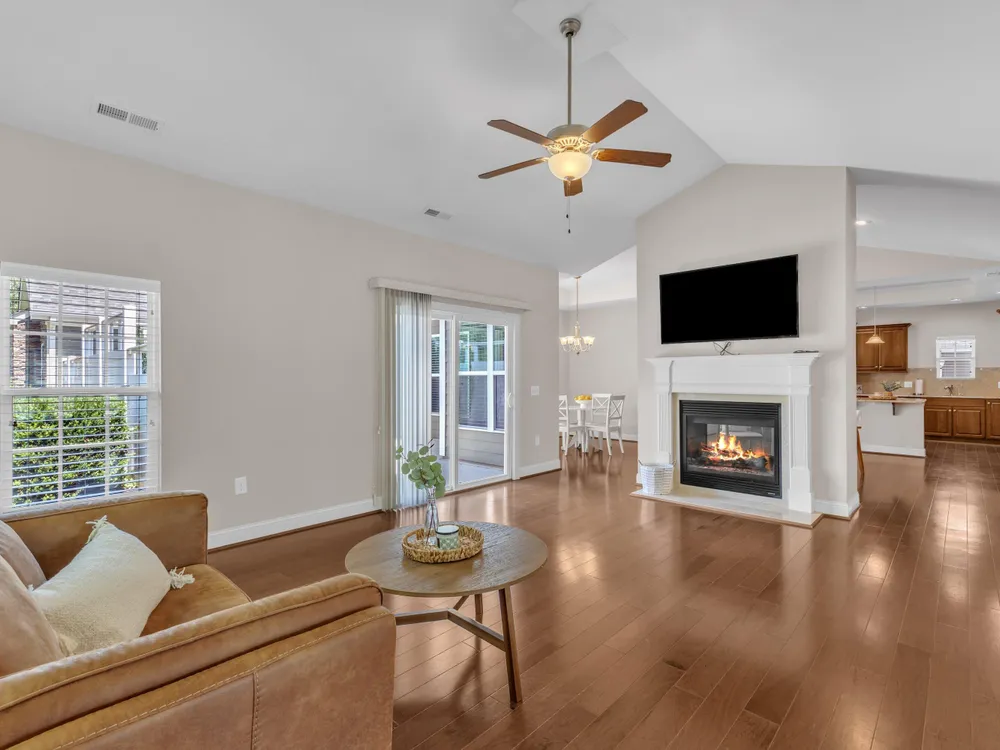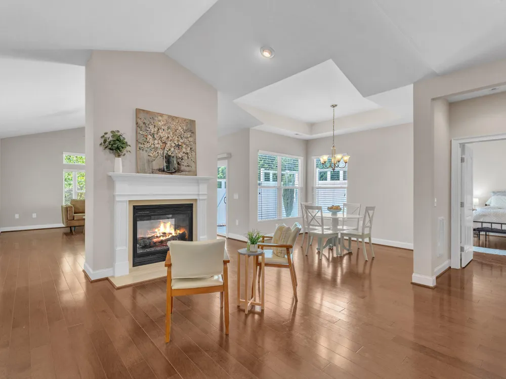 Beautiful condo-style home in the sought-after Villas of Wake Forest with most living space on the main floor. Open concept layout features a granite kitchen with stainless appliances and double oven, dining area, keeping room, and living room with hardwood floors and natural light. First-floor primary suite offers vaulted ceilings, dual closets, and walk-in shower; additional bedroom and full bath with walk-in tub plus an office/guest space complete the level. Upstairs includes a spacious bonus or third bedroom with full bath and large closets. Custom closet shelving throughout and oversized two-car garage provide excellent storage. Community amenities include pool, clubhouse, and social activities. Conveniently located near Wegmans, Sam's Club, and The Grove at 98.
