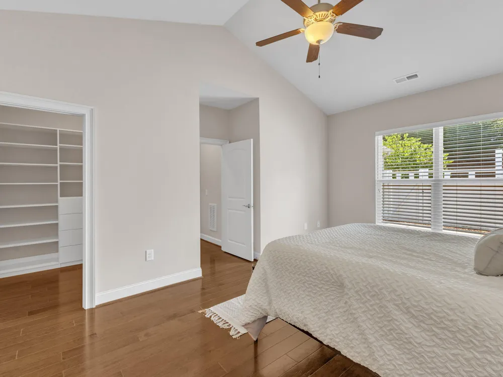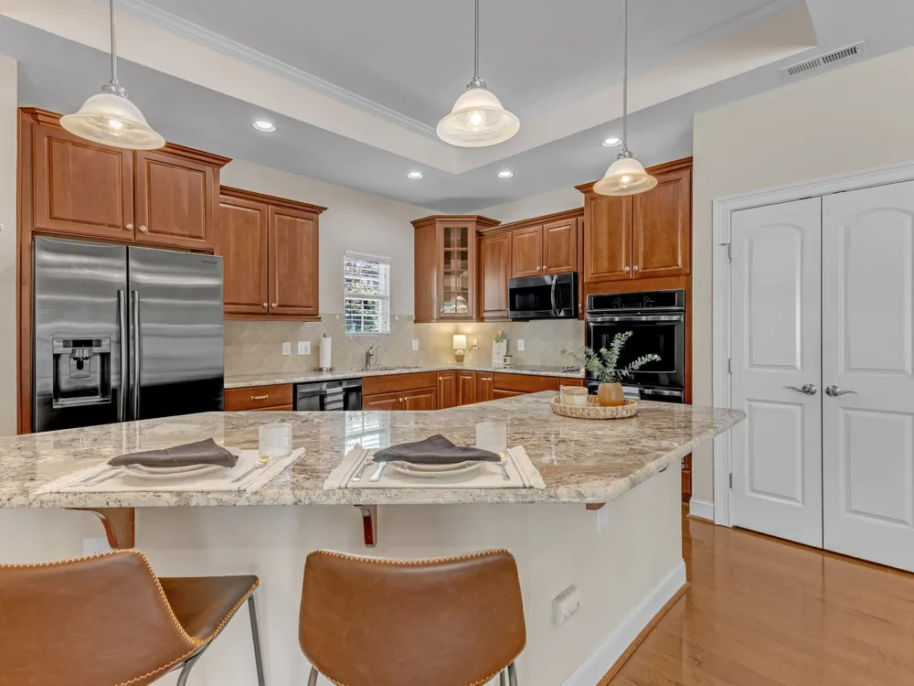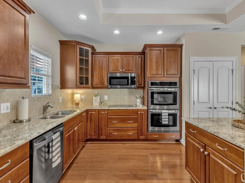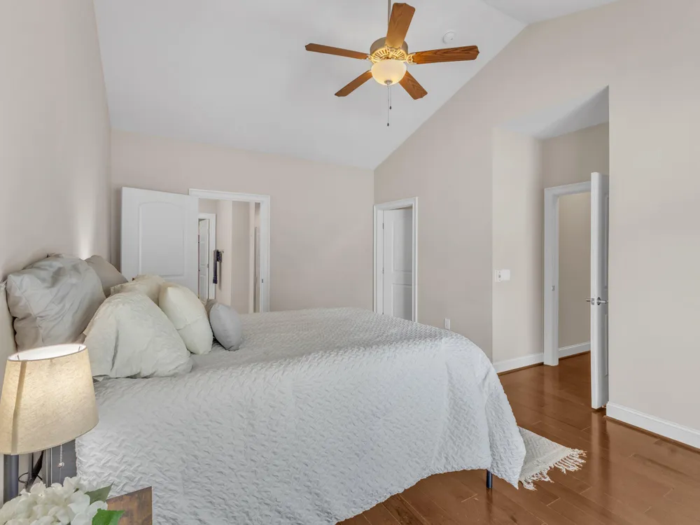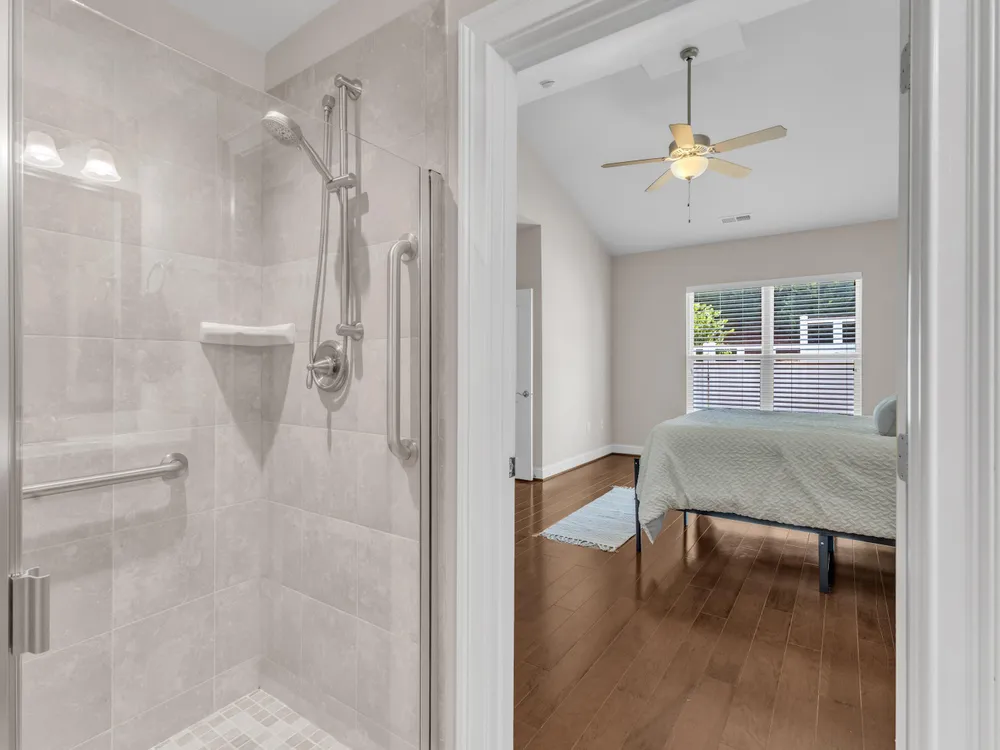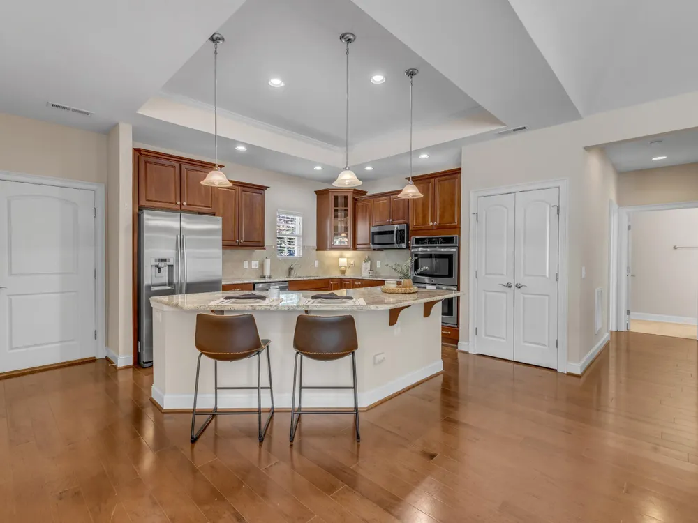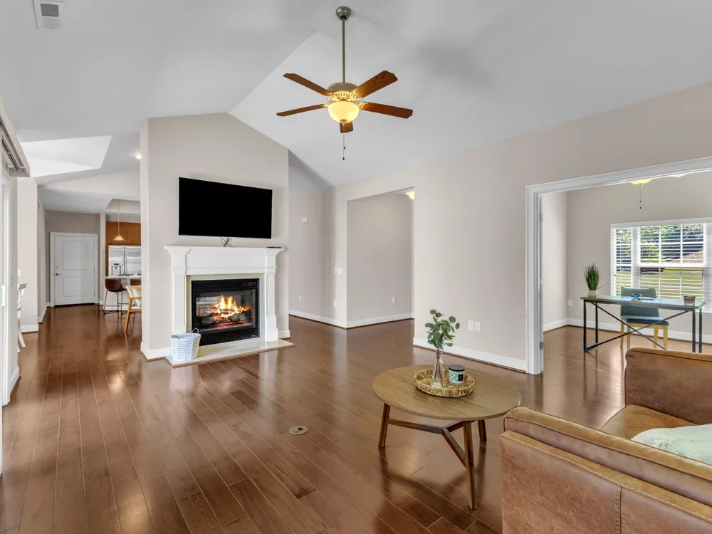 Beautiful condo-style home in the sought-after Villas of Wake Forest with most living space on the main floor. Open concept layout features a granite kitchen with stainless appliances and double oven, dining area, keeping room, and living room with hardwood floors and natural light. First-floor primary suite offers vaulted ceilings, dual closets, and walk-in shower; additional bedroom and full bath with walk-in tub plus an office/guest space complete the level. Upstairs includes a spacious bonus or third bedroom with full bath and large closets. Custom closet shelving throughout and oversized two-car garage provide excellent storage. Community amenities include pool, clubhouse, and social activities. Conveniently located near Wegmans, Sam's Club, and The Grove at 98.