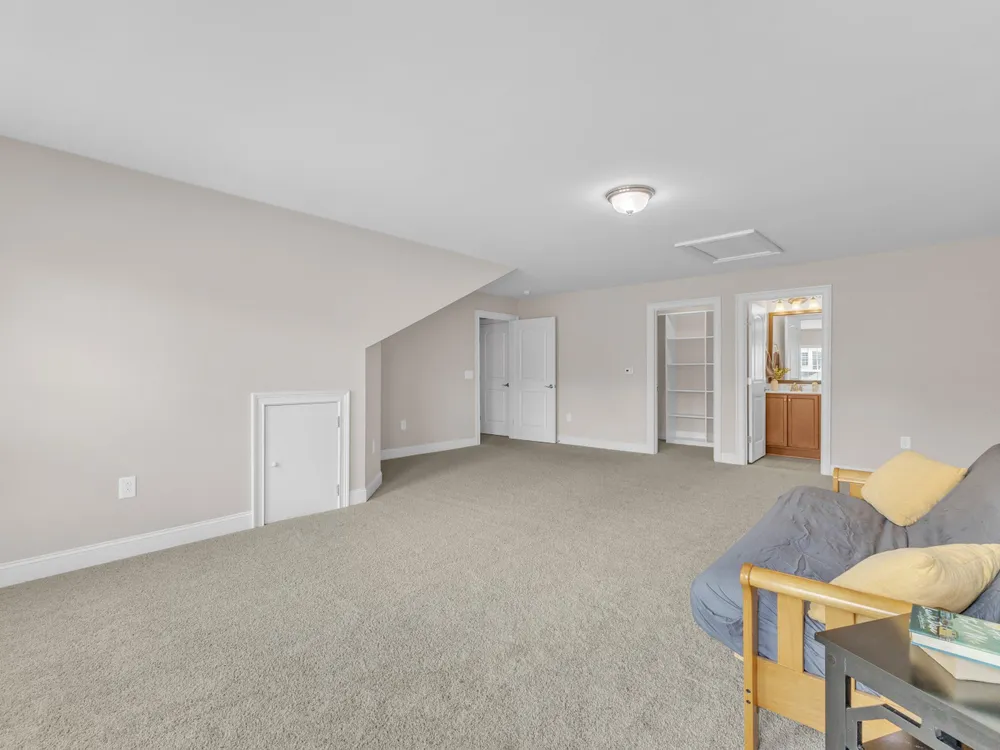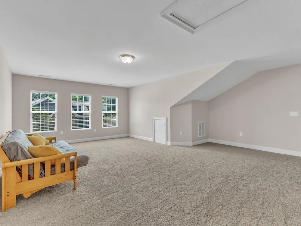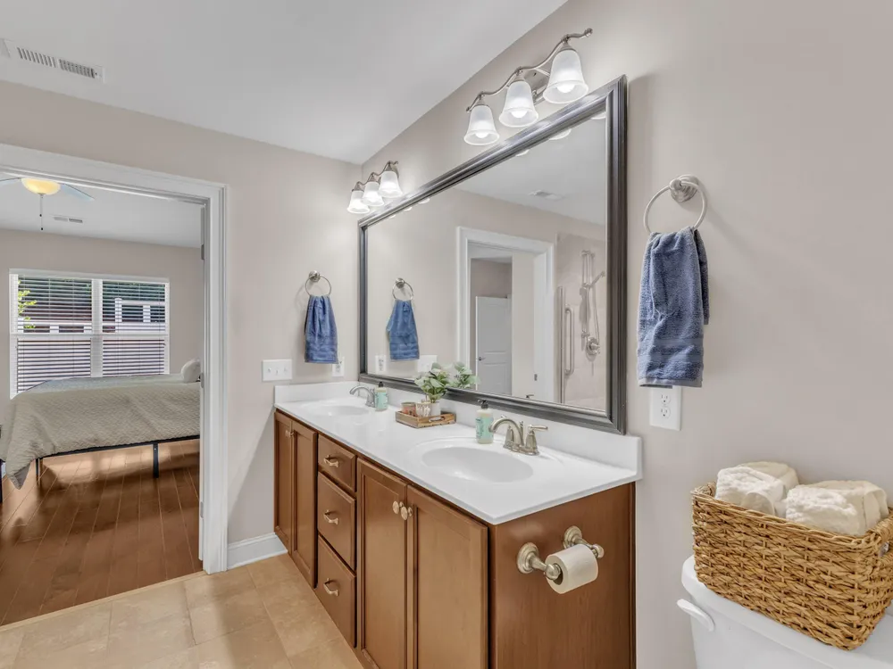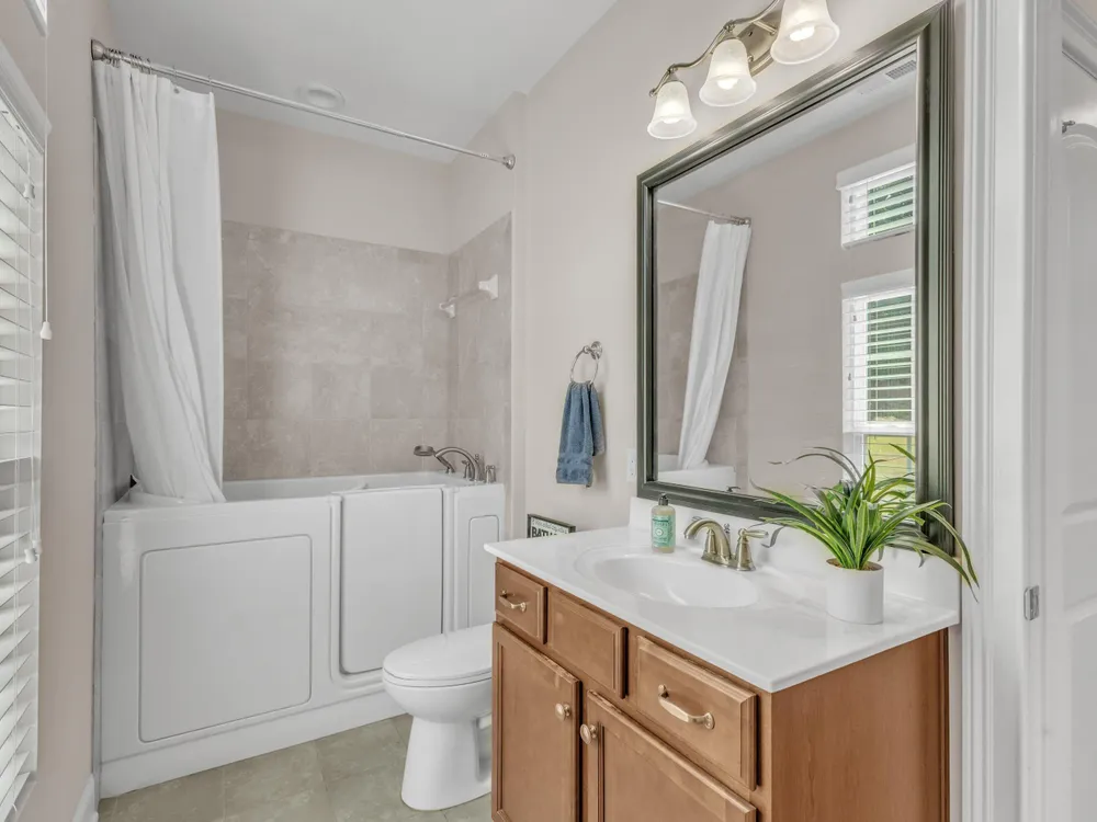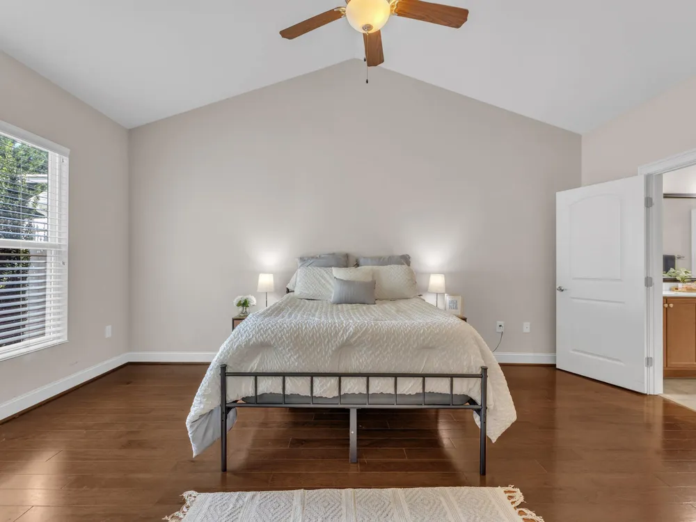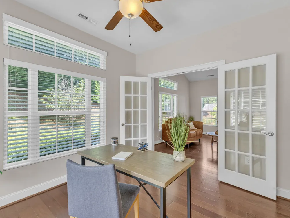 Beautiful condo-style home in the sought-after Villas of Wake Forest with most living space on the main floor. Open concept layout features a granite kitchen with stainless appliances and double oven, dining area, keeping room, and living room with hardwood floors and natural light. First-floor primary suite offers vaulted ceilings, dual closets, and walk-in shower; additional bedroom and full bath with walk-in tub plus an office/guest space complete the level. Upstairs includes a spacious bonus or third bedroom with full bath and large closets. Custom closet shelving throughout and oversized two-car garage provide excellent storage. Community amenities include pool, clubhouse, and social activities. Conveniently located near Wegmans, Sam's Club, and The Grove at 98.