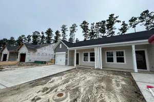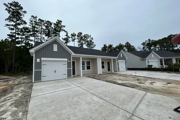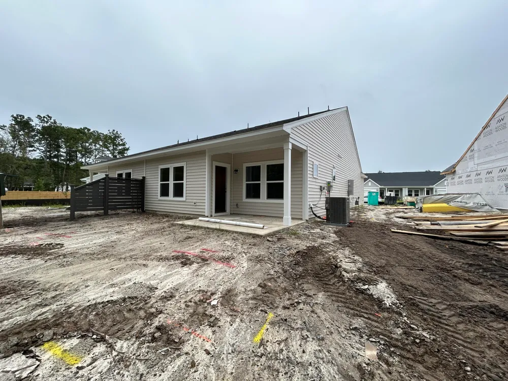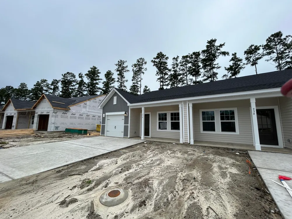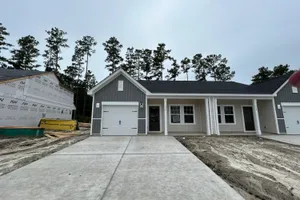 Single level duplex home on large lot with trees behind. Brand new warrantied home that invites you into luxury with 9 foot ceilings and wide plank flooring. Gorgeous open main living is tucked away in the back of the home with ample room for dining and living. Up to the minute kitchen features quartz countertops, matte gold fixtures and an elegantly serene ceramic backsplash to blend with quality 42'' upper cabinets. Sunlit, primary suite overlooks sizeable yard and is lined in back with a tree buffer. Step into spa style with zero entry shower, dual vanities and a walk-in closet. At the front of the home another spacious bedroom with walk-in closet and full bath offers guests privacy. Extra deep single car garage is attached. Partially covered patio in back and front porch.
