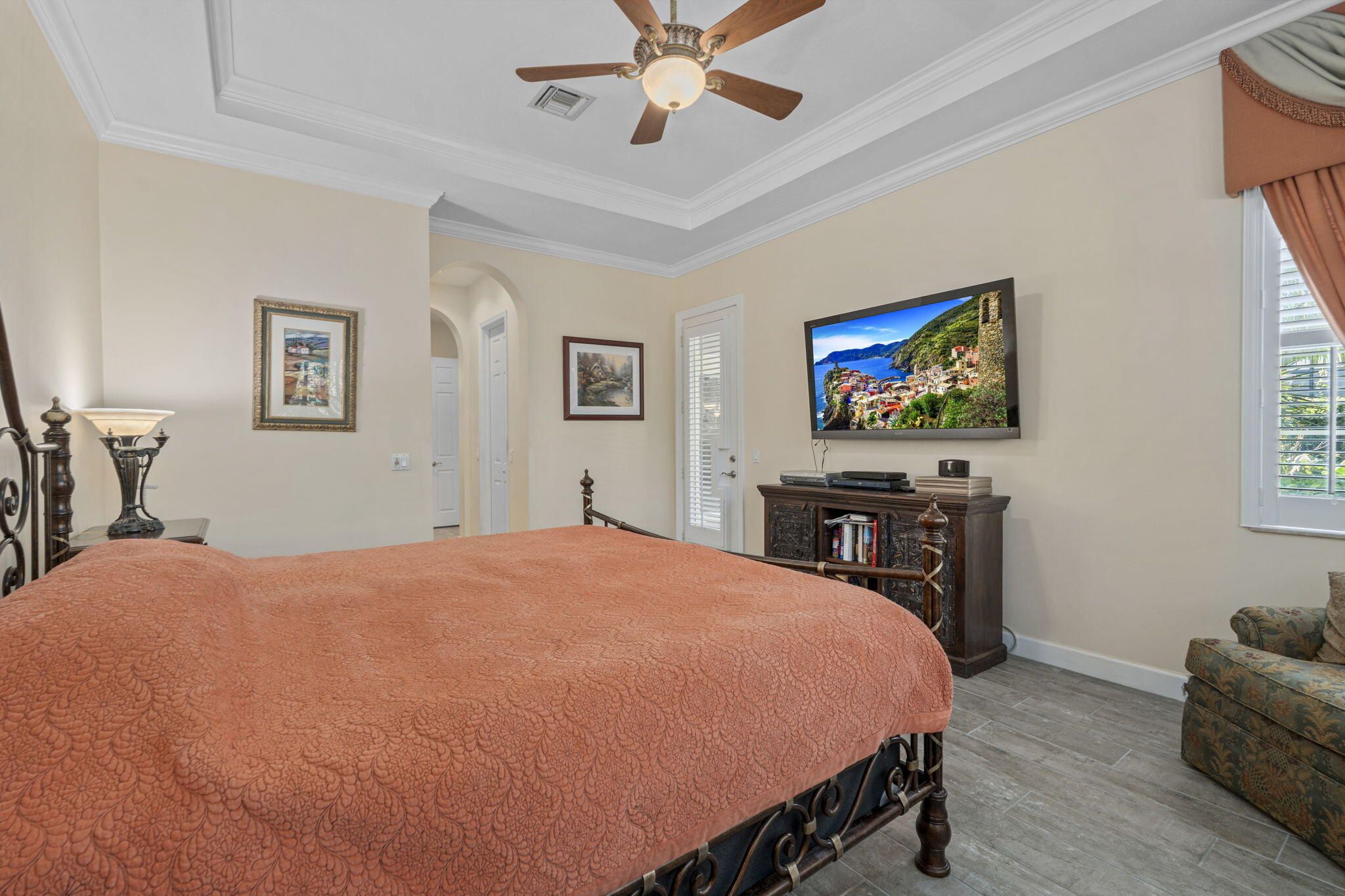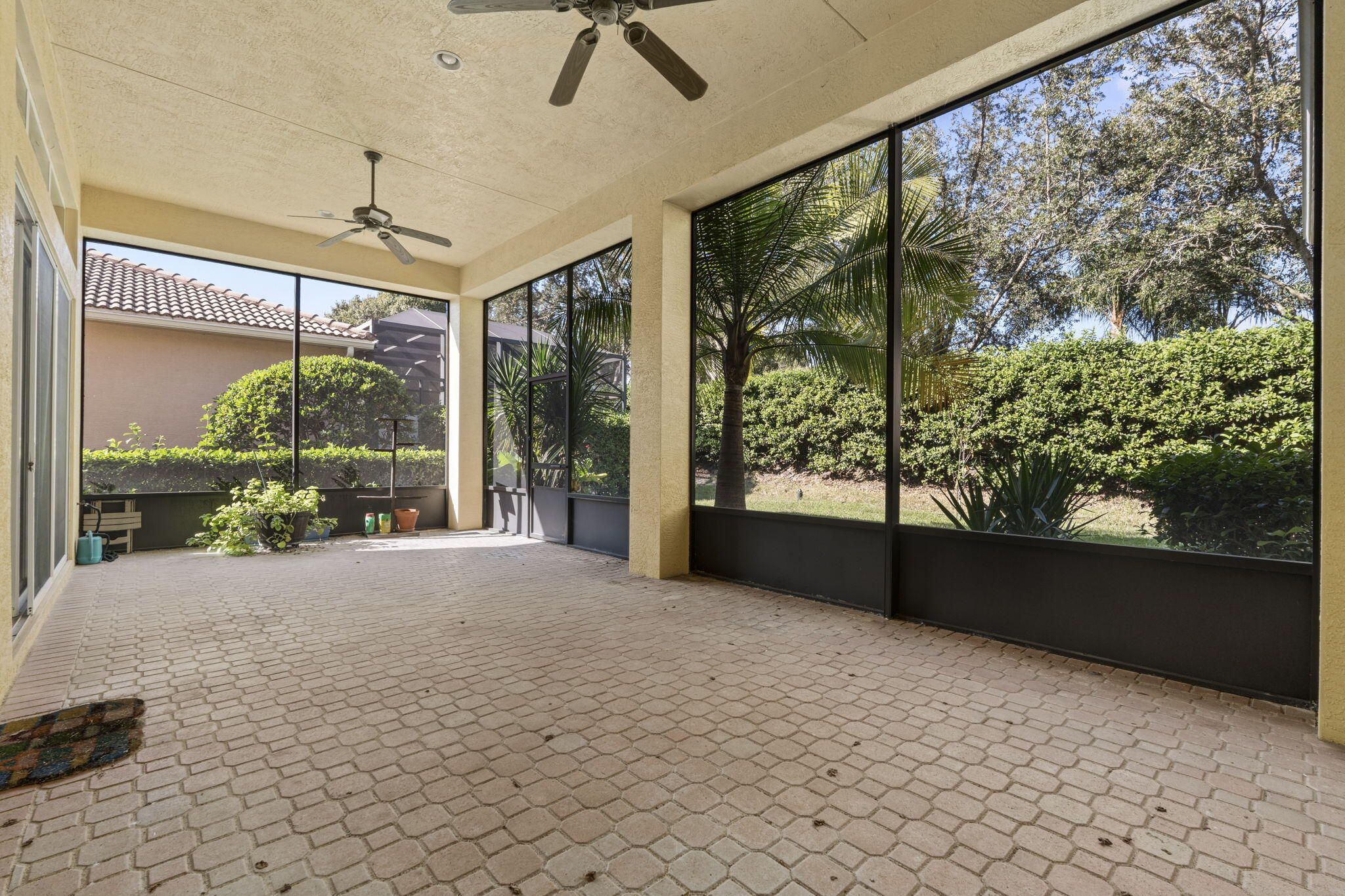 Welcome to this beautifully appointed 3-bedroom, 2-bath home located in the prestigious PGA Verano gated community. Nestled on a quiet cul-de-sac with a circular driveway and sprinkler system, this residence offers both curb appeal and convenience. This home offers a gated courtyard entry, 12-foot ceilings, elegant crown molding, and a thoughtfully designed open floor plan. The chef's kitchen boasts granite countertops, a stylish backsplash, and ample cabinetry. The master suite features tray ceilings, his-and-her walk-in closets, and a spa-like en-suite complete with a soaking tub, dual vanities, and a walk-in shower. Extend your living space outdoors with a massive screened-in patio surrounded by greenery--ideal for morning coffee, evening gatherings, or