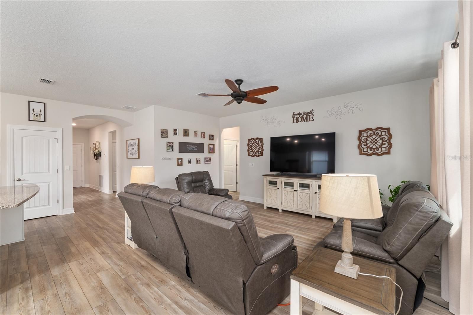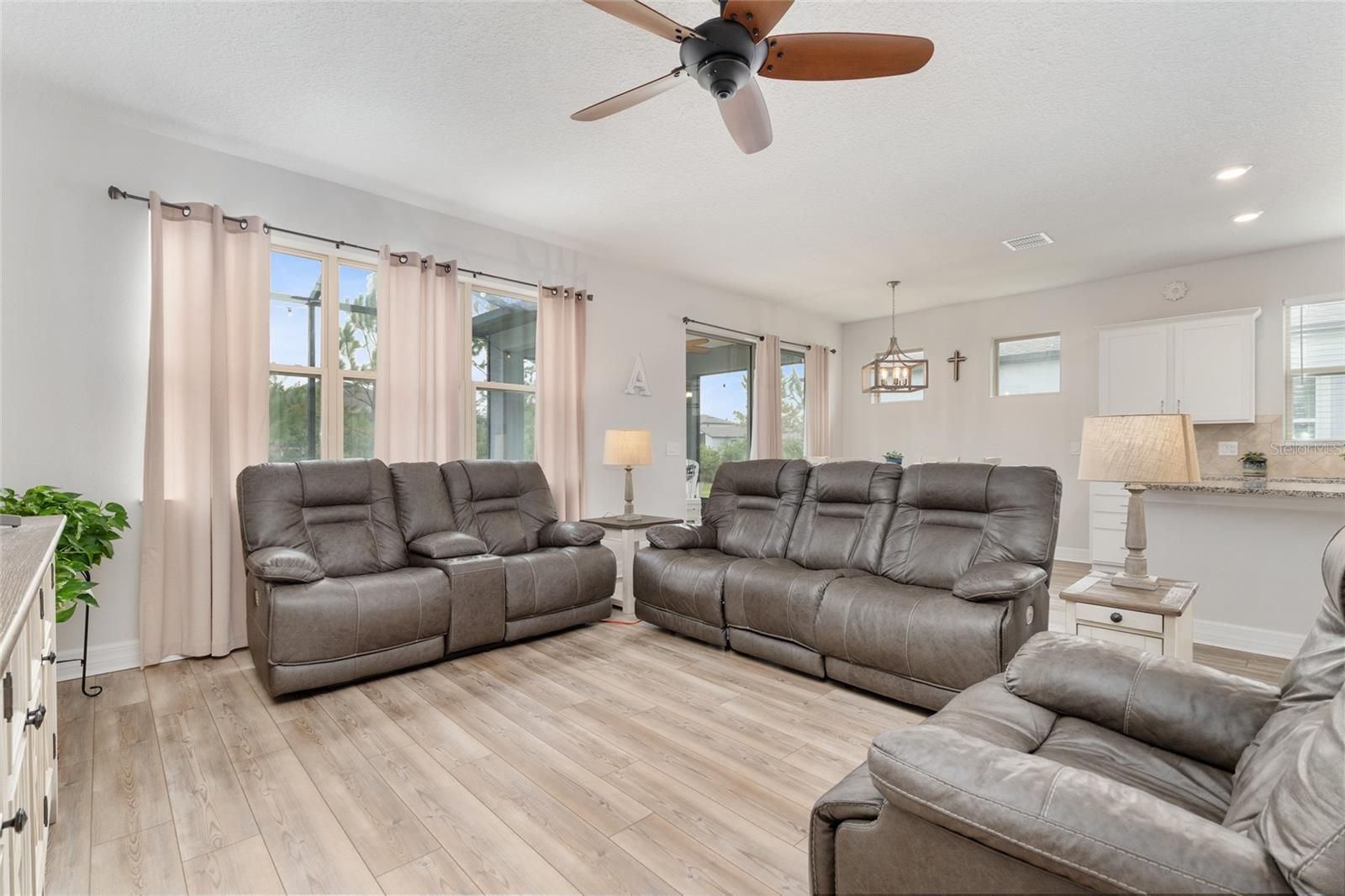 - Kitchen/Family Room Combo, Solid-Wood Cabinets, Window Treatments, Ceiling Fan(s), Eat-in Kitchen, High Ceilings, Main Level Primary, Open Floorplan, Solid Surface Counters, Split Bedrooms, Stone Counters, Thermostat, Walk-In Closet(s)