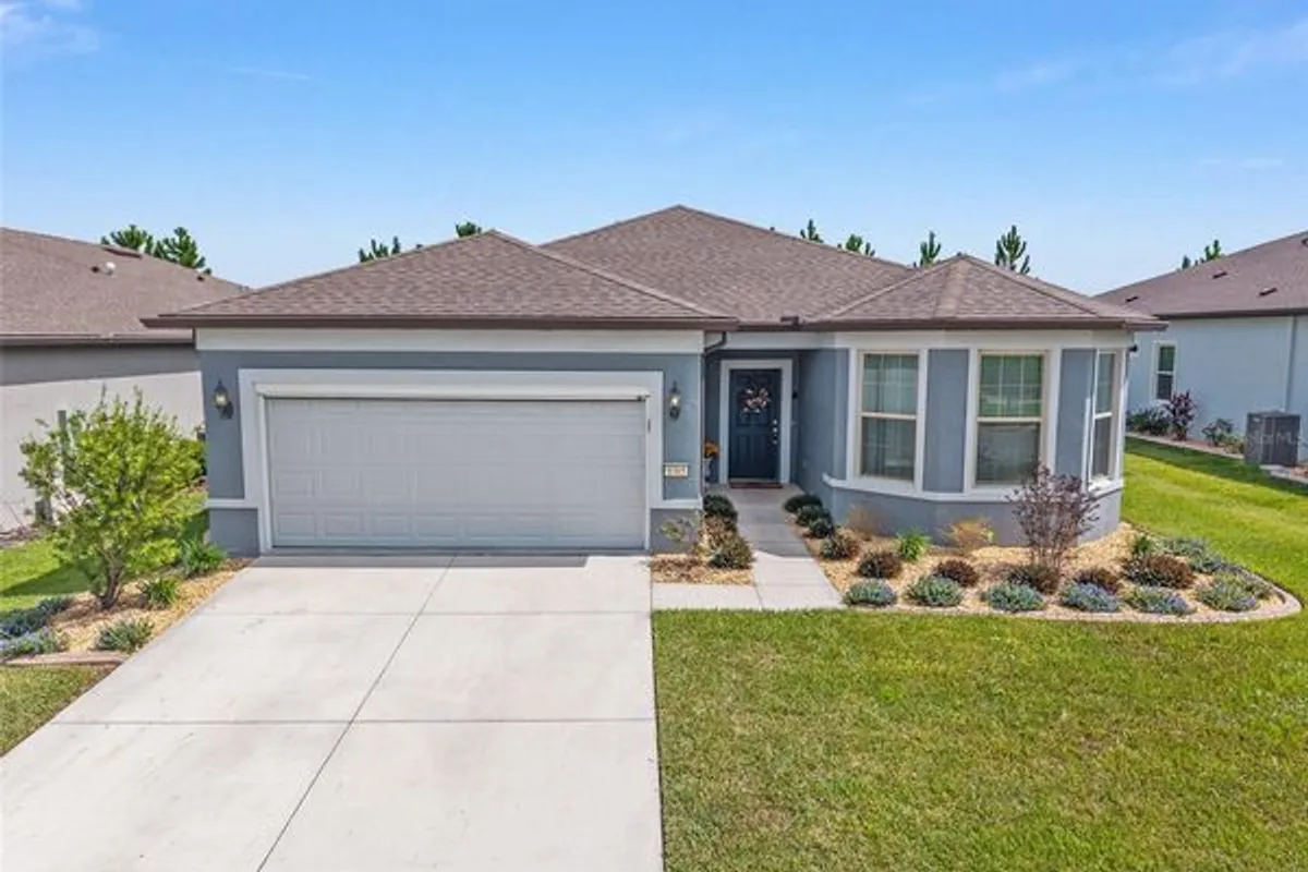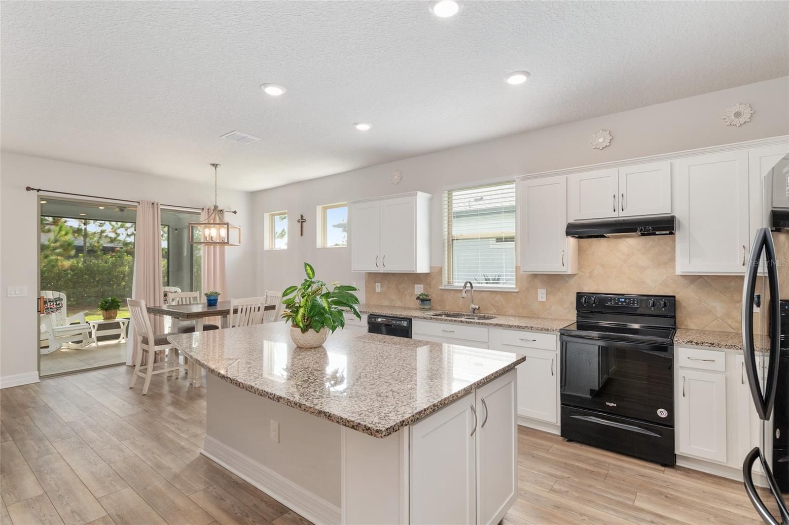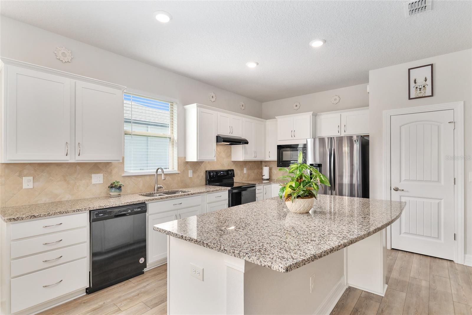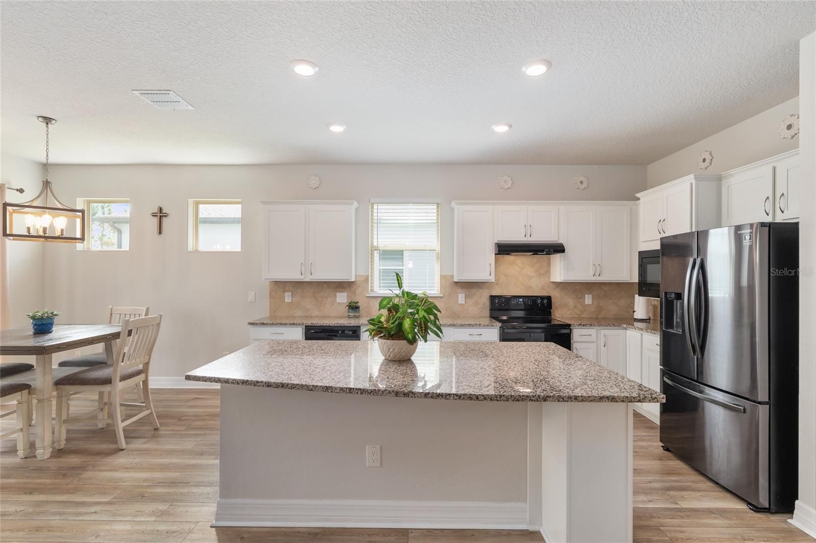 Welcome to this move-in ready 2020 Abbeyville model in Stone Creek! This 2-bed, 2 bath home with a flex room offers an open airy layout perfect for every day living. The eat-in kitchen showcases a granite island, white cabinets, tiled backsplash and two pantries -a walk-in pantry plus an additional one for extra storage- perfect for cooking and entertaining. Vinyl plank flooring flows seamlessly throughout the home. The owner’s suite features a walk-in closet, dual sinks, a walk-in shower and build-in bench. Guest will enjoy their private suite and second bath located separately, providing comfort and privacy. Upgrades include a screened lanai, 4’ garage extension with built-in shelves, whole house water filter, laundry room with washer and dryer, hybrid water heater, irrigation system, and a transferable 10-year limited structural warranty. Stone Creek is an active community offering an 18-hole championship golf course, full restaurant and bar, indoor and outdoor pools, tennis and pickleball courts, clubs, classes, and so much more—active living at its finest.