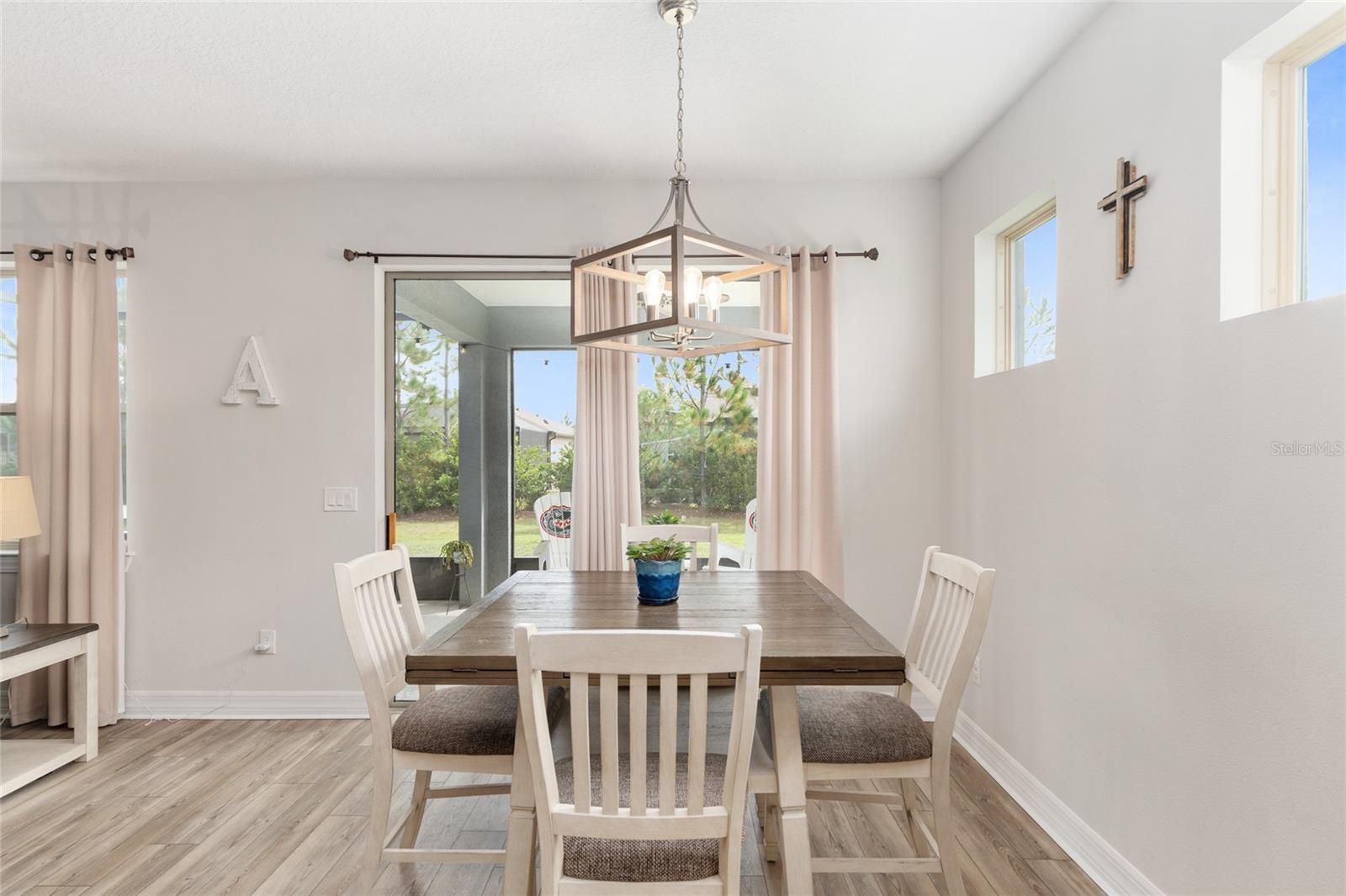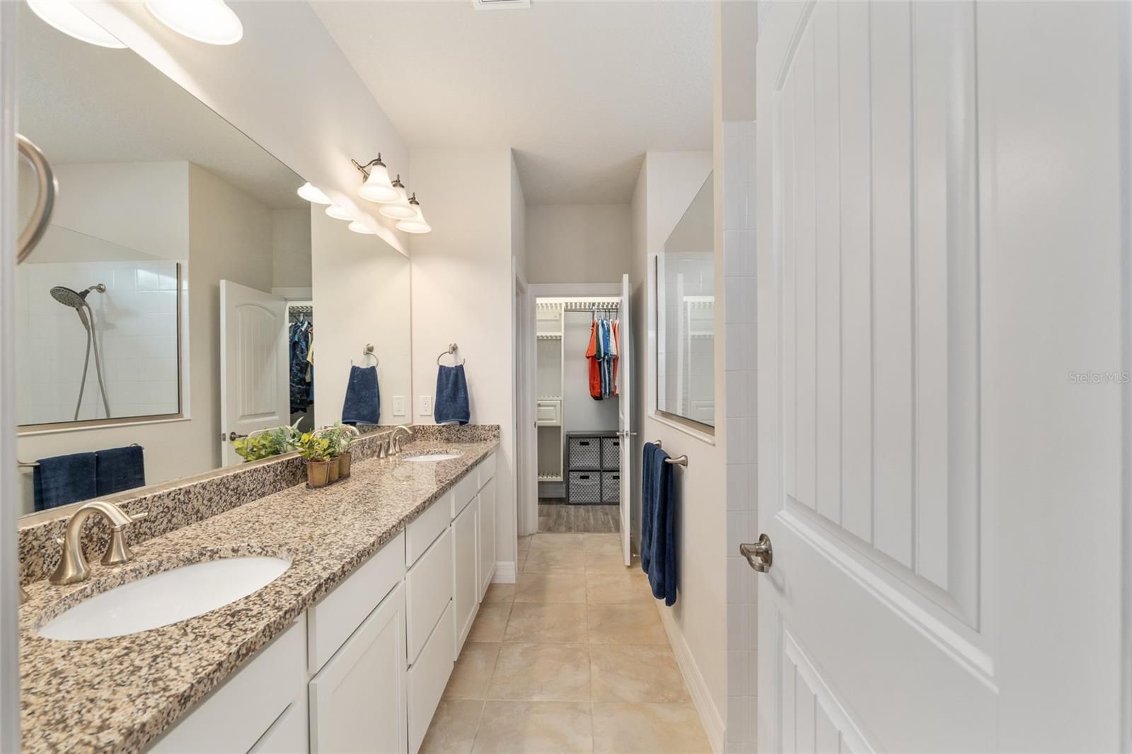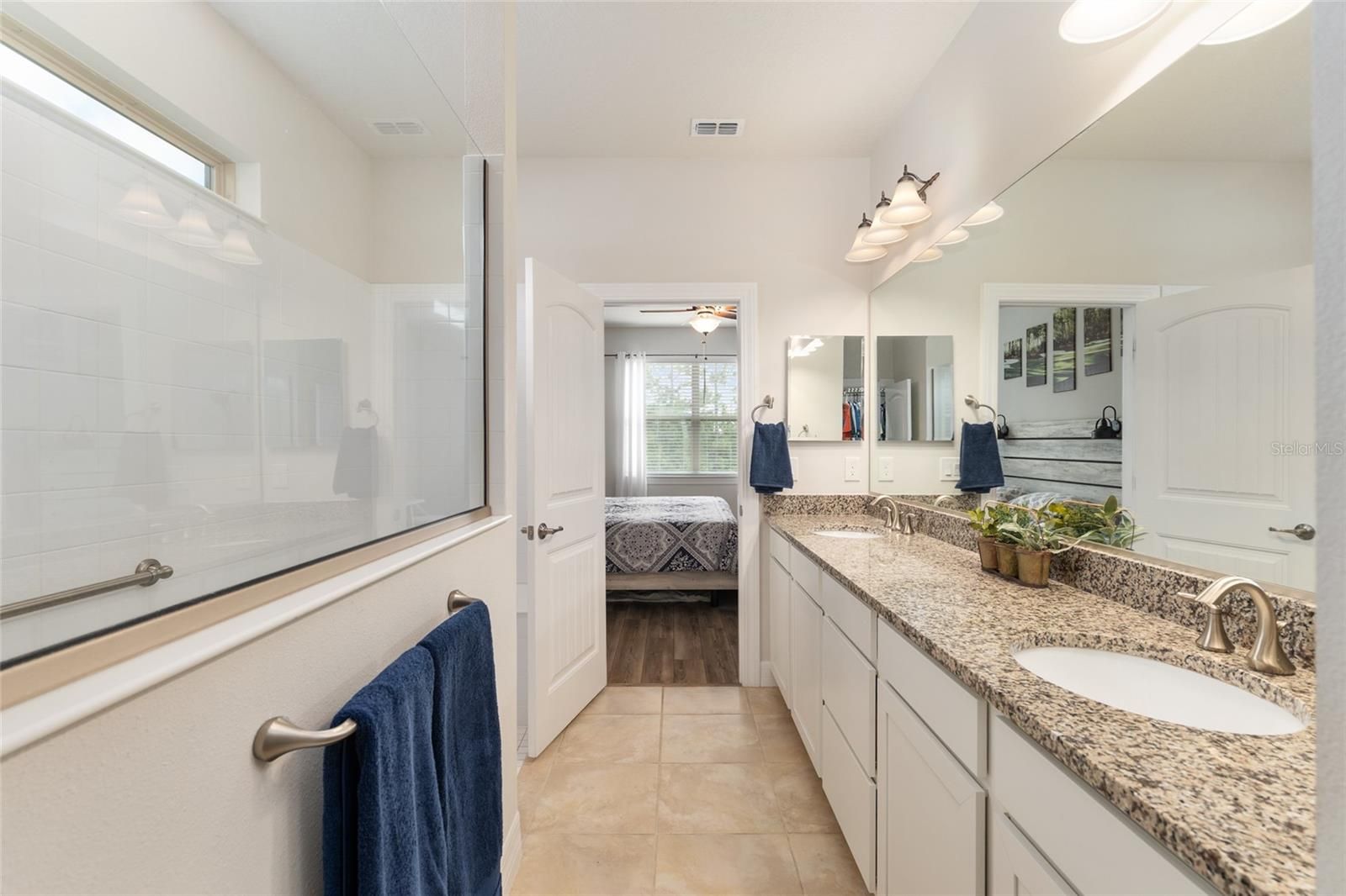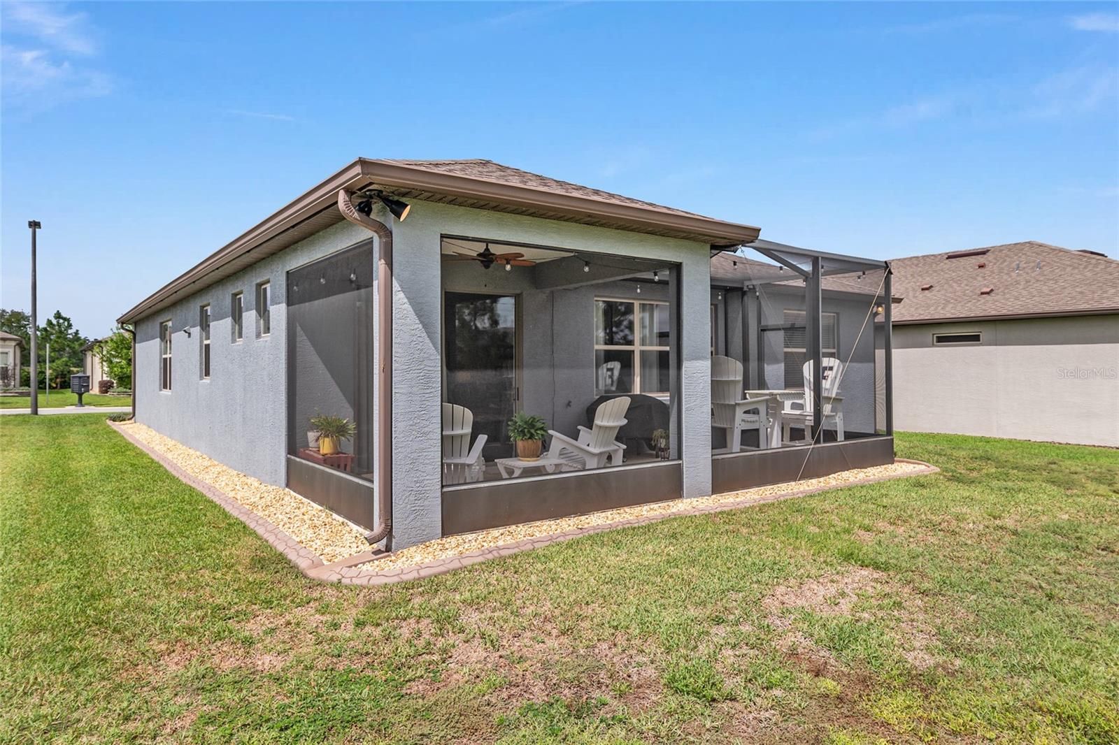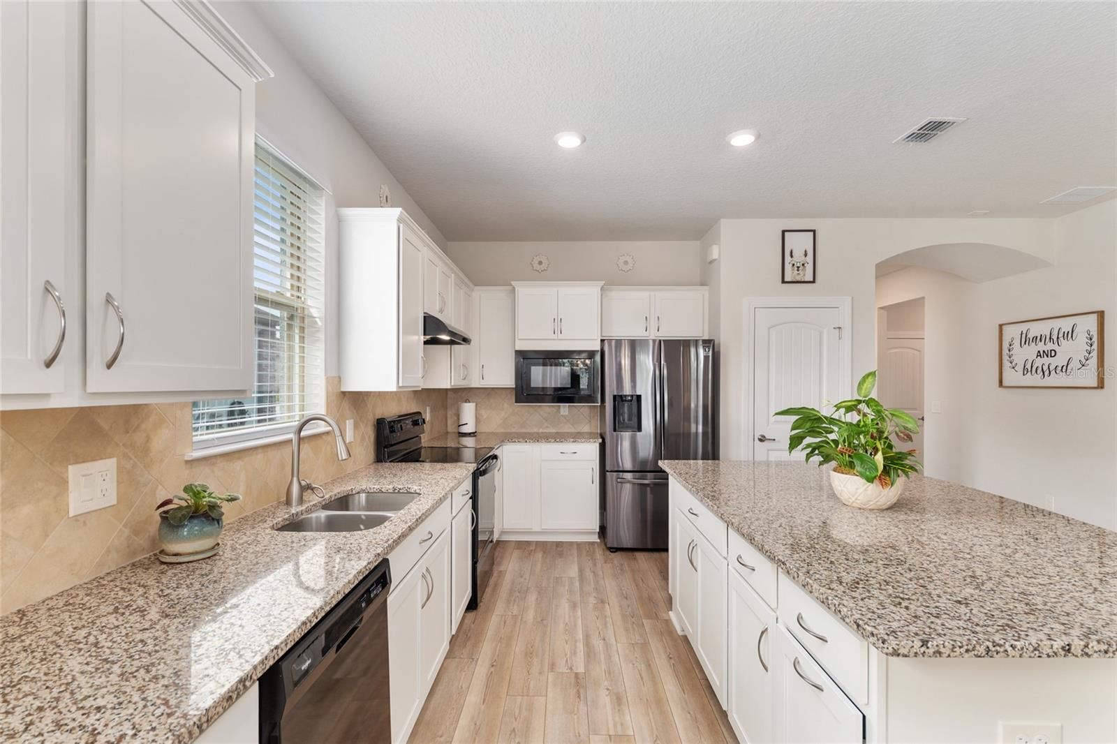 Welcome to this move-in ready 2020 Abbeyville model in Stone Creek! This 2-bed, 2 bath home with a flex room offers an open airy layout perfect for every day living. The eat-in kitchen showcases a granite island, white cabinets, tiled backsplash and two pantries -a walk-in pantry plus an additional one for extra storage- perfect for cooking and entertaining. Vinyl plank flooring flows seamlessly throughout the home. The owner’s suite features a walk-in closet, dual sinks, a walk-in shower and build-in bench. Guest will enjoy their private suite and second bath located separately, providing comfort and privacy. Upgrades include a screened lanai, 4’ garage extension with built-in shelves, whole house water filter, laundry room with washer and dryer, hybrid water heater, irrigation system, and a transferable 10-year limited structural warranty. Stone Creek is an active community offering an 18-hole championship golf course, full restaurant and bar, indoor and outdoor pools, tennis and pickleball courts, clubs, classes, and so much more—active living at its finest.