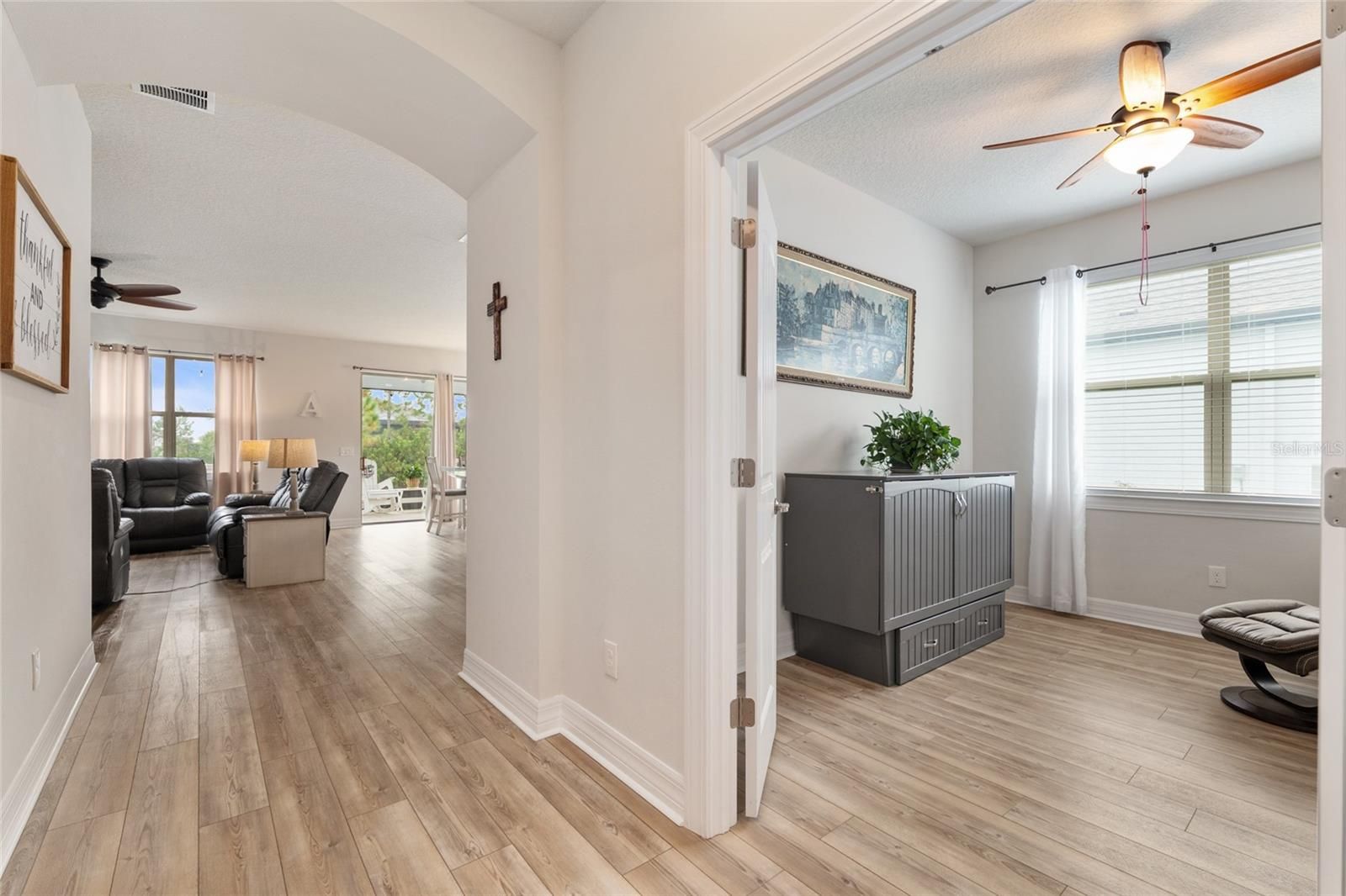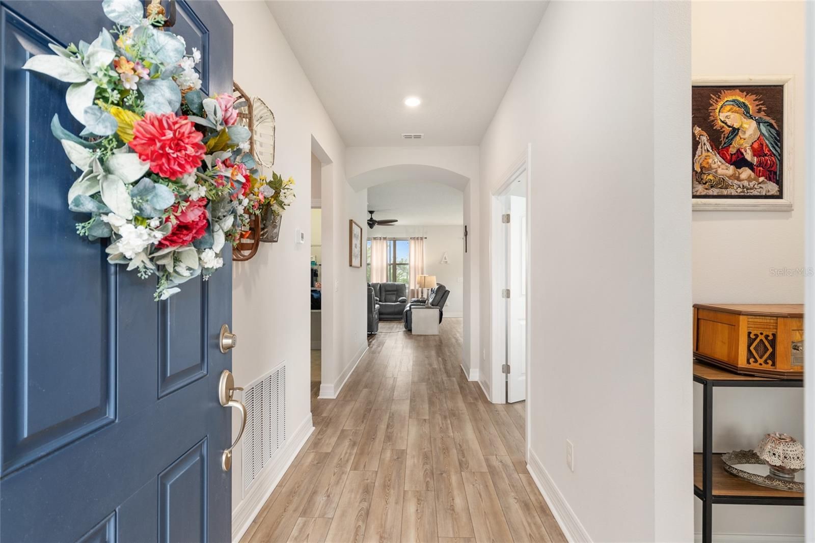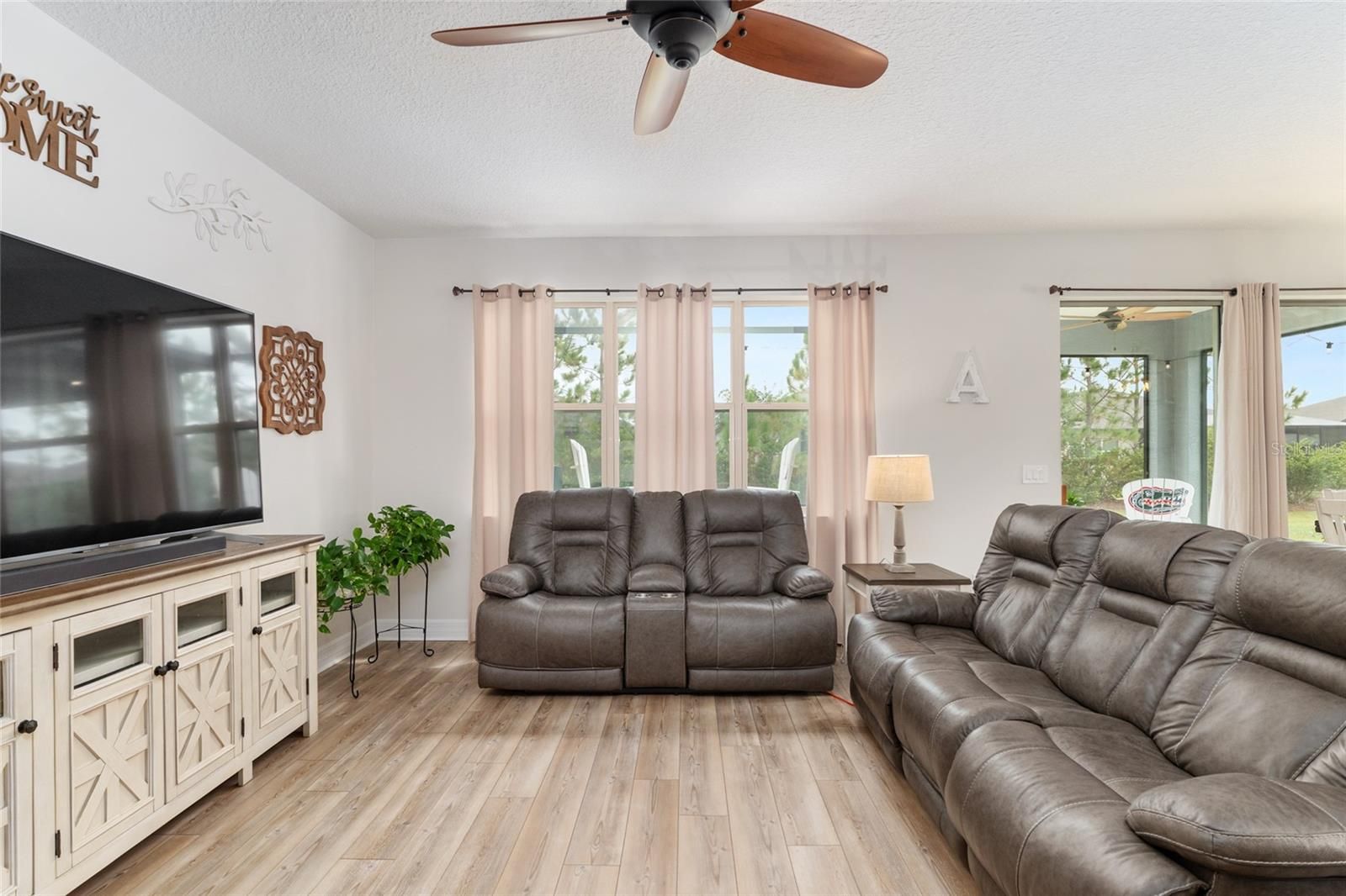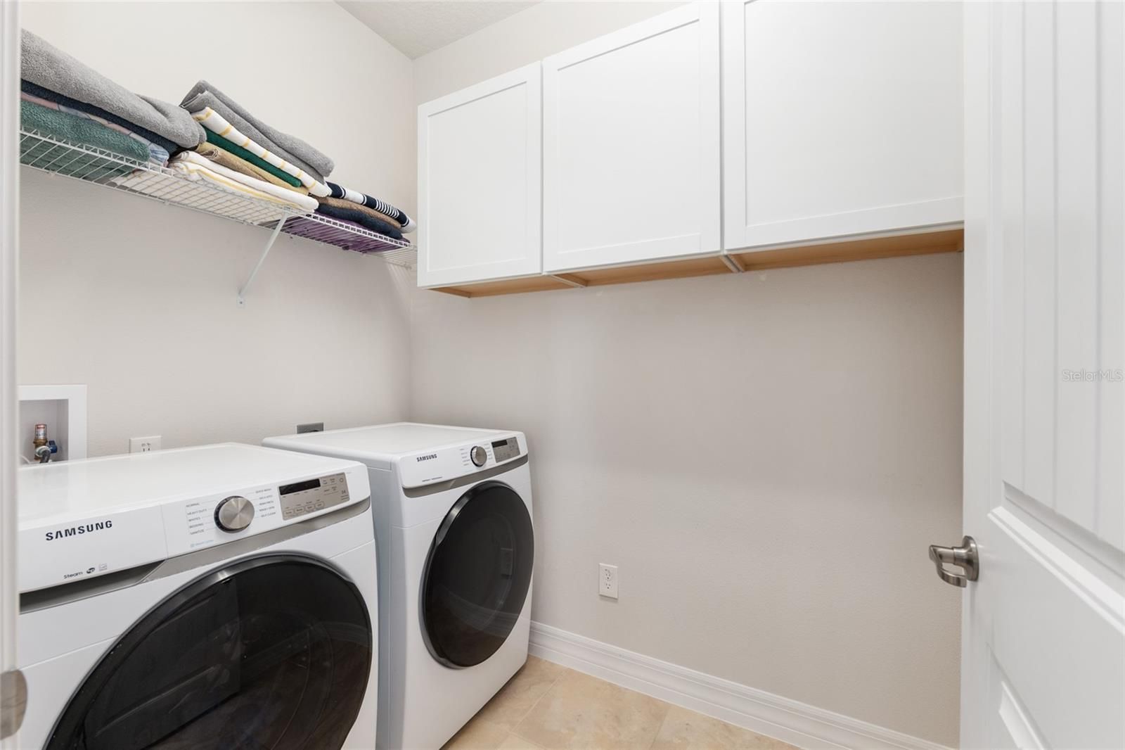 Welcome to this move-in ready 2020 Abbeyville model in Stone Creek! This 2-bed, 2 bath home with a flex room offers an open airy layout perfect for every day living. The eat-in kitchen showcases a granite island, white cabinets, tiled backsplash and two pantries -a walk-in pantry plus an additional one for extra storage- perfect for cooking and entertaining. Vinyl plank flooring flows seamlessly throughout the home. The owner’s suite features a walk-in closet, dual sinks, a walk-in shower and build-in bench. Guest will enjoy their private suite and second bath located separately, providing comfort and privacy. Upgrades include a screened lanai, 4’ garage extension with built-in shelves, whole house water filter, laundry room with washer and dryer, hybrid water heater, irrigation system, and a transferable 10-year limited structural warranty. Stone Creek is an active community offering an 18-hole championship golf course, full restaurant and bar, indoor and outdoor pools, tennis and pickleball courts, clubs, classes, and so much more—active living at its finest.