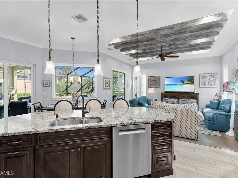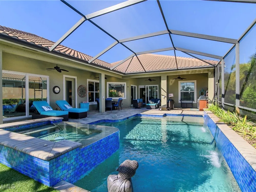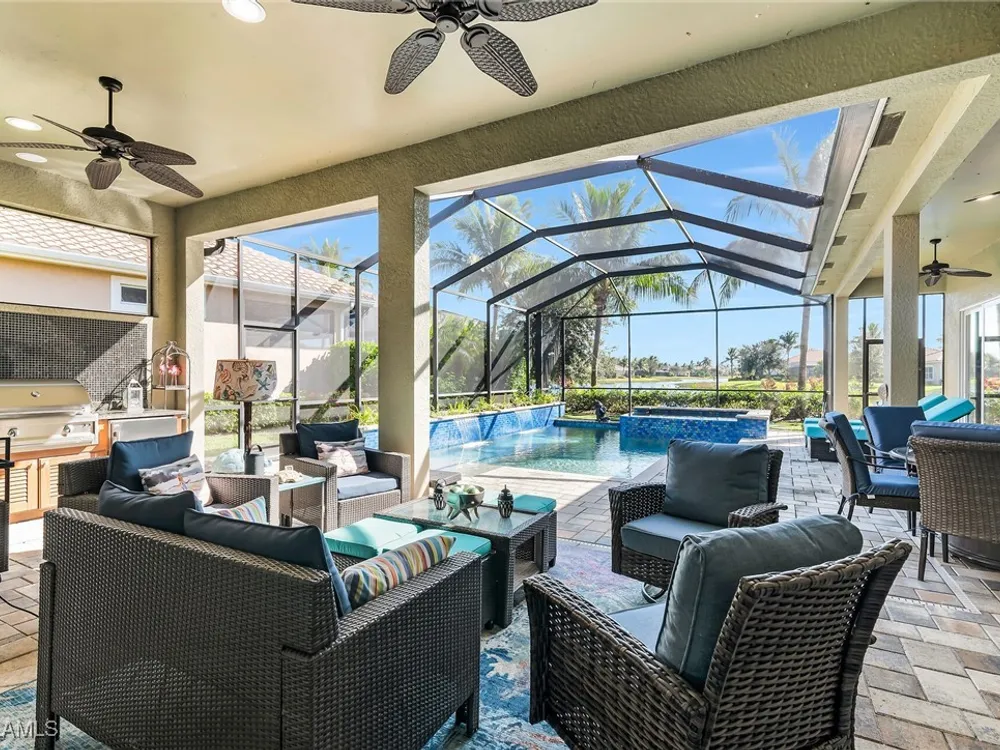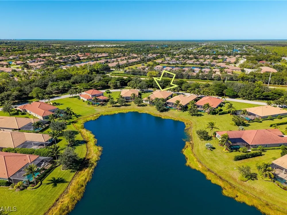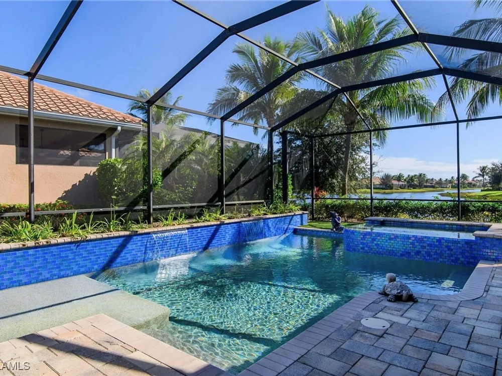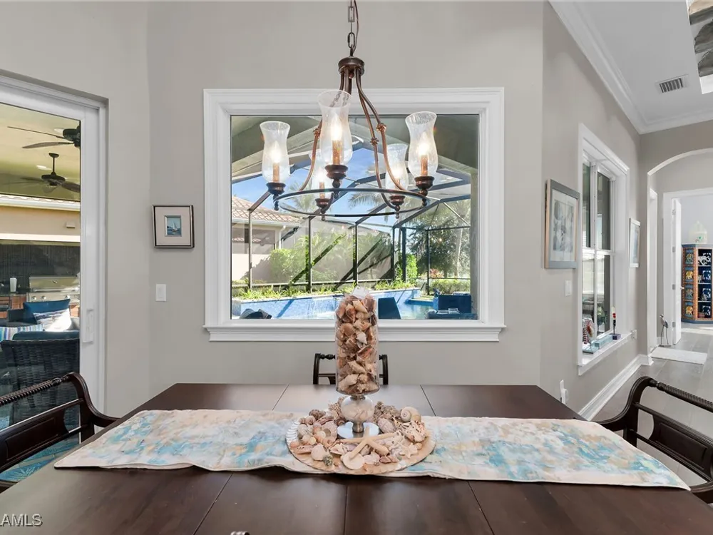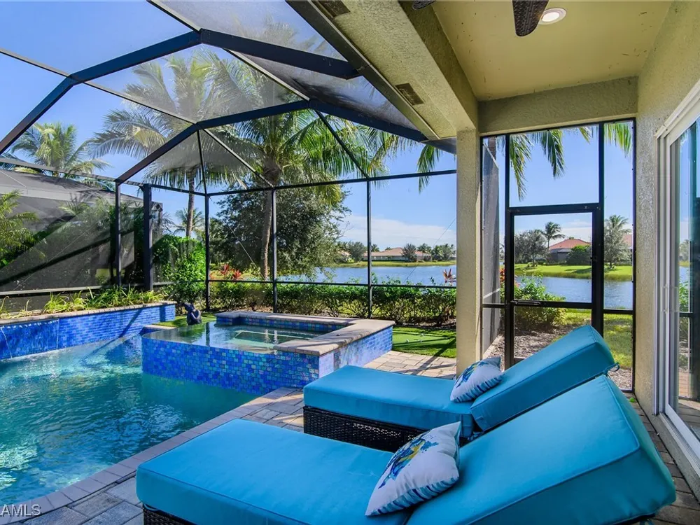 Experience luxurious waterfront living in this impeccably maintained home boasting a stunning long lake view in the sought-after Chiasso neighborhood of Fiddler’s Creek. Elegant details include coffered ceilings, crown molding, and decorative niches, complemented by impact-resistant windows and sliders throughout. At the heart of the home, the open-concept chef’s kitchen features new stainless steel appliances (2024), gas cooking, granite countertops, solid wood cabinetry, a butler’s pantry, a dry bar with custom wine shelving, and a spacious island ideal for entertaining. The split-bedroom layout ensures privacy, with the primary suite offering a jetted tub, a walk-in shower with multiple shower heads and massaging jets, and two guest ensuites—one showcasing four built-in, extra-length bunk beds. A versatile den with an adjacent full bath can easily serve as a fourth bedroom. Recent 2025 upgrades include two high-efficiency Trane A/C units, a Navien tankless water heater, and recessed LED wafer lighting. The three-car garage provides ample storage and is plumbed for a water softener. Enjoy effortless indoor-outdoor living with a custom outdoor kitchen featuring a gas grill, alongside a private gas-heated saltwater pool with waterfalls, spa, sun shelf, irrigated planter, new antenna for the iAquaLink pool control system (2025), and updated pool tiles (2023). A putting green and extended screened lanai complete this tranquil retreat. Located in the award-winning, amenity-rich community of Fiddler’s Creek, residents enjoy optional golf, a resort-style clubhouse, multiple pools, a full-service spa, fitness center, walking and biking trails, tennis, pickleball, beach club access, and on-site casual and fine dining—all just minutes from Marco Island and downtown Naples.
